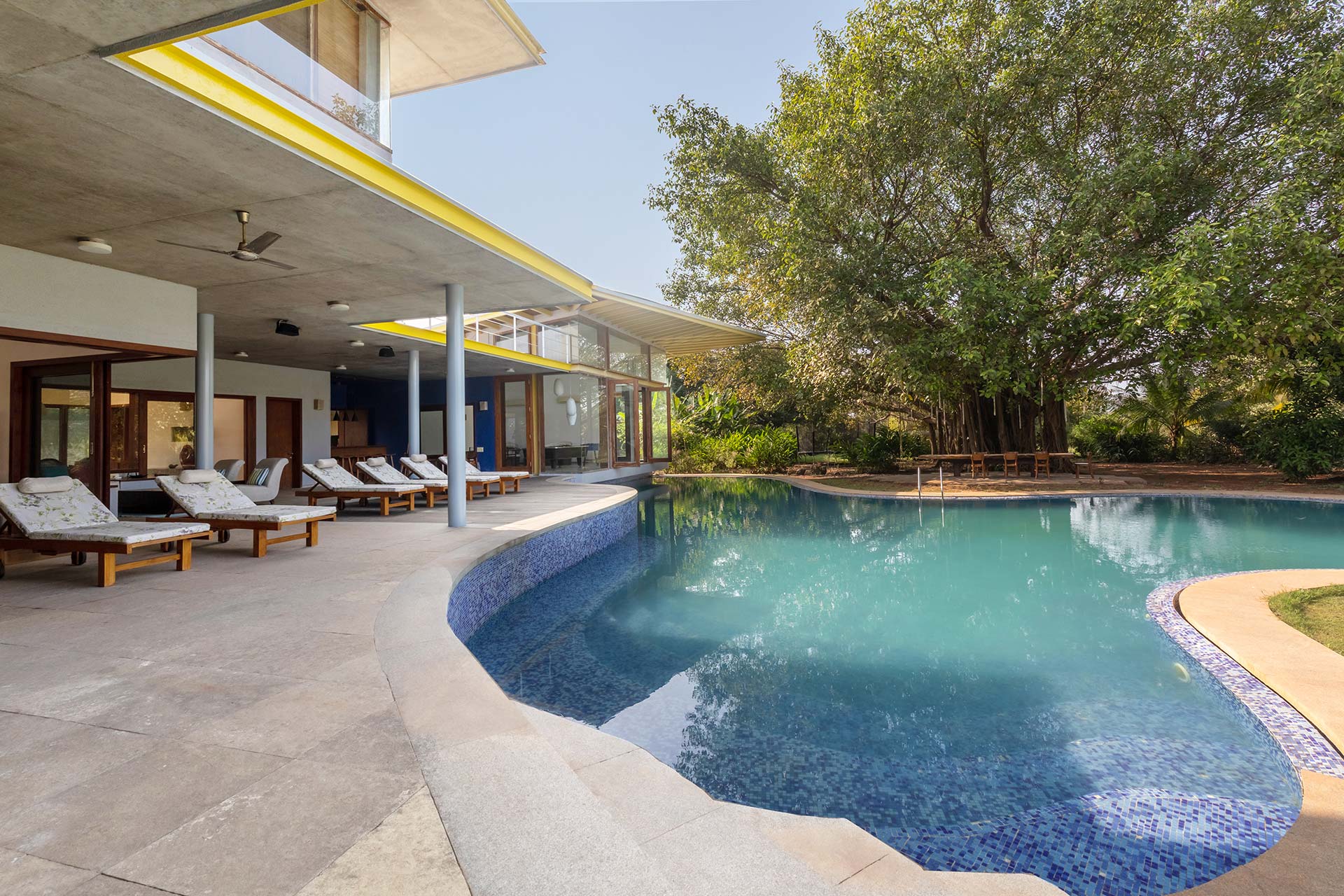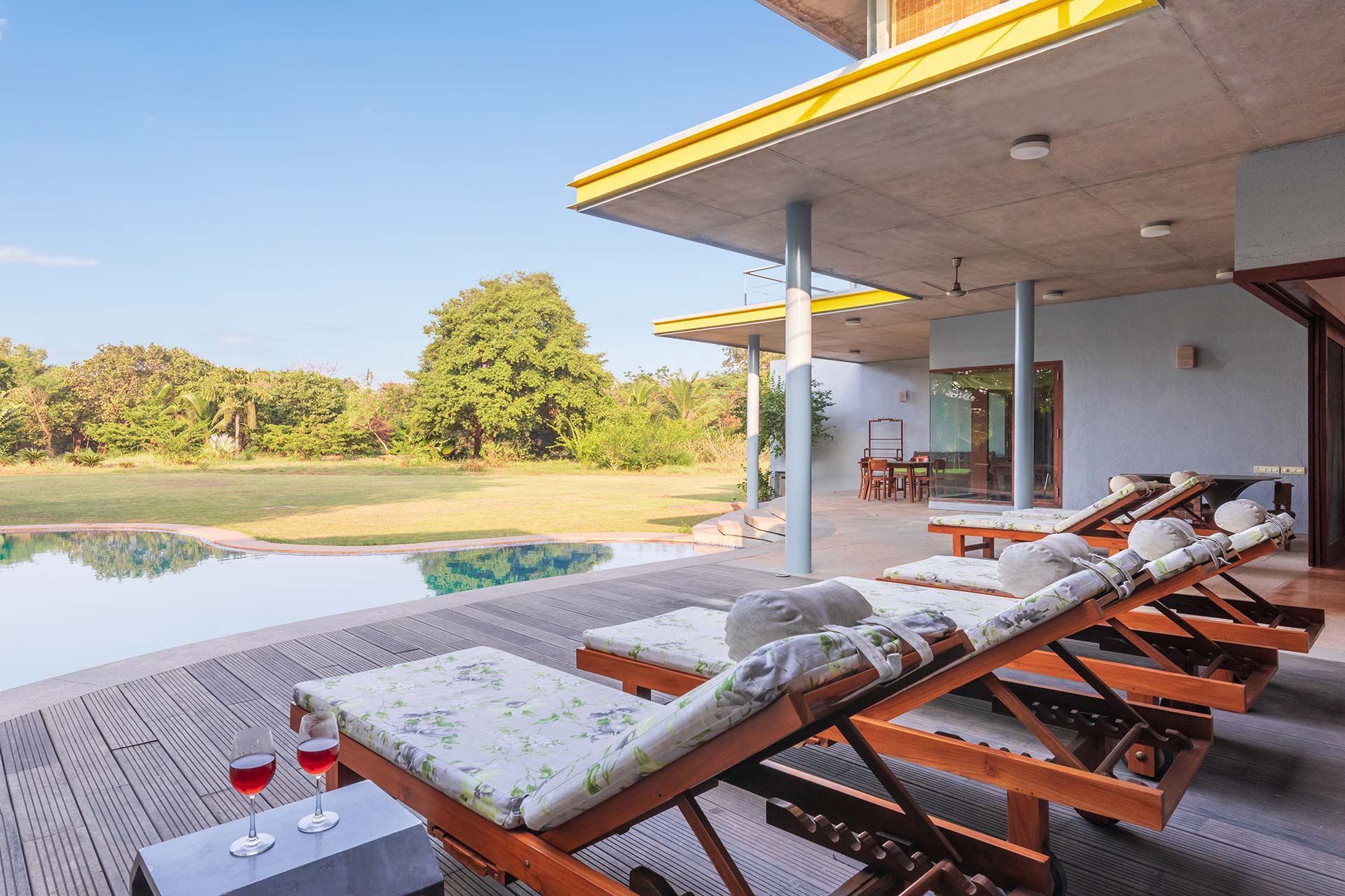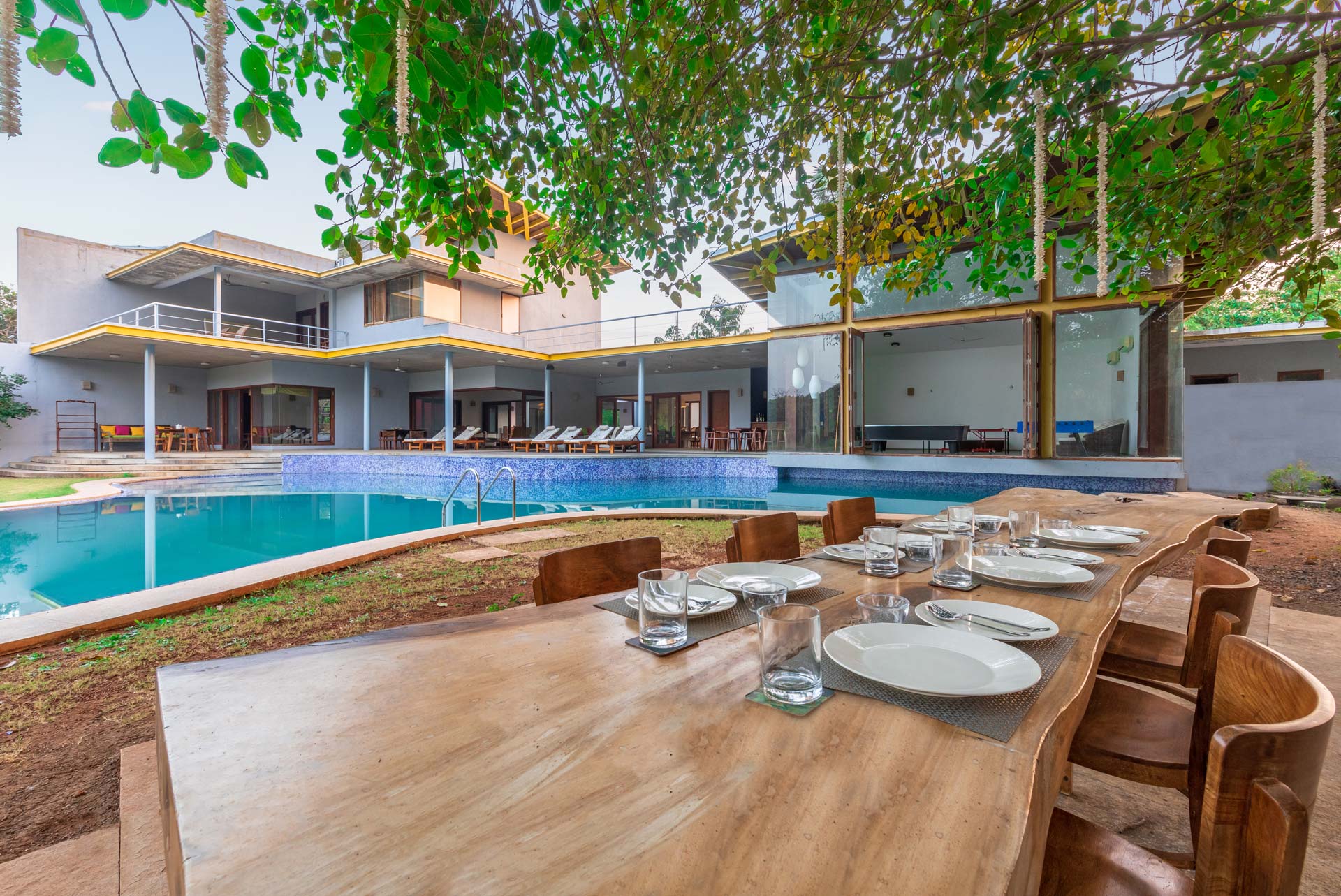 Beat the heat by taking a dip in the private outdoor swimming pool and get bewitched by beautiful view of the extensive lawn. Spend your evenings huddling around the bonfire while relishing a delicious barbecue supper. Munch on some grubs and sip away the refreshing cocktails as you rest by the exotic veranda, close to the pool and seating deck. As people can savour dining together both indoors and outside, the villa is ideal for large groups. There are many lounge-worthy areas across the large property. Your time here promises a box full of happy memories.
