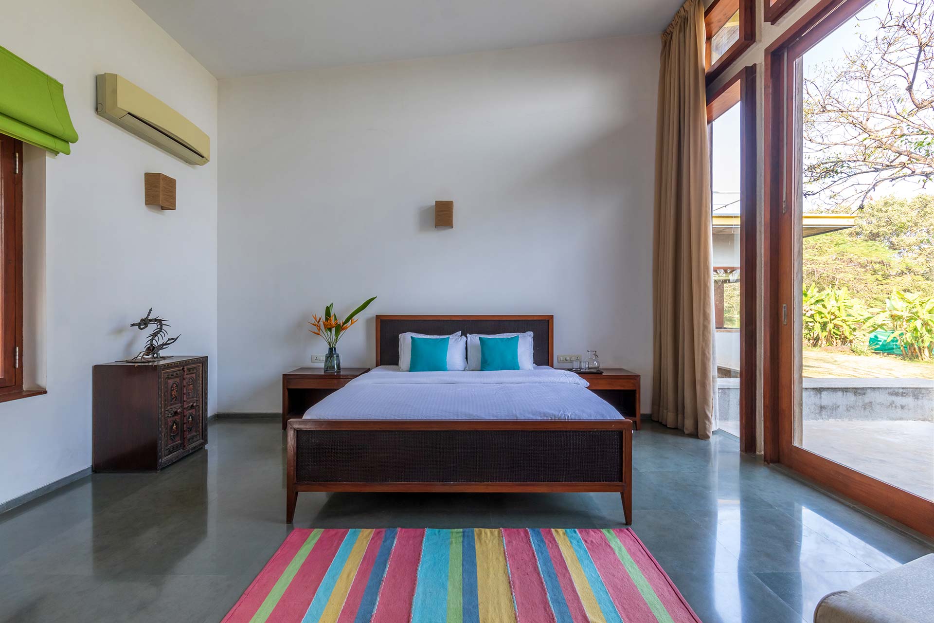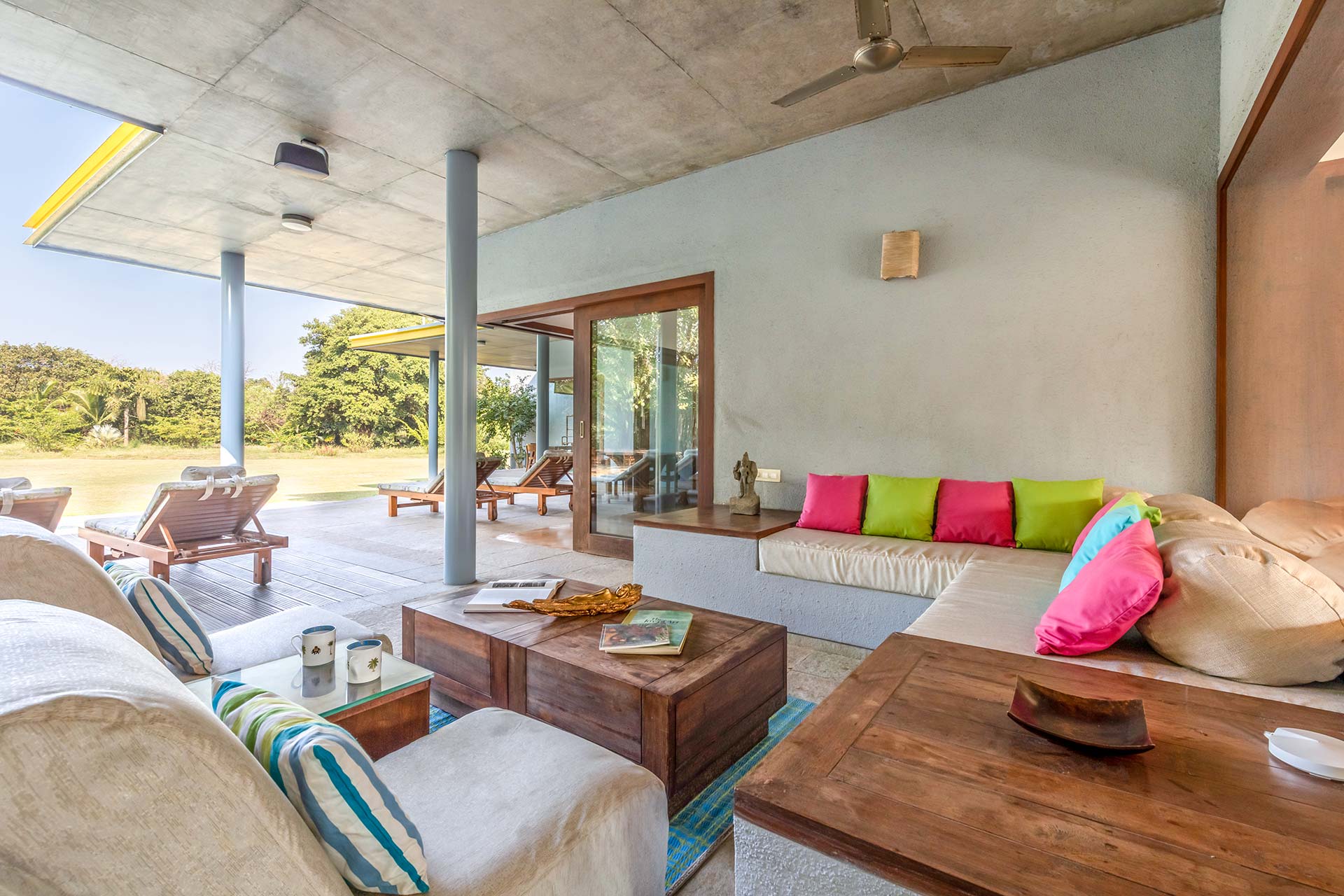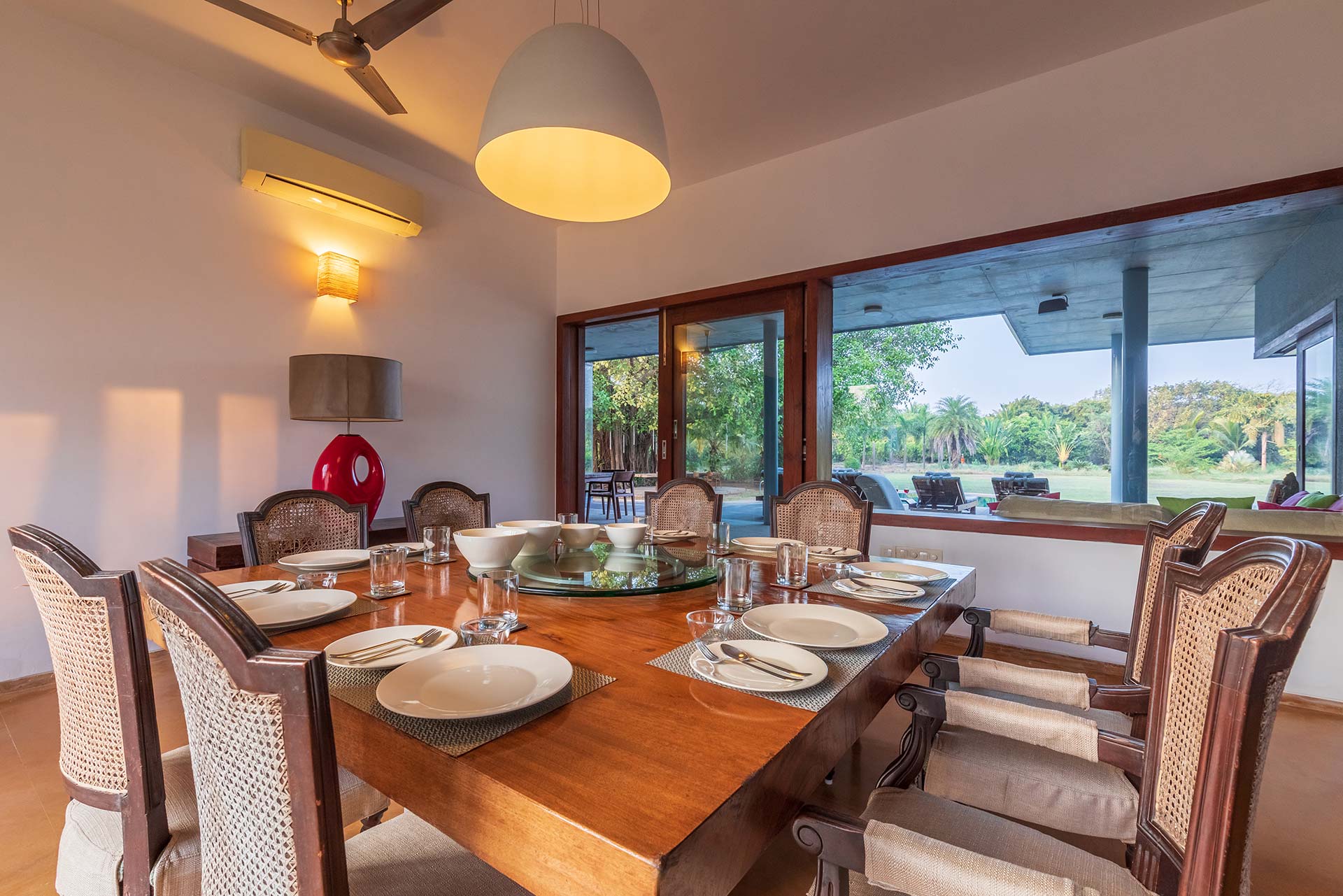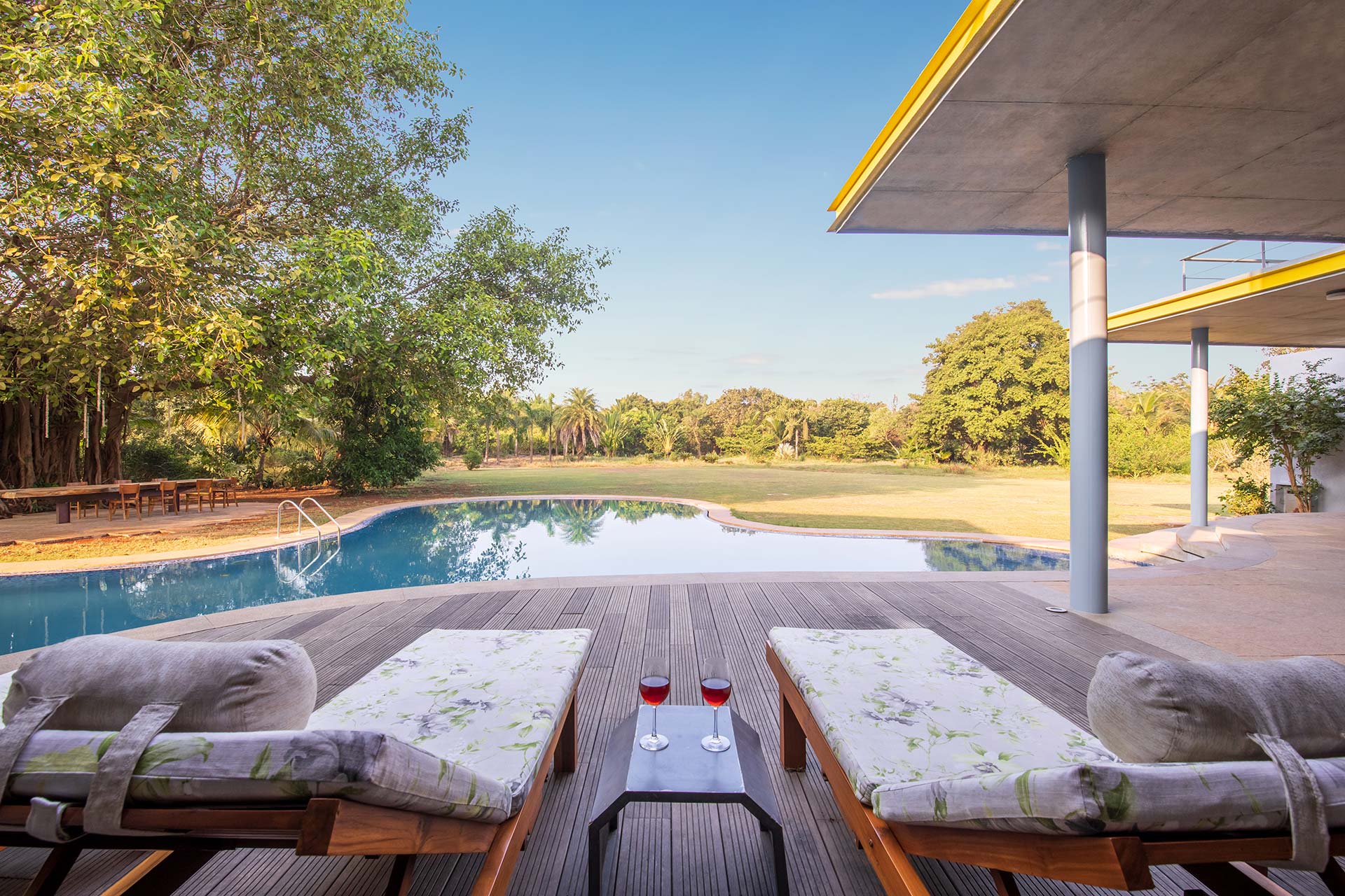 Beat the heat by taking a dip in the private outdoor swimming pool and get bewitched by beautiful view of the extensive lawn. Spend your evenings huddling around the bonfire while relishing a delicious barbecue supper. Munch on some grubs and sip away the refreshing cocktails as you rest by the exotic veranda, close to the pool and seating deck. As people can savour dining together both indoors and outside, the villa is ideal for large groups. There are many lounge-worthy areas across the large property. Your time here promises a box full of happy memories.