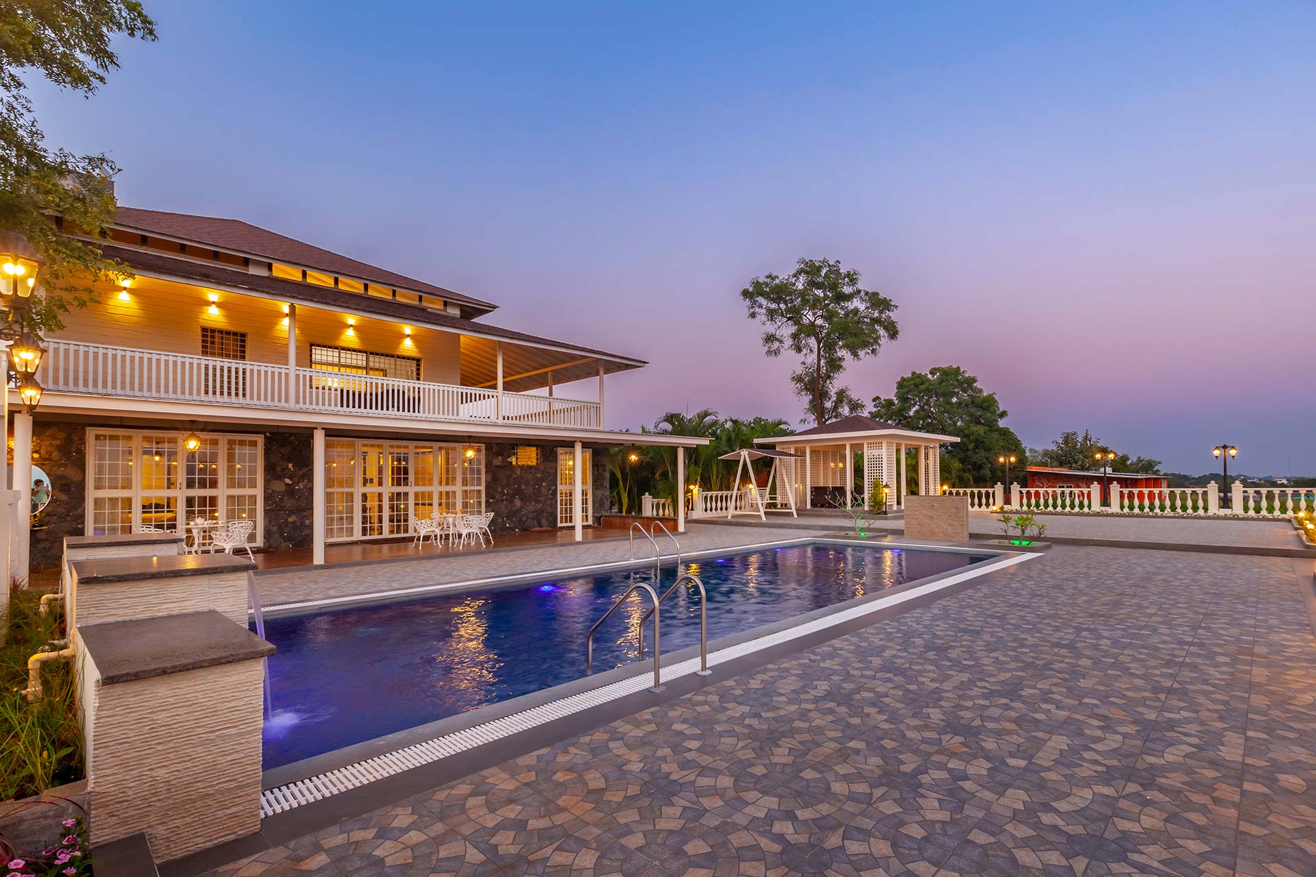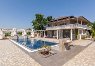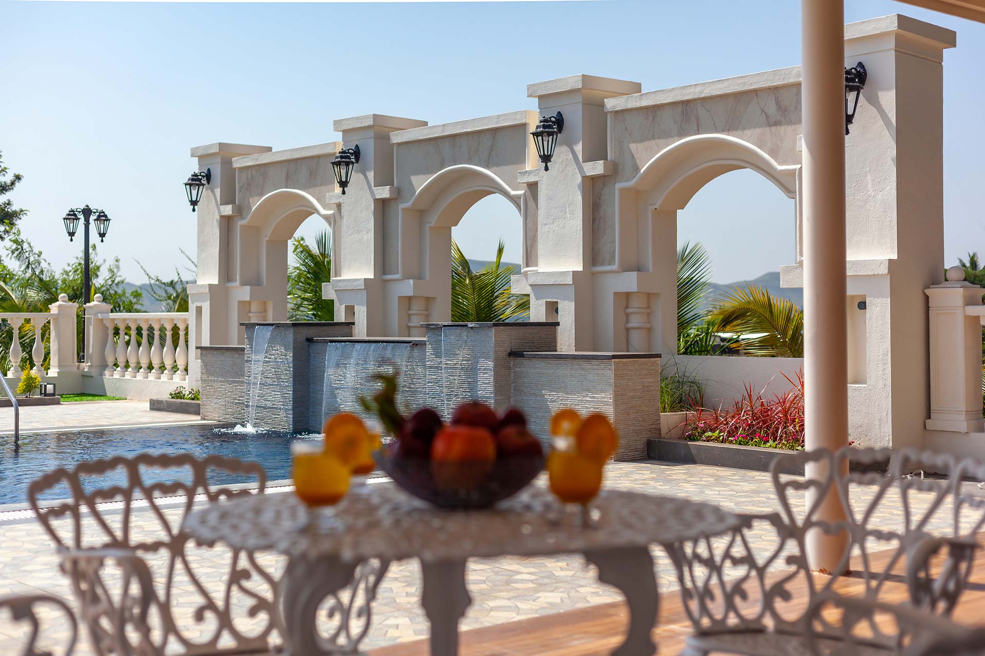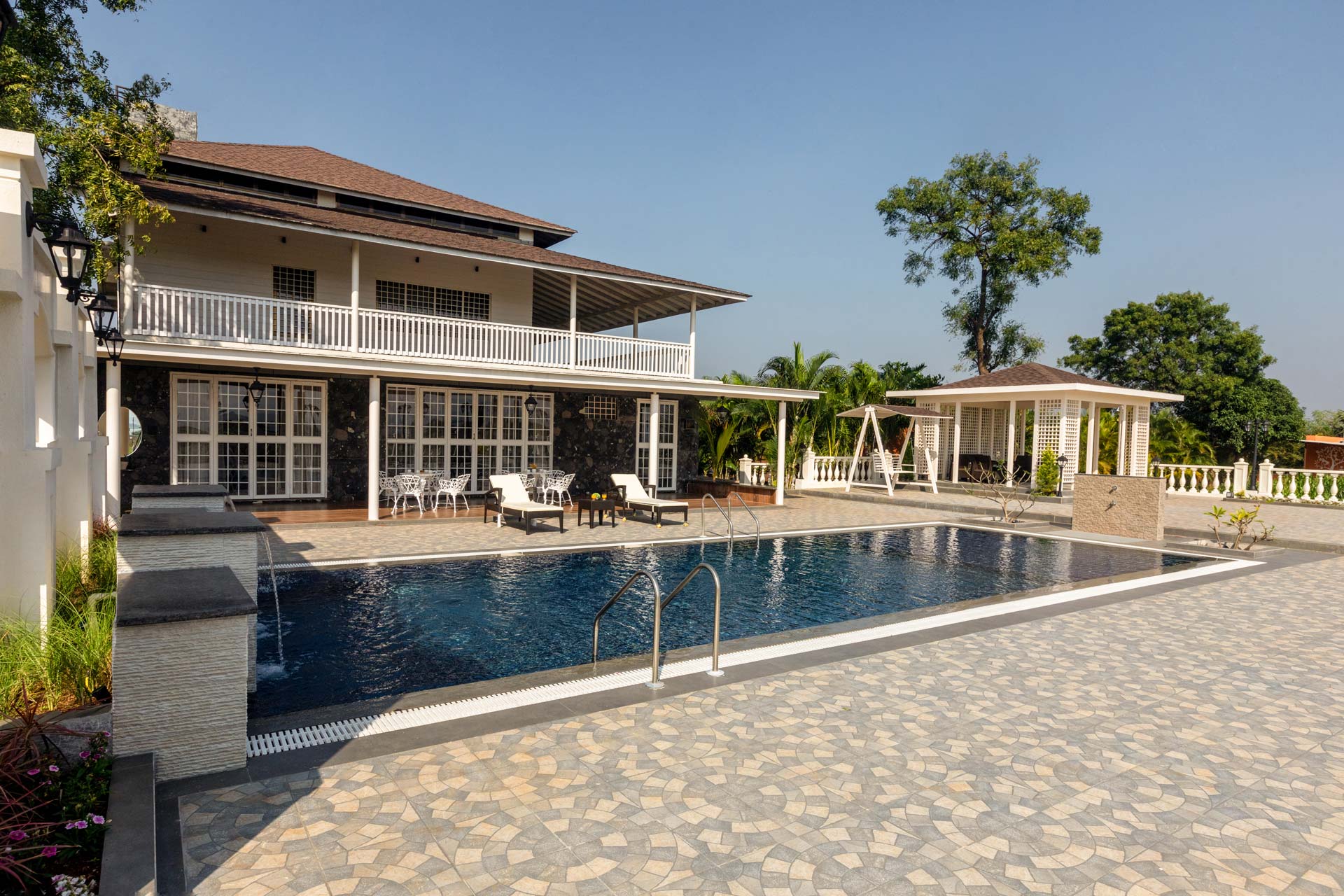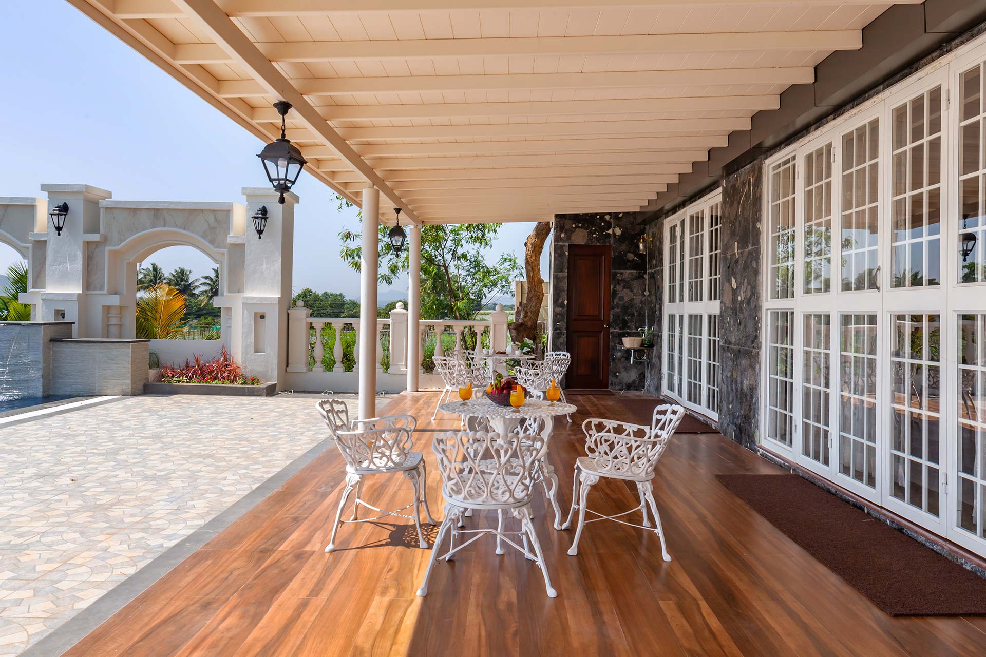 Behind the charming fountain-facade and opulent French windows, discover this elegant home oozing character in each nook & corner. The portico arches and wooden beams remain to blissfully space out the open-plan of this home, while the airy windows have been reimagined to deliver all the comforts of being one-on-one with nature. Lake La Vie is set by a mango farm, so don’t be surprised by the subtle revitalising whiff of fresh mango orchards. With the amount of greenery you’re surrounded by, strolling through the property with a nice brew in your hand is a peaceful way to start the day. You might then like to swim in the pool, again taking in the views, and soaking up the tranquil atmosphere – it’s hard to believe you’re so close to the main city of Nashik. Stroll into town for lunch at the local Misal Pav joint at Peruchi Wadi for a lip-smacking meal or explore Sula Wines, just a 25-minute drive from the home. When you head back from the vineyards, your first port of call has to be the deck area by the pool.