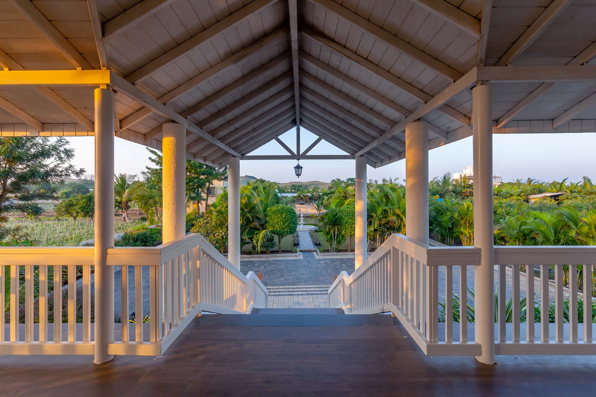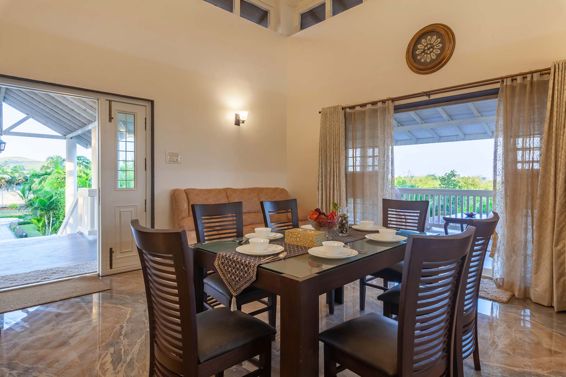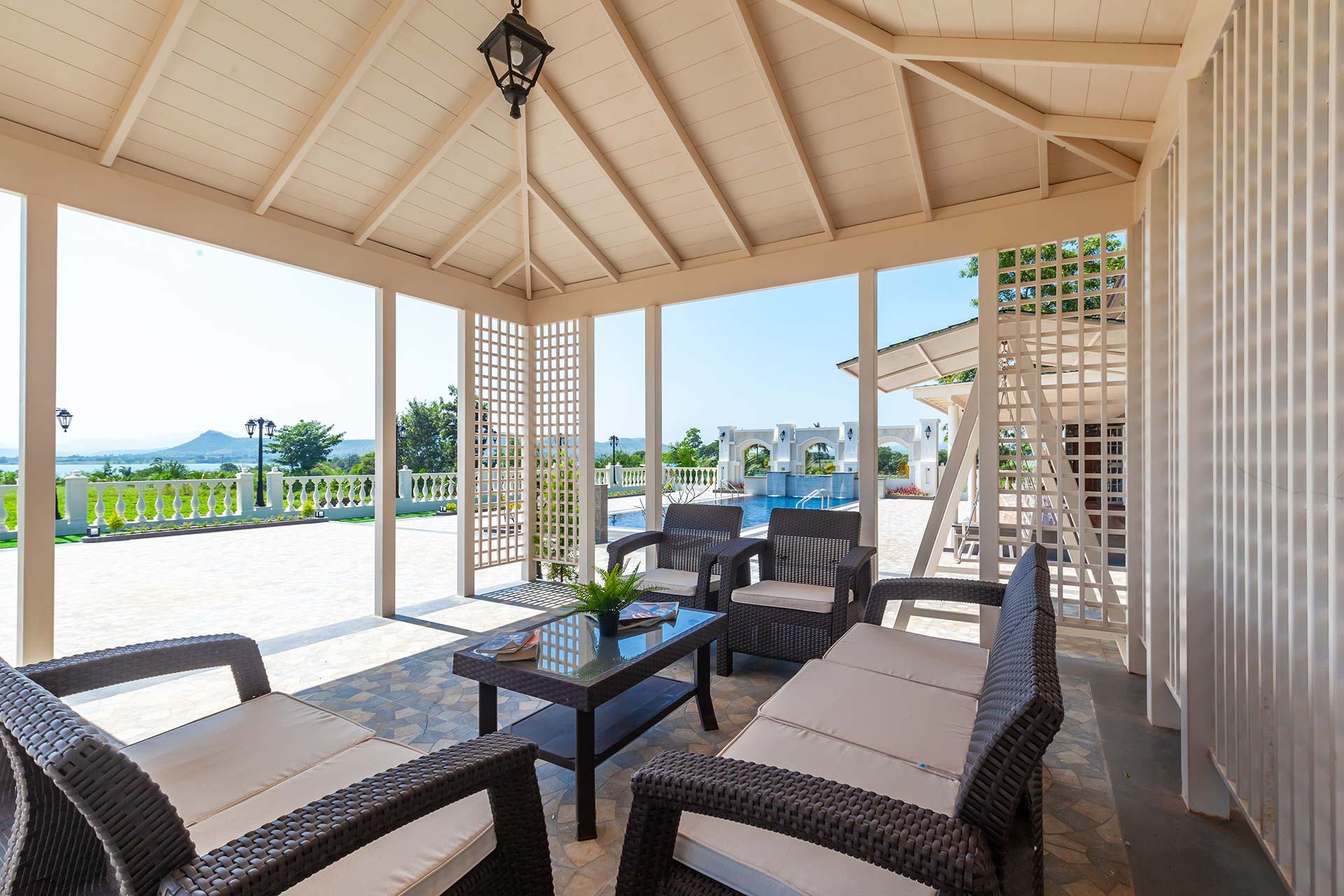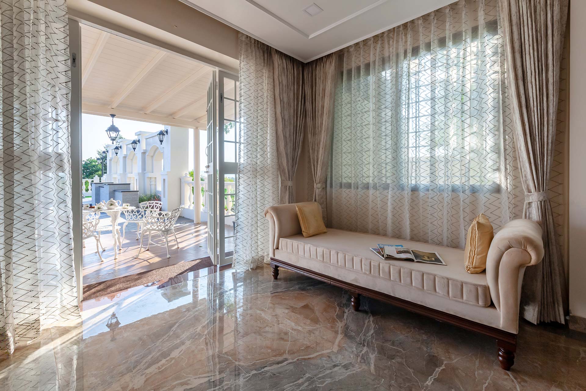 Behind the charming fountain-facade and opulent French windows, discover this elegant home oozing character in each nook & corner. The portico arches and wooden beams remain to blissfully space out the open-plan of this home, while the airy windows have been reimagined to deliver all the comforts of being one-on-one with nature. Lake La Vie is set by a mango farm, so don’t be surprised by the subtle revitalising whiff of fresh mango orchards. With the amount of greenery you’re surrounded by, strolling through the property with a nice brew in your hand is a peaceful way to start the day. You might then like to swim in the pool, again taking in the views, and soaking up the tranquil atmosphere – it’s hard to believe you’re so close to the main city of Nashik. Stroll into town for lunch at the local Misal Pav joint at Peruchi Wadi for a lip-smacking meal or explore Sula Wines, just a 25-minute drive from the home. When you head back from the vineyards, your first port of call has to be the deck area by the pool.