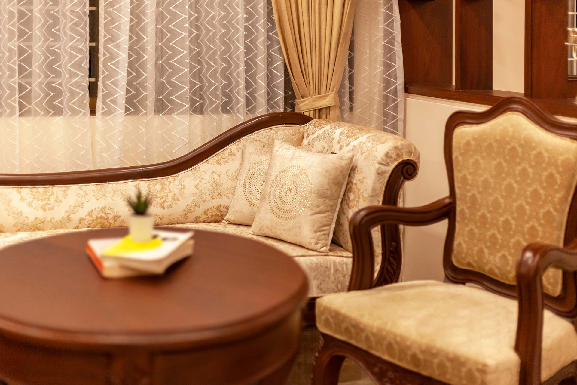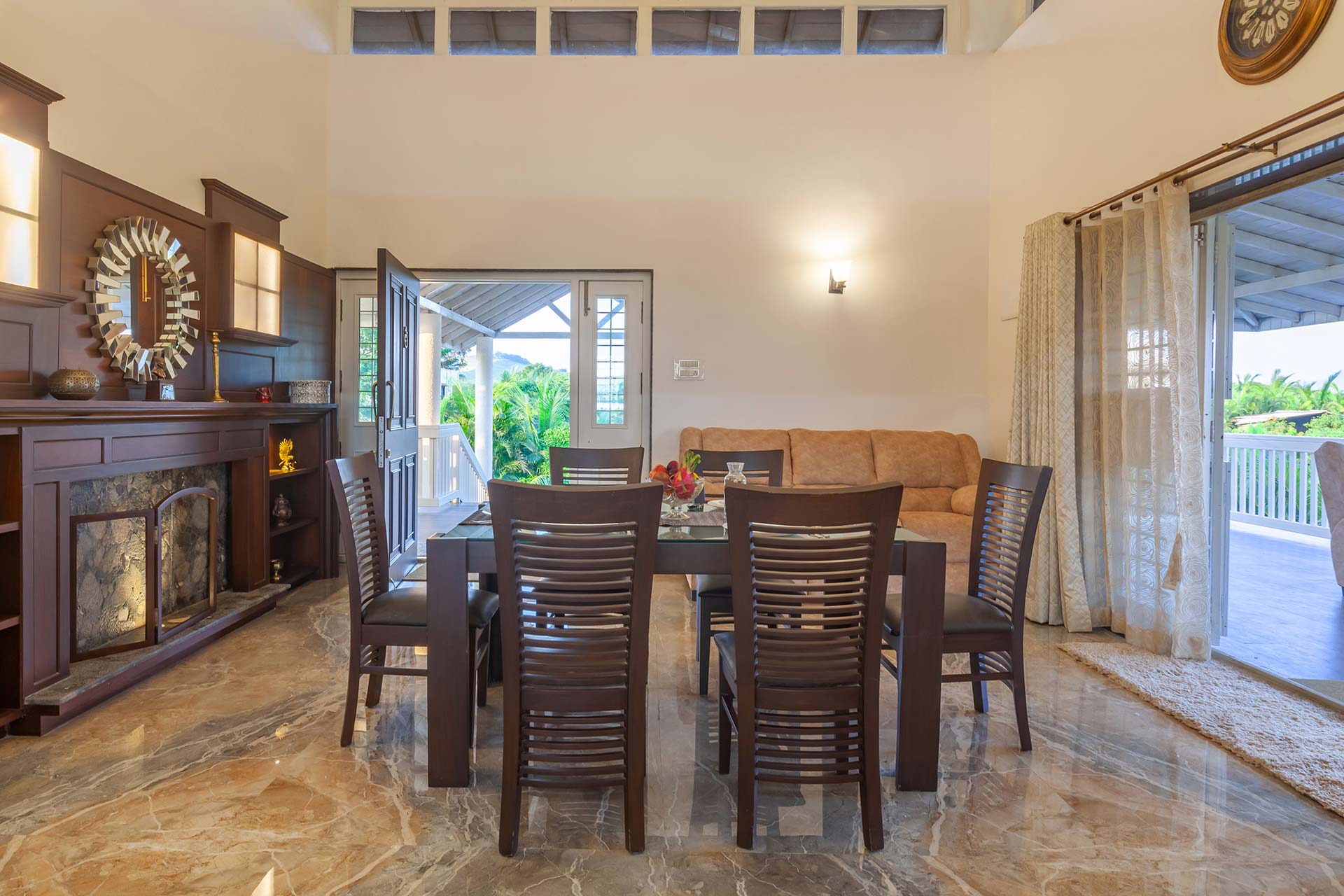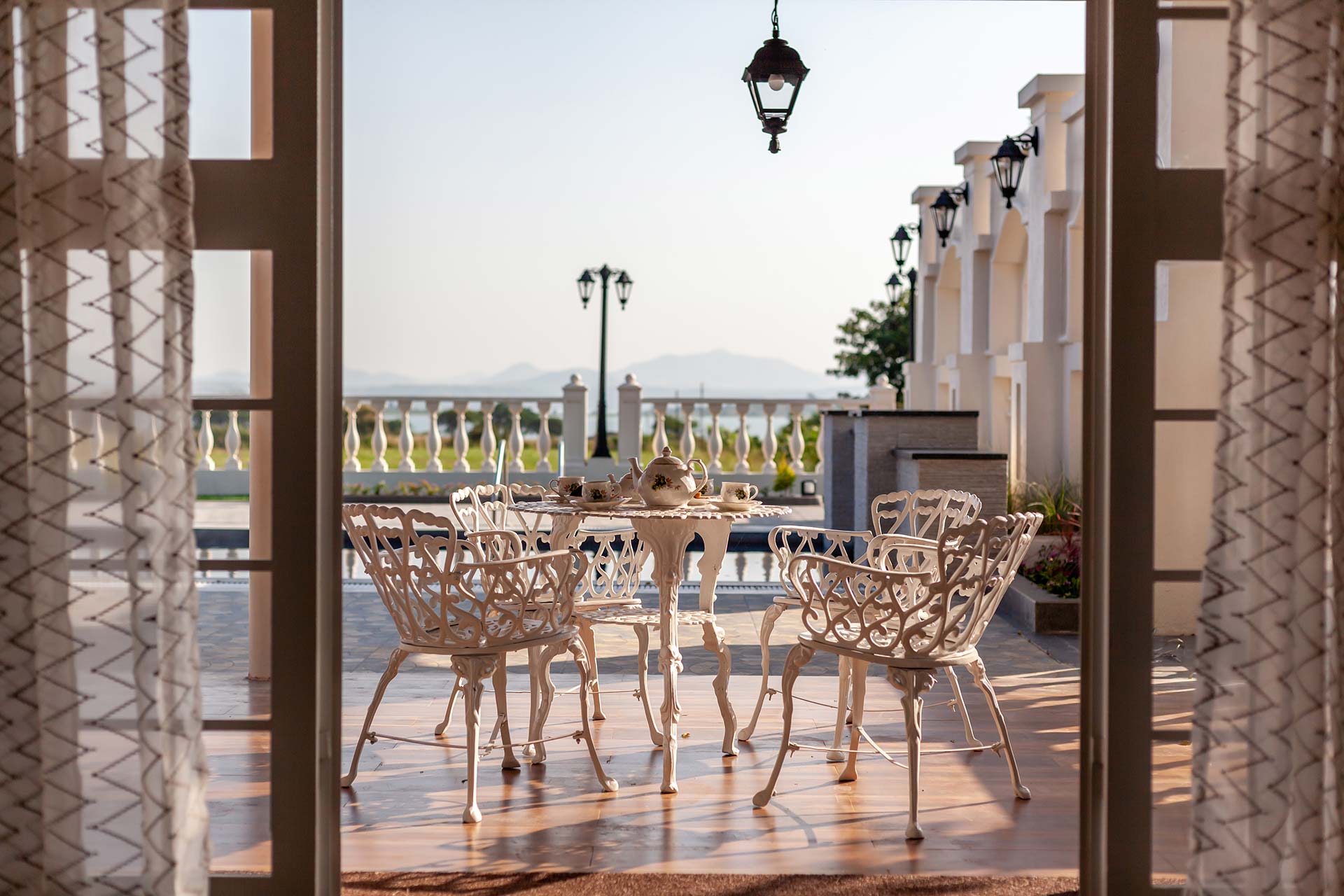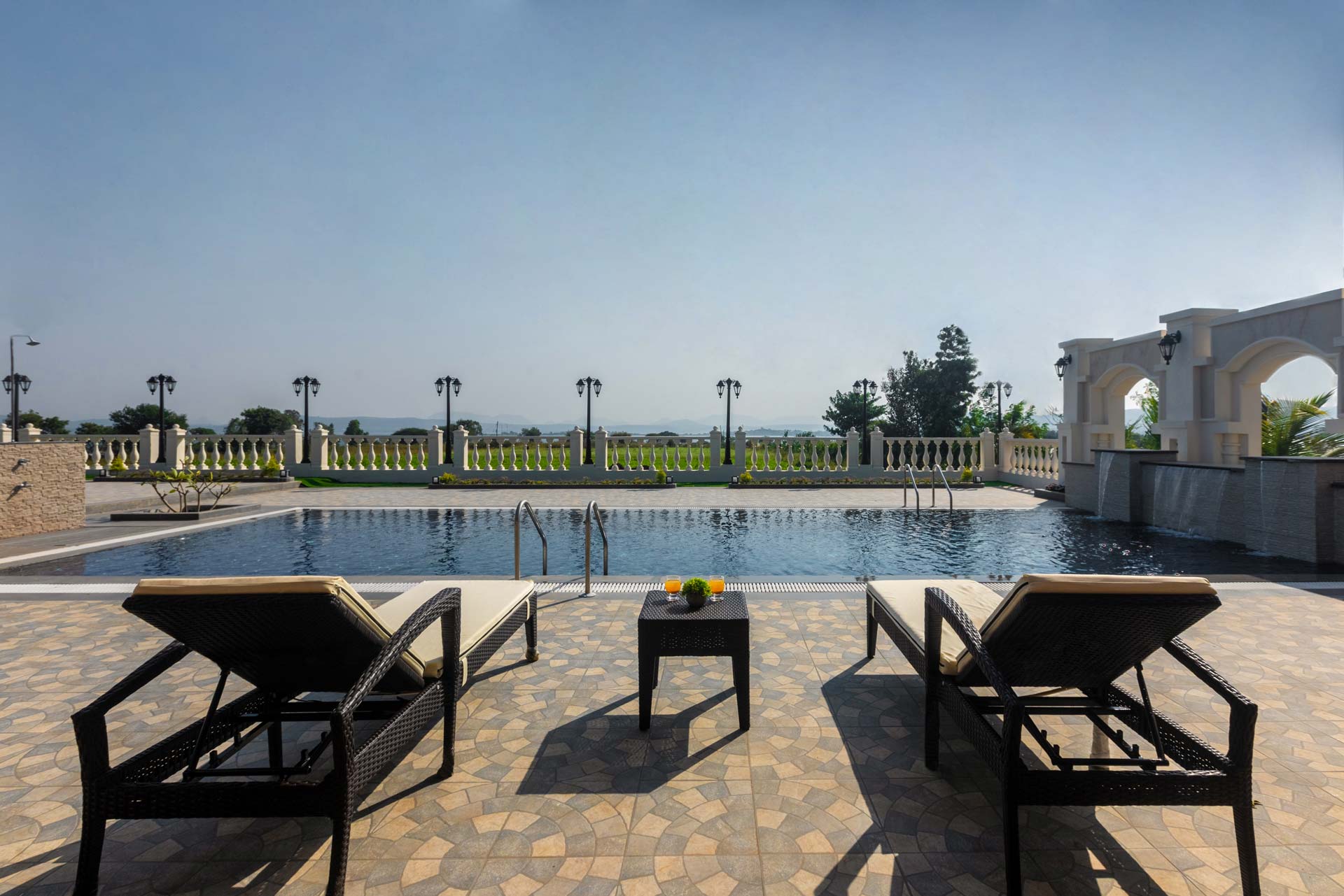 Behind the charming fountain-facade and opulent French windows, discover this elegant home oozing character in each nook & corner. The portico arches and wooden beams remain to blissfully space out the open-plan of this home, while the airy windows have been reimagined to deliver all the comforts of being one-on-one with nature. Lake La Vie is set by a mango farm, so don’t be surprised by the subtle revitalising whiff of fresh mango orchards. With the amount of greenery you’re surrounded by, strolling through the property with a nice brew in your hand is a peaceful way to start the day. You might then like to swim in the pool, again taking in the views, and soaking up the tranquil atmosphere – it’s hard to believe you’re so close to the main city of Nashik. Stroll into town for lunch at the local Misal Pav joint at Peruchi Wadi for a lip-smacking meal or explore Sula Wines, just a 25-minute drive from the home. When you head back from the vineyards, your first port of call has to be the deck area by the pool.