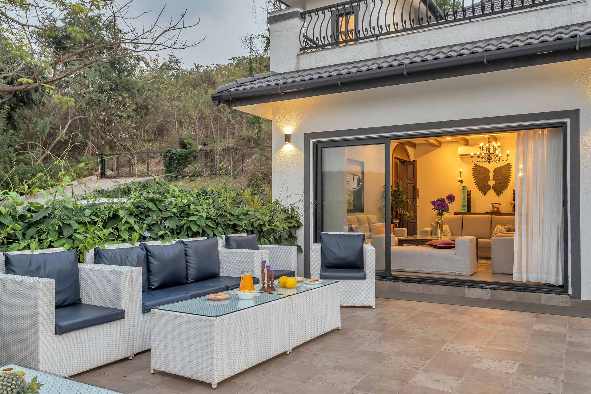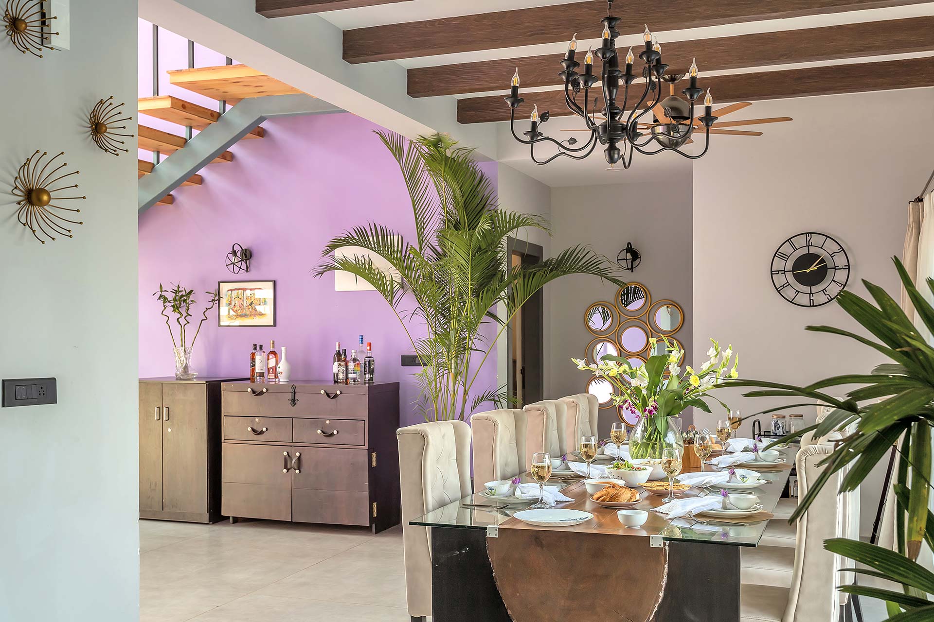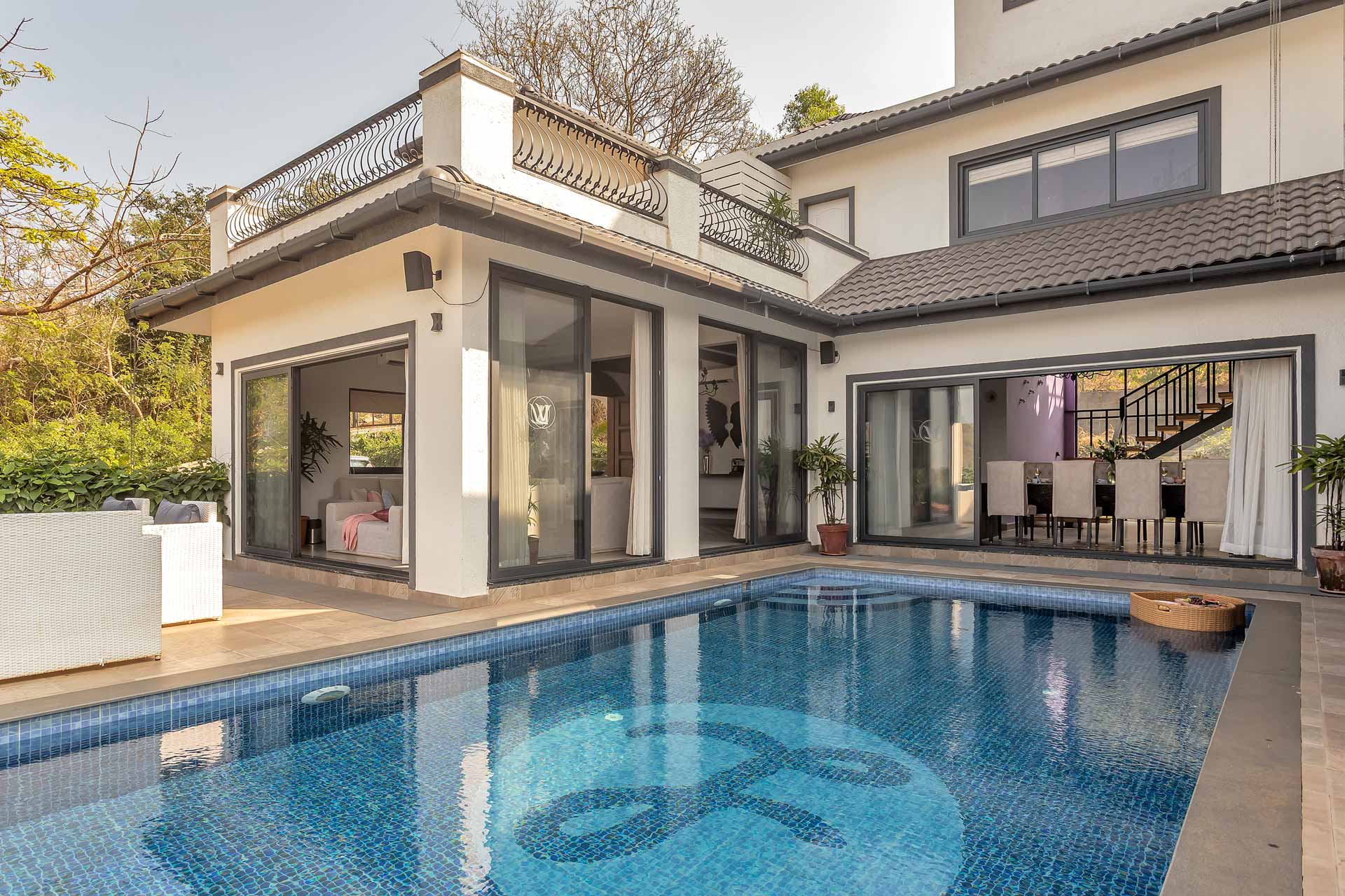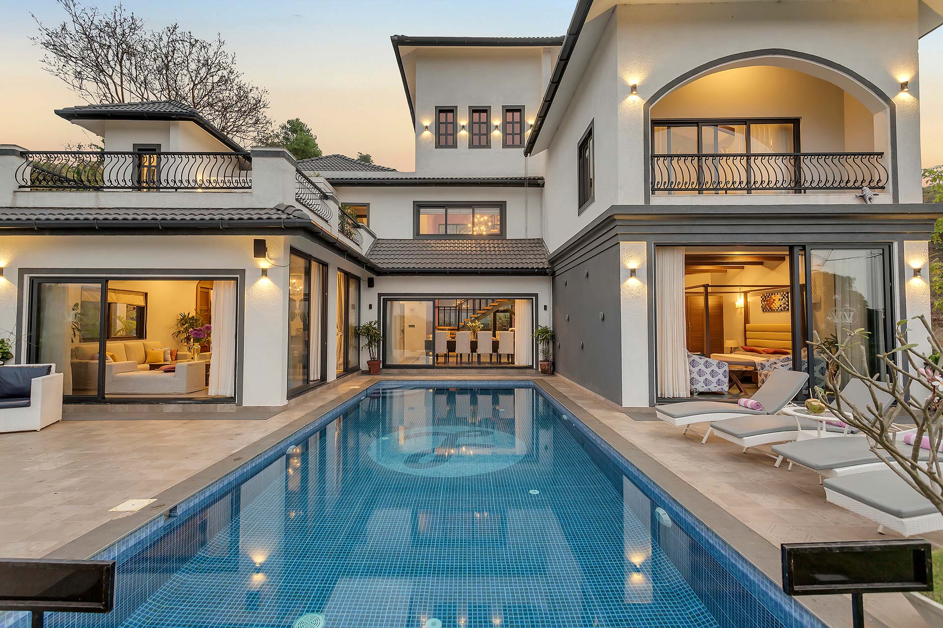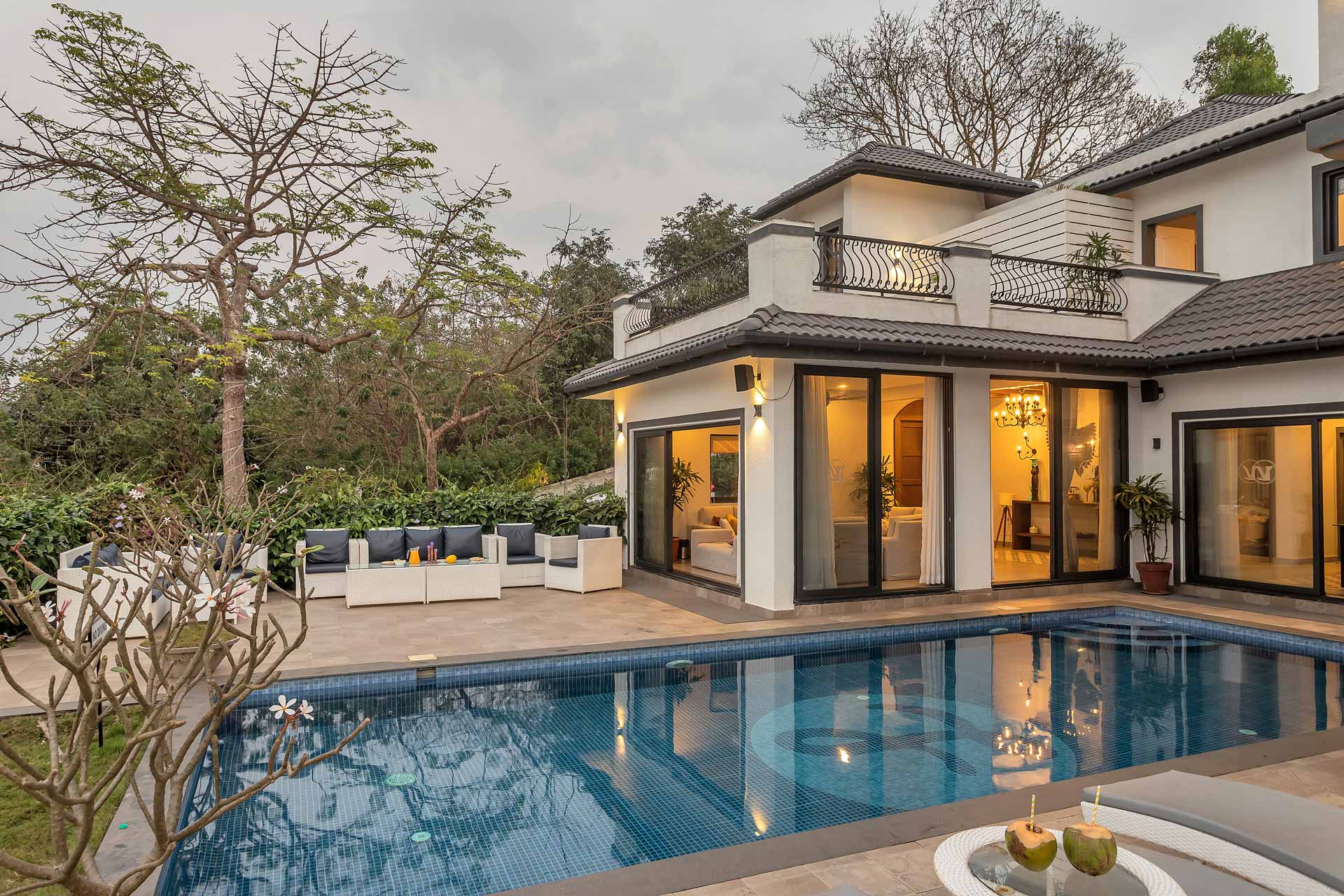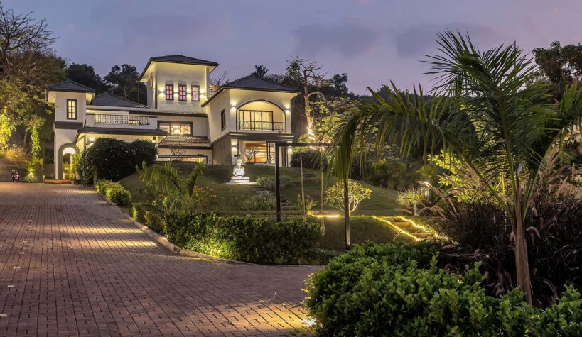 A blissful abode that comes with stunning hill views of Goa, Lavender Villa is perfect for those who want to explore popular attractions or bask in the tranquillity of Goa’s weather. Stepping inside, you’ll be greeted with rooms that have a unique infusion of rustic decor with modern amenities. The living room is an ideal sanctuary where one can enjoy in peace or jump straight into the pool with its direct access to the pool.  The sprawling lawn that is spread over acres is ideal for those wanting to start their day with an active run or leisurely stroll. The idyllic setting of the villa makes it perfect for exploring the vibrant streets of Goa and shopping for various souvenirs. For those seeking solace indoors, the home theatre with a bar setup is the right place for you to enjoy timeless classics with popcorn. As the fun-filled day moves forward, one can relax in the spa and rejuvenate their senses. As the night unfurls the canvas of glistening stars, one can relish a glass of wine with their loved ones and enjoy a barbeque.