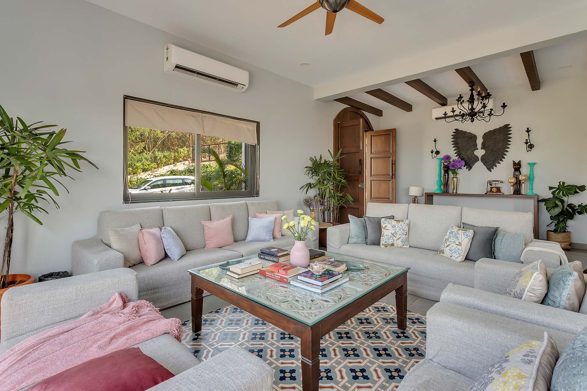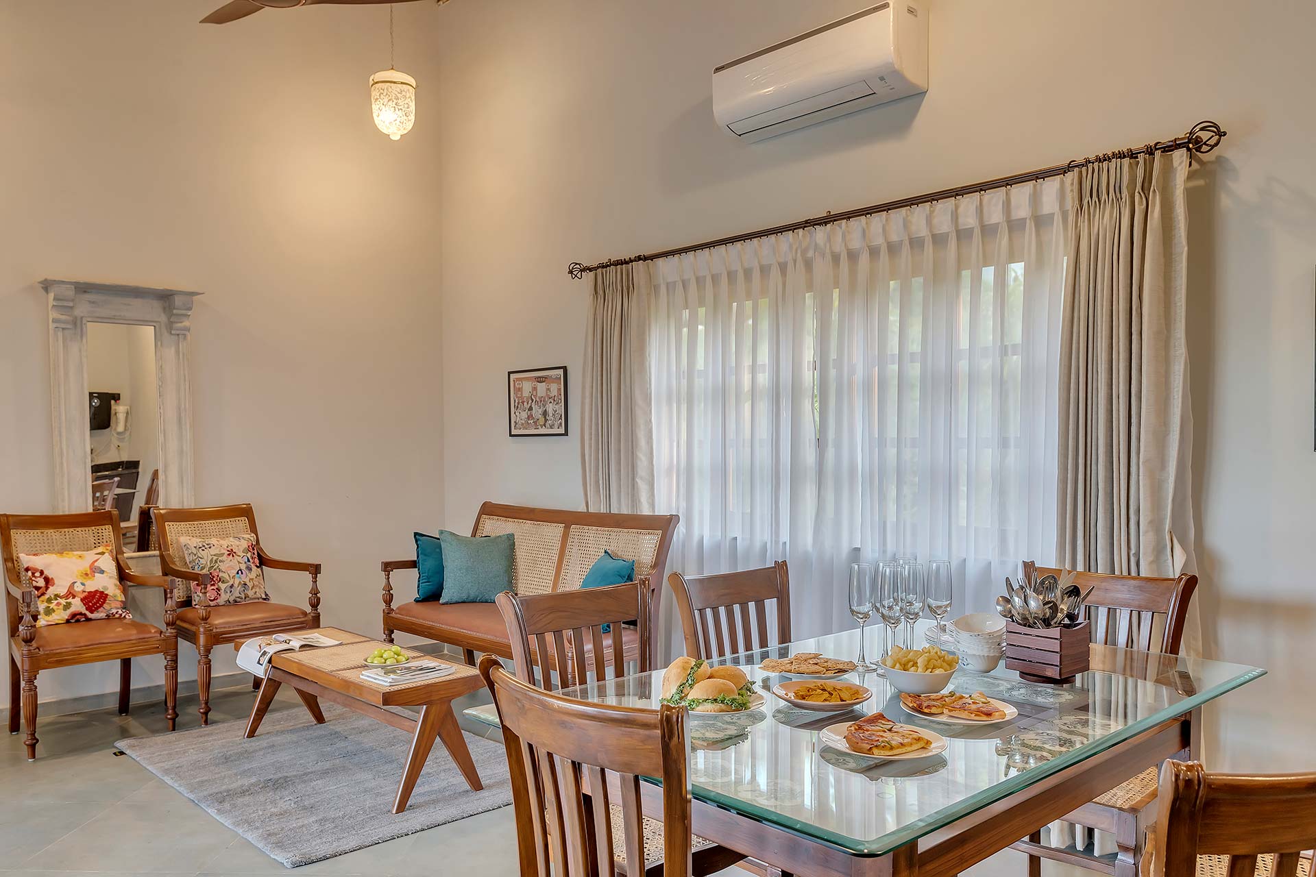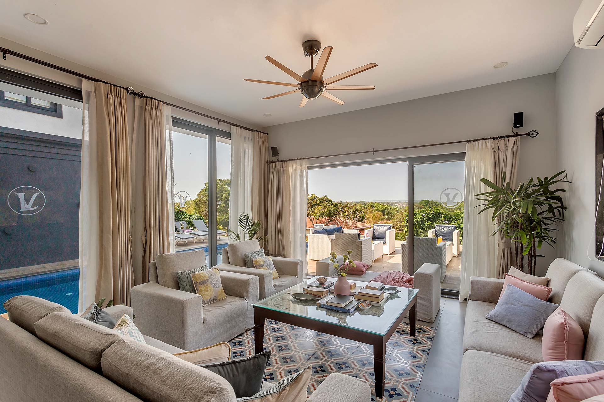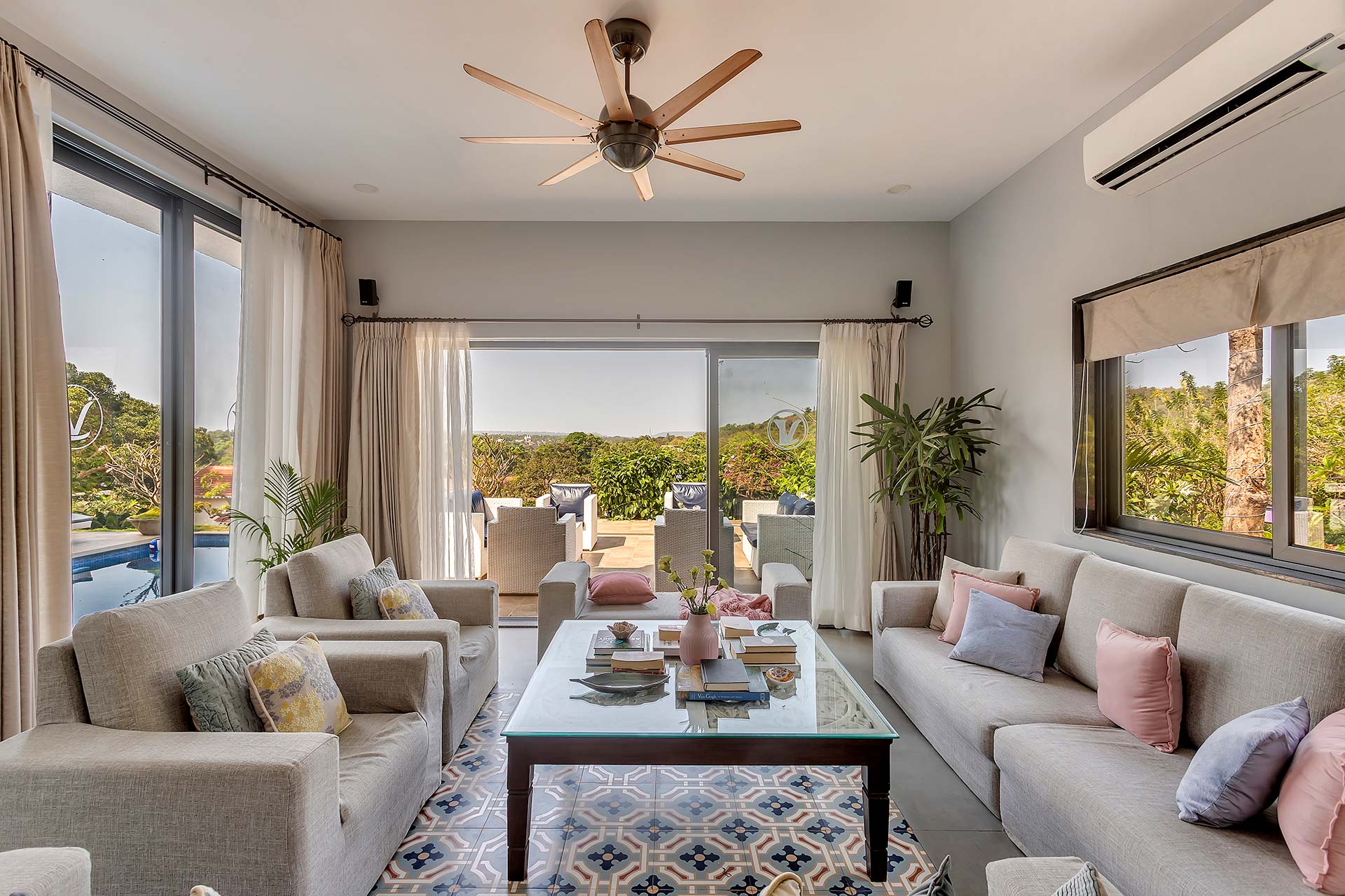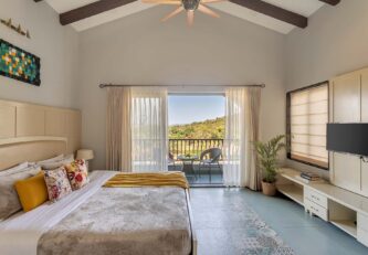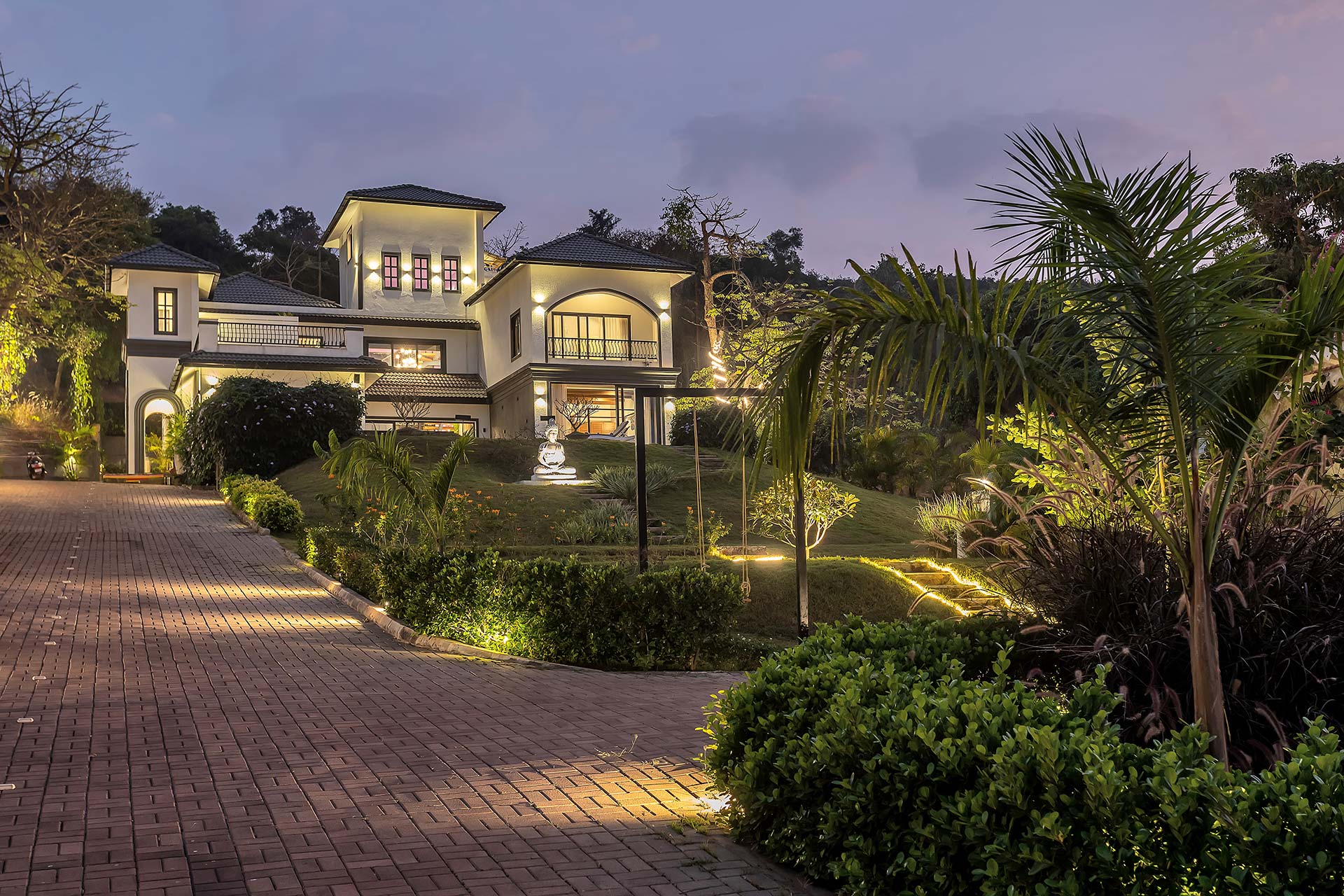A blissful abode that comes with stunning hill views of Goa, Lavender Villa is perfect for those who want to explore popular attractions or bask in the tranquillity of Goa’s weather. Stepping inside, you’ll be greeted with rooms that have a unique infusion of rustic decor with modern amenities. The living room is an ideal sanctuary where one can enjoy in peace or jump straight into the pool with its direct access to the pool.  The sprawling lawn that is spread over acres is ideal for those wanting to start their day with an active run or leisurely stroll. The idyllic setting of the villa makes it perfect for exploring the vibrant streets of Goa and shopping for various souvenirs. For those seeking solace indoors, the home theatre with a bar setup is the right place for you to enjoy timeless classics with popcorn. As the fun-filled day moves forward, one can relax in the spa and rejuvenate their senses. As the night unfurls the canvas of glistening stars, one can relish a glass of wine with their loved ones and enjoy a barbeque.