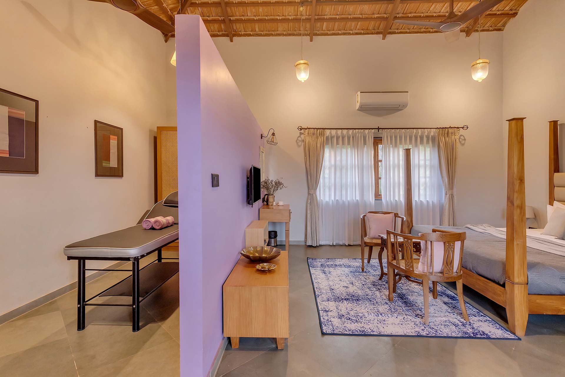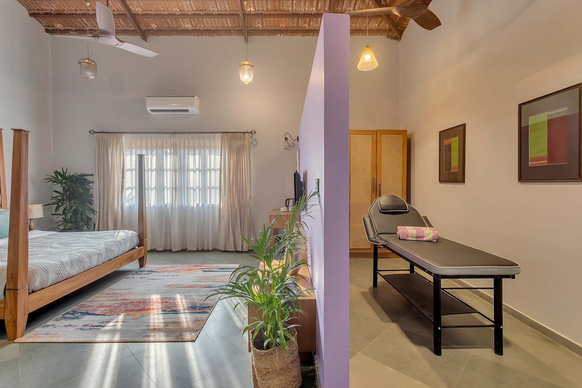Echoing Goa’s vibrant and rich soul, Lavender Villa is a luxurious sojourn located in the heart of Goa’s hills. Spread across a sprawling acre of lush greenery and divided into two villas, Lavender Villa is scattered with soothing respites as well as vivid experiences. The interiors feature a tasteful combination of vintage aesthetics and modern amenities. The villa is a sanctuary of immersive experiences, whether it’s the spa for relaxation, a refreshing dip in the pool, or the theatre room with a bar setup for watching movies.