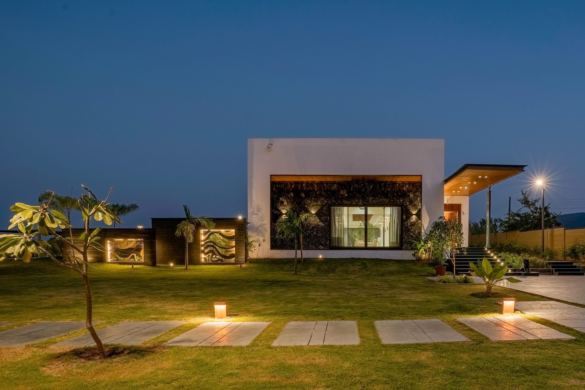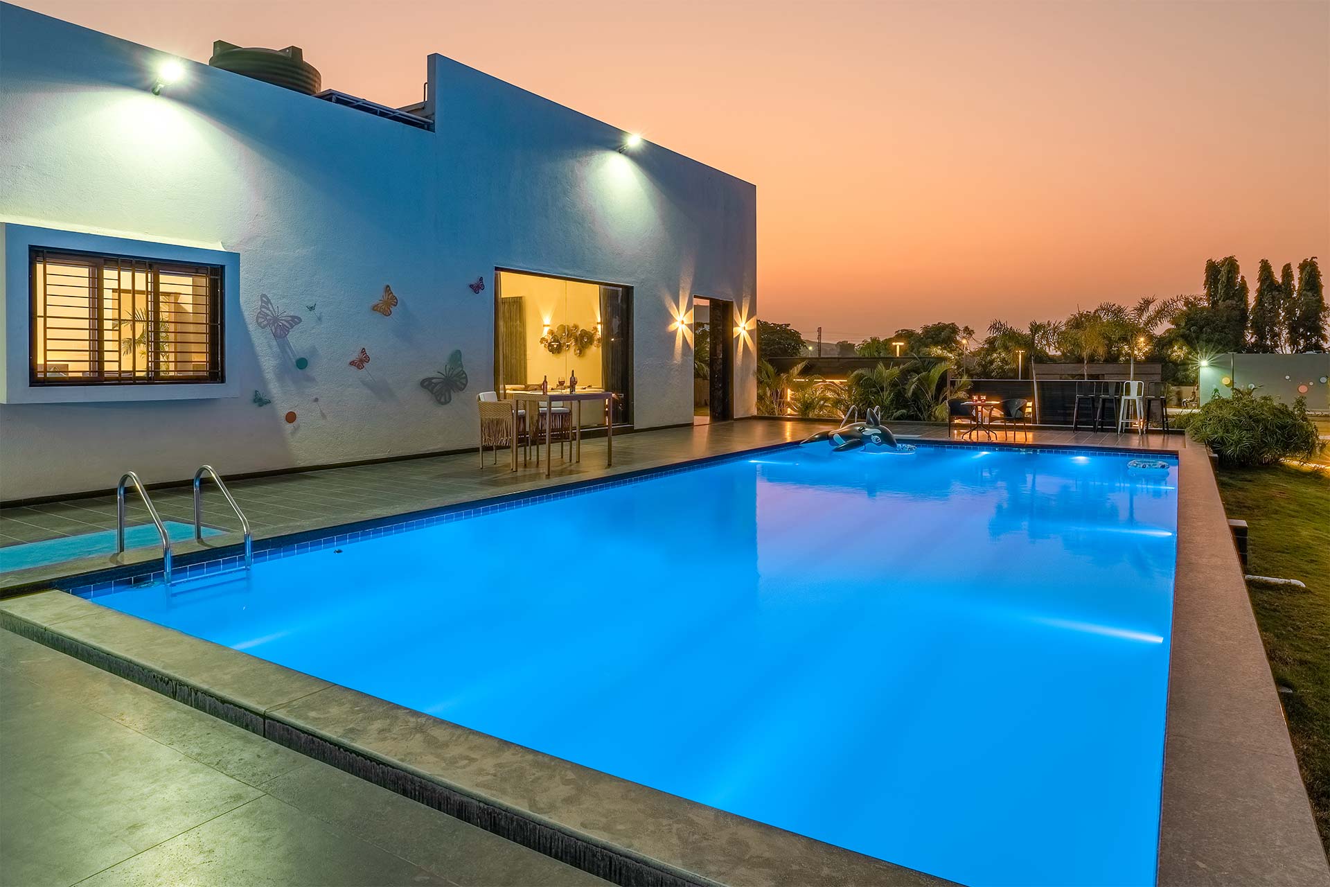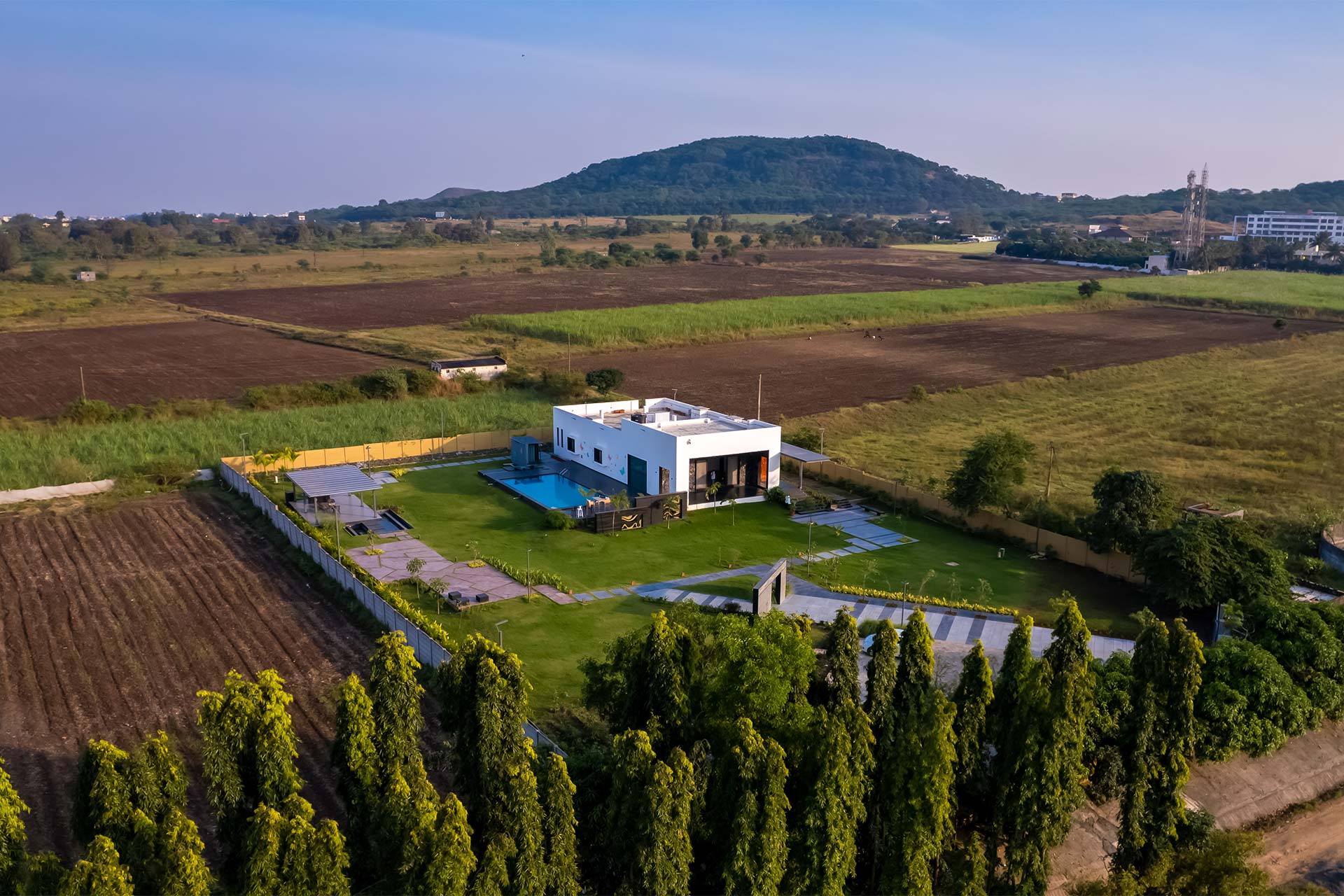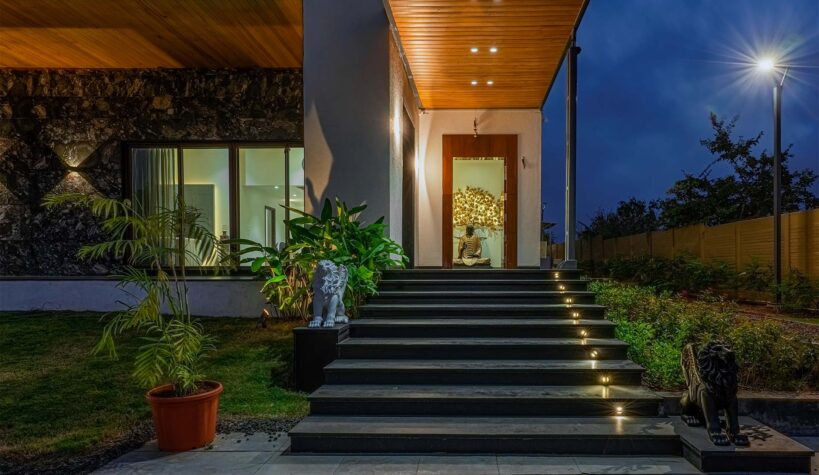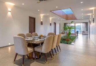 Le Bon Horizon; a contemporary and sleek home tucked away in the heart of Nashik’s breathtaking scenery hits all the boxes for a short escape away from the hubbub. With panoramic views and a wealth of thoughtfully designed amenities, this idyllic sanctuary is the ideal spot for a much-needed break with your friends and family. Relish an early morning stroll along the dewy grounds, a short plunge in the outdoor pool, or the ideal ambience this villa delivers for a stunning view of the sunset’s crimson shades.