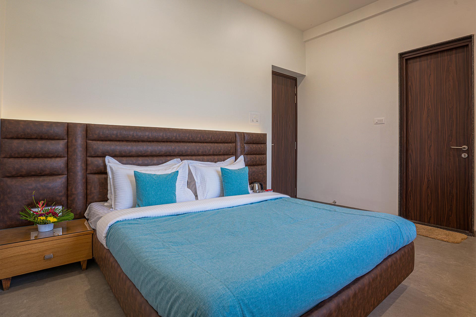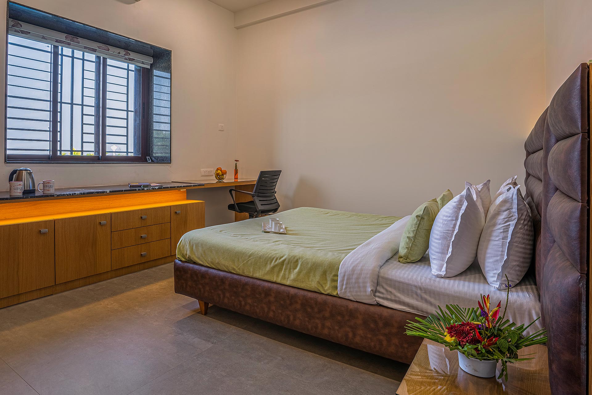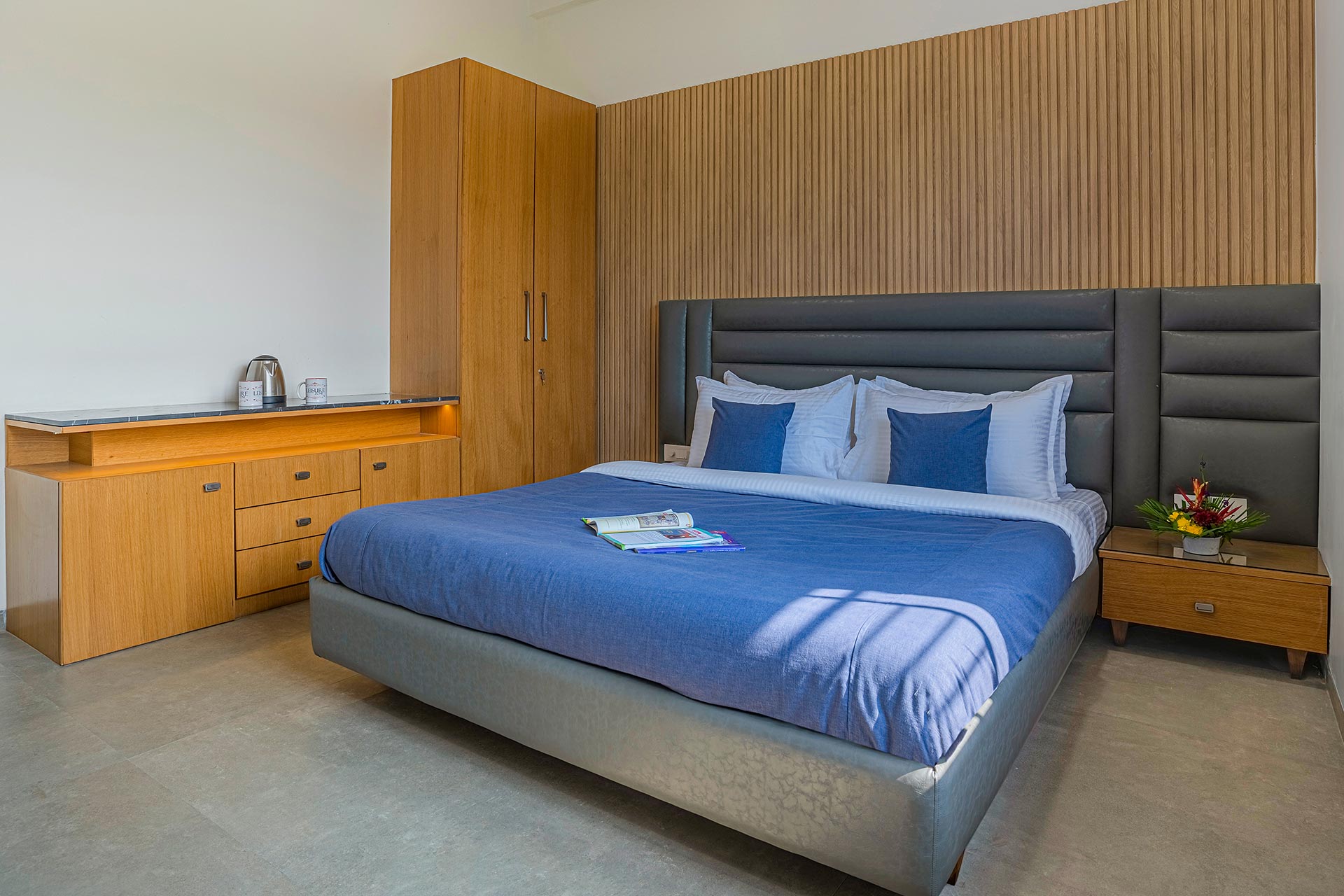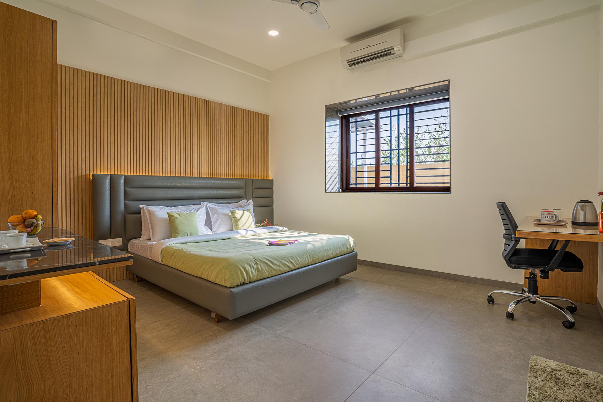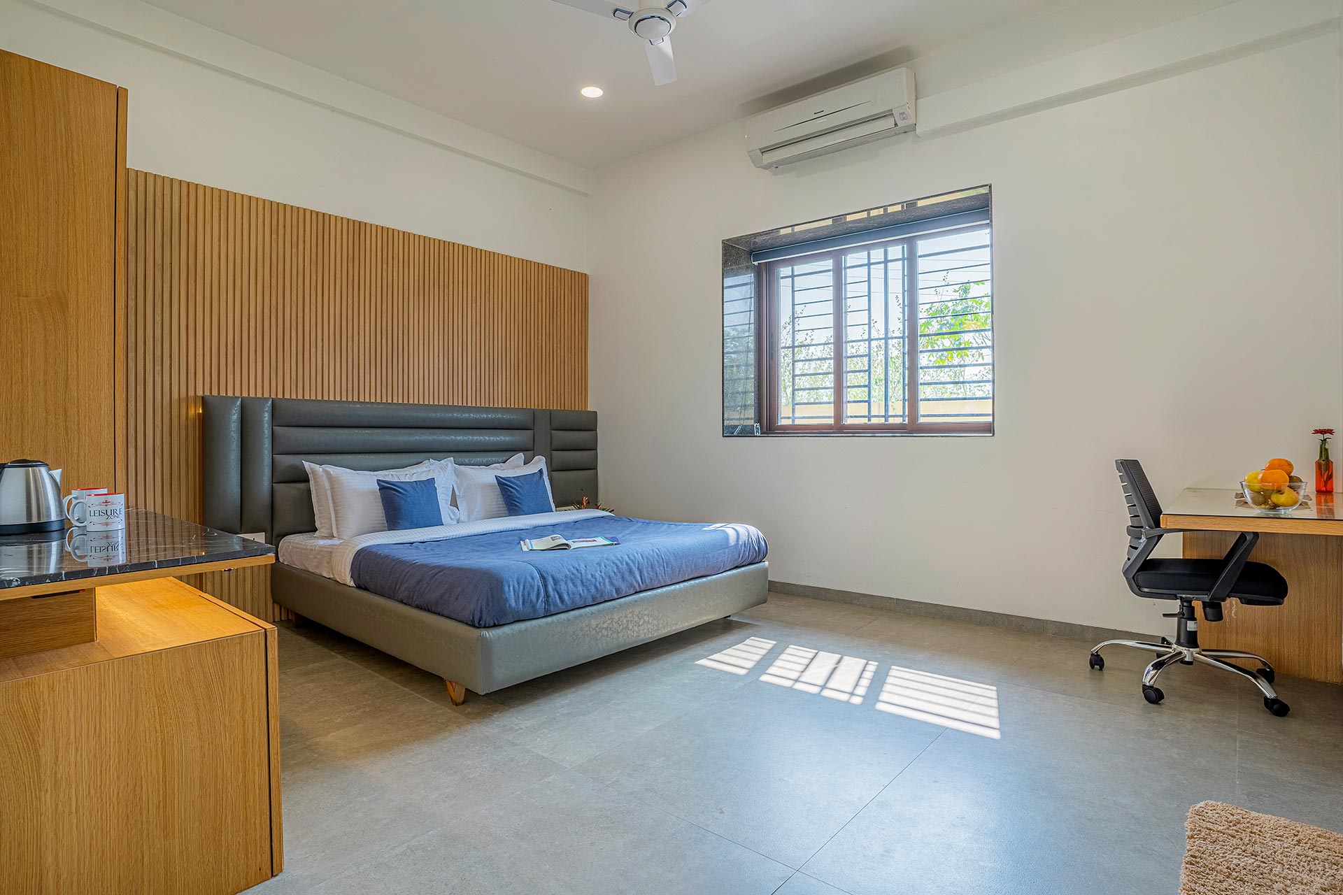 – All rooms offer amenities such as a king-sized bed, an extra foldable bed, AC, wardrobe, and a designated workstation.