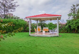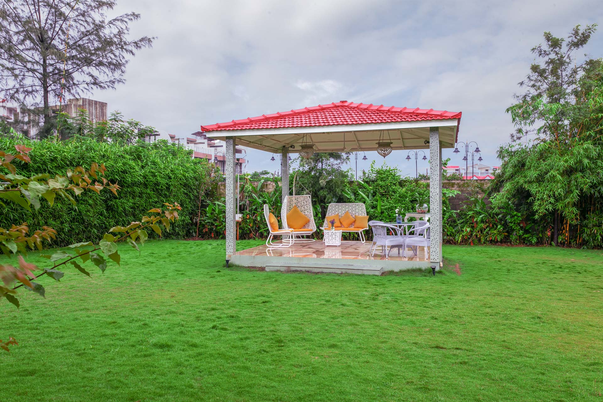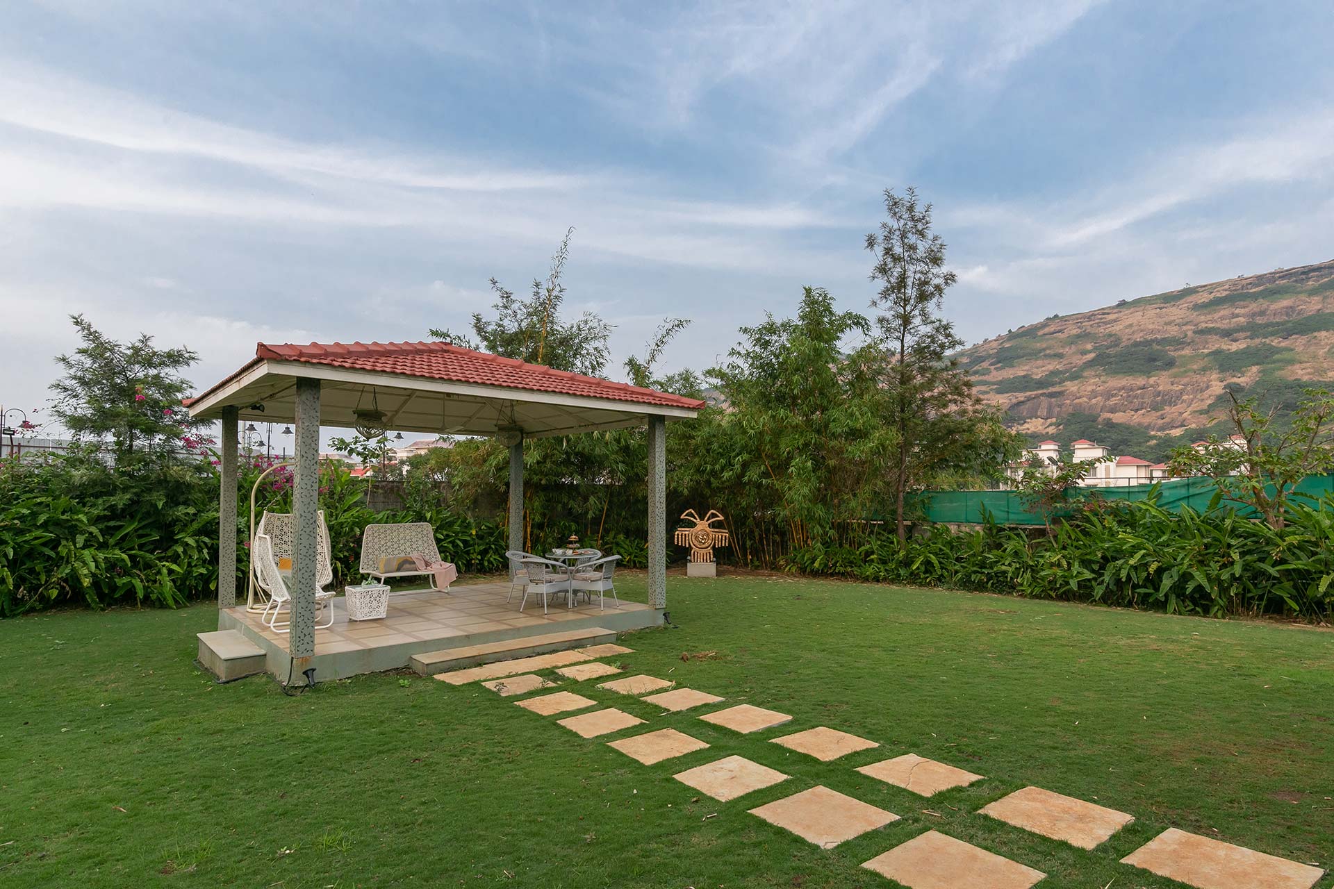 – The exteriors of the villa feature a lush lawn with a gazebo, with seating for up to 9 people.