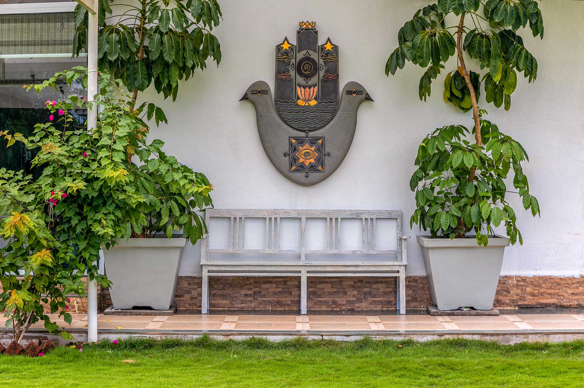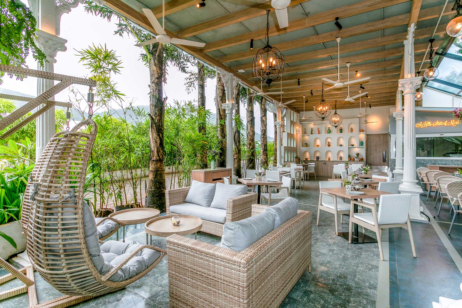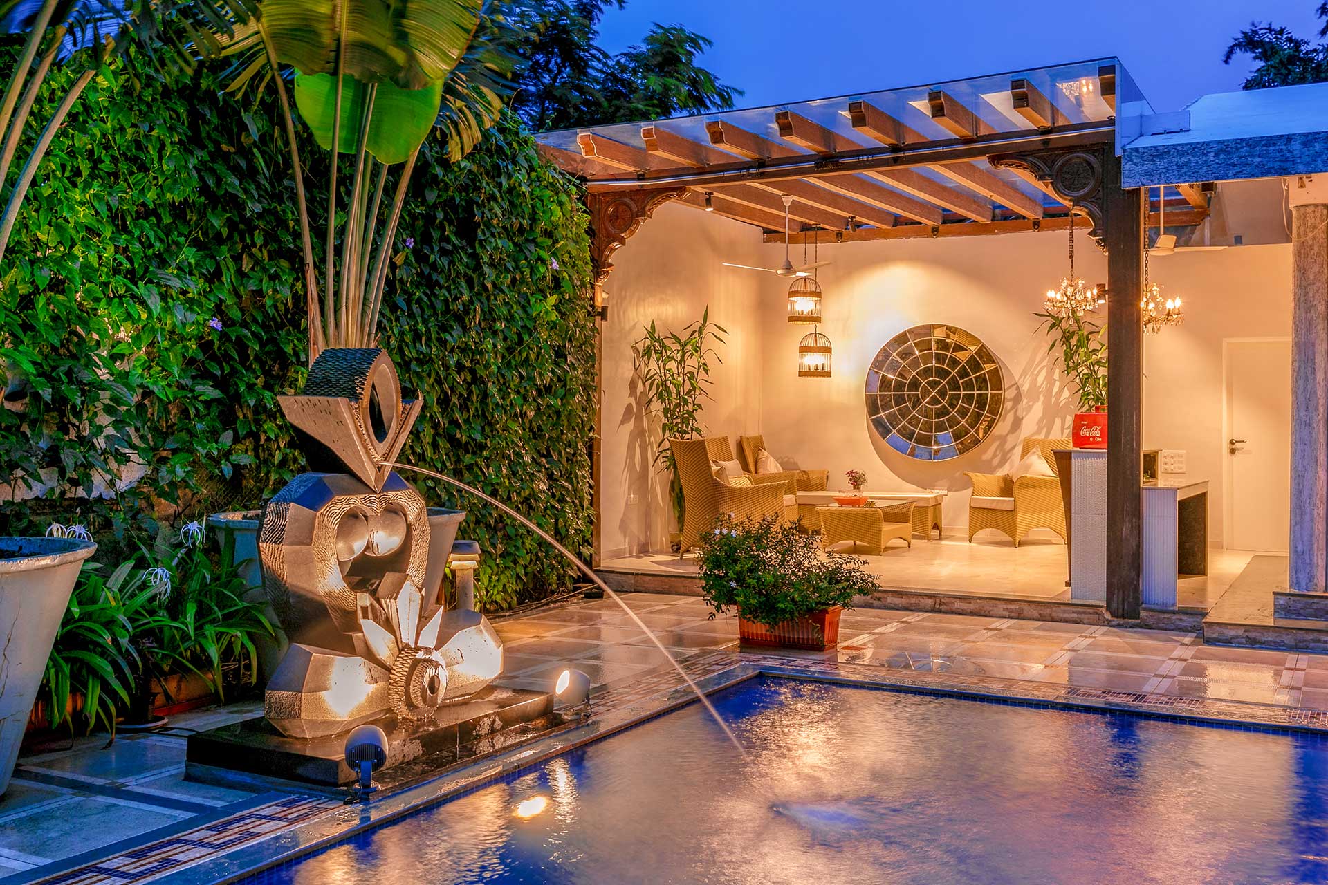 Geometrica is Le Sutra Great Escape’s first offering of an art-themed villa. All the artworks and installations in Geometrica resonate with the theme of Indian and sacred geometry. The mesmerizing art pieces are designed to elevate the energy of the home and provide our guests with an extraordinary stay! One look at the space tells you how creatively it has been put together, and every detail is very unique from scratch and has been created by our in-house designers, artists, and sculptors. The bedrooms are equipped with all comforts for you, to ensure a seamless stay. As a group, you’d never want to leave the poolside with a view of the hills, but if at all you do, you can hang out in the gazebo set up on the lawn and bask in the geometric vibe of it all. To top it all off, get to enjoy a scrumptious feast of your favourite gastronomical delights at the in-house Anglo-India Café and Bistro. This villa certainly makes for an ideal hideaway, away from the city.