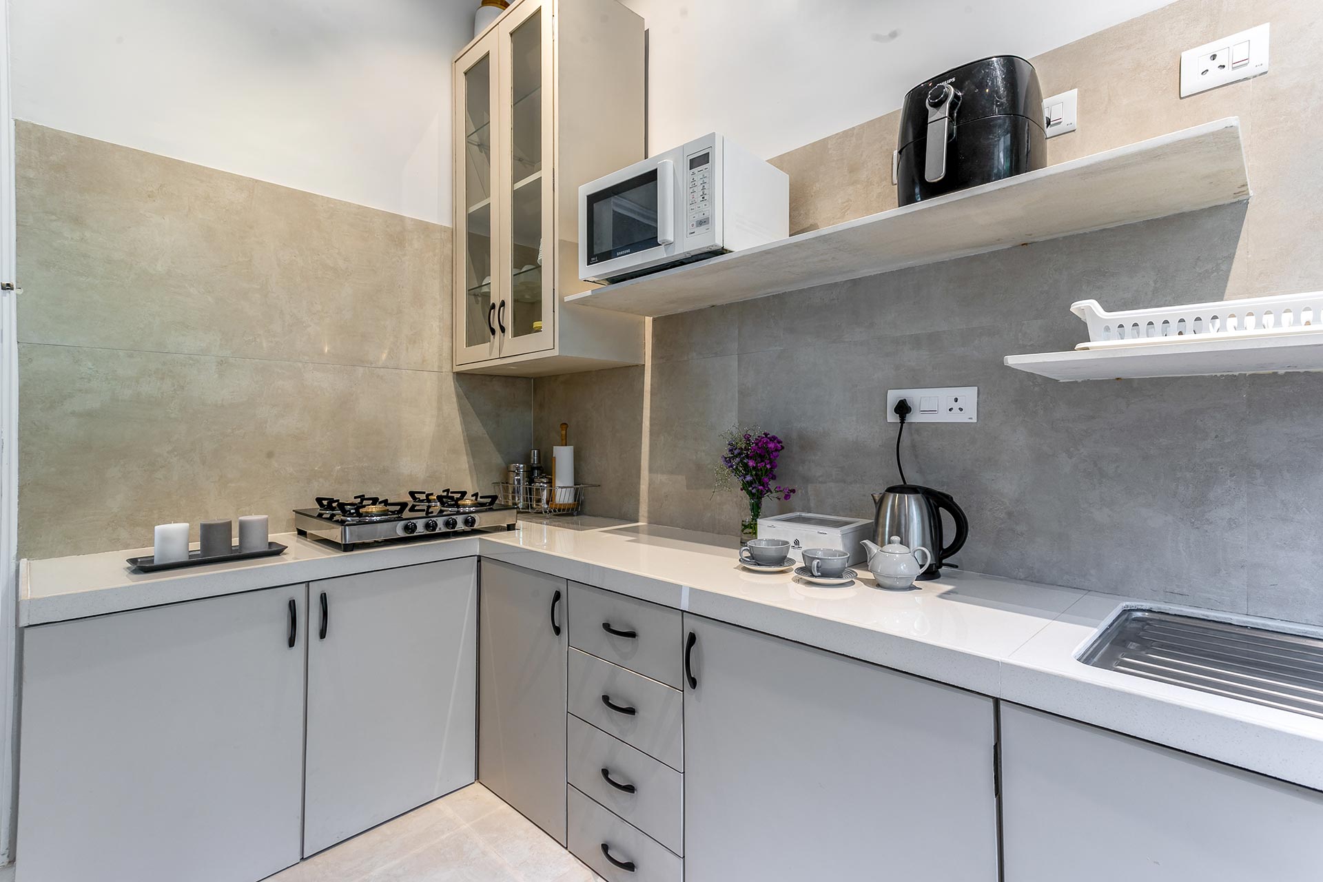 – The kitchen is equipped with a water purifier, crockery and cutlery.