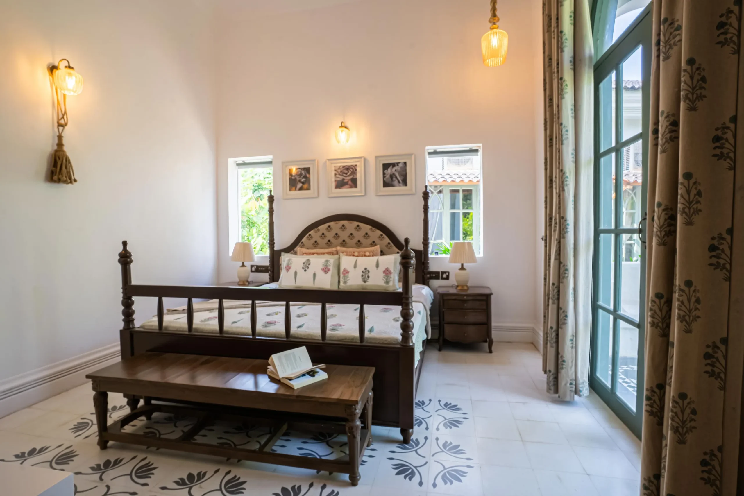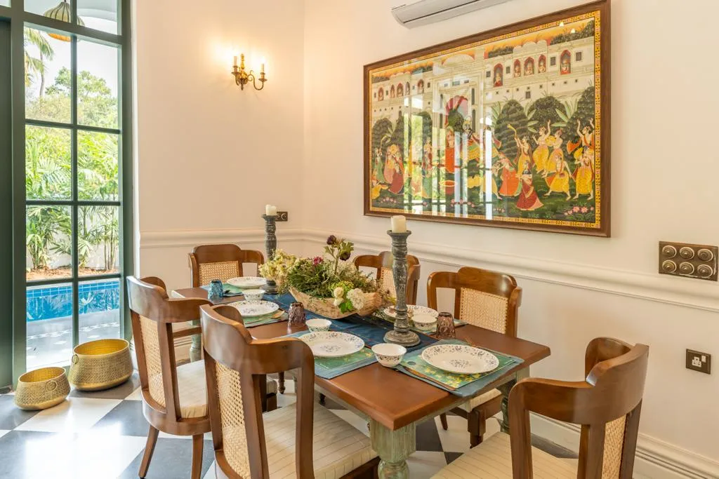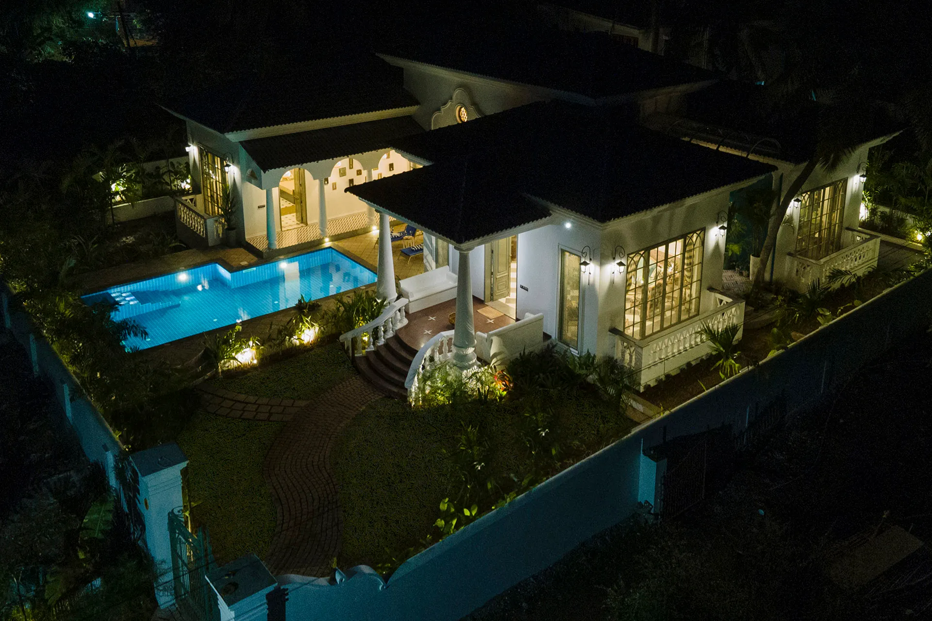 Step into your own private paradise as you enter the magnificent and luxurious Maison 9. Portuguese inspired architecture and vintage aesthetics blend harmoniously to offer a unique experience and bring the homeowner’s vision to life. A home built with love, every corner tells a unique story—from antiques collected from all over the world to traditional hand painted wallpapers and striking wooden carvings. With 6 spacious bedrooms, an opulent living and dining area, a delightful patio, lush lawns, and not one, but two serene private pools, Maison 9 is nestled near the serene Anjuna beach. Surrounded by picturesque paddy fields and offering awe-inspiring views, this residence is your perfect retreat, whether you seek pure relaxation or wish to host an intimate soiree with cherished ones. Anjuna itself is a vibrant tapestry, boasting local markets, chic eateries, a pulsating nightlife, and renowned beaches, catering to diverse tastes. Yet, should you prefer to revel in the villa’s allure, our dedicated Experiences team ensures an unforgettable stay. From exclusive restaurant pop-ups to delightful cocktail evenings, your desires become our curated experiences.