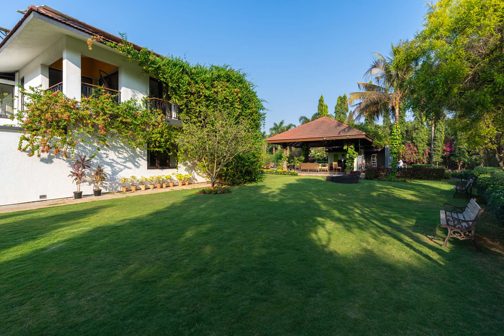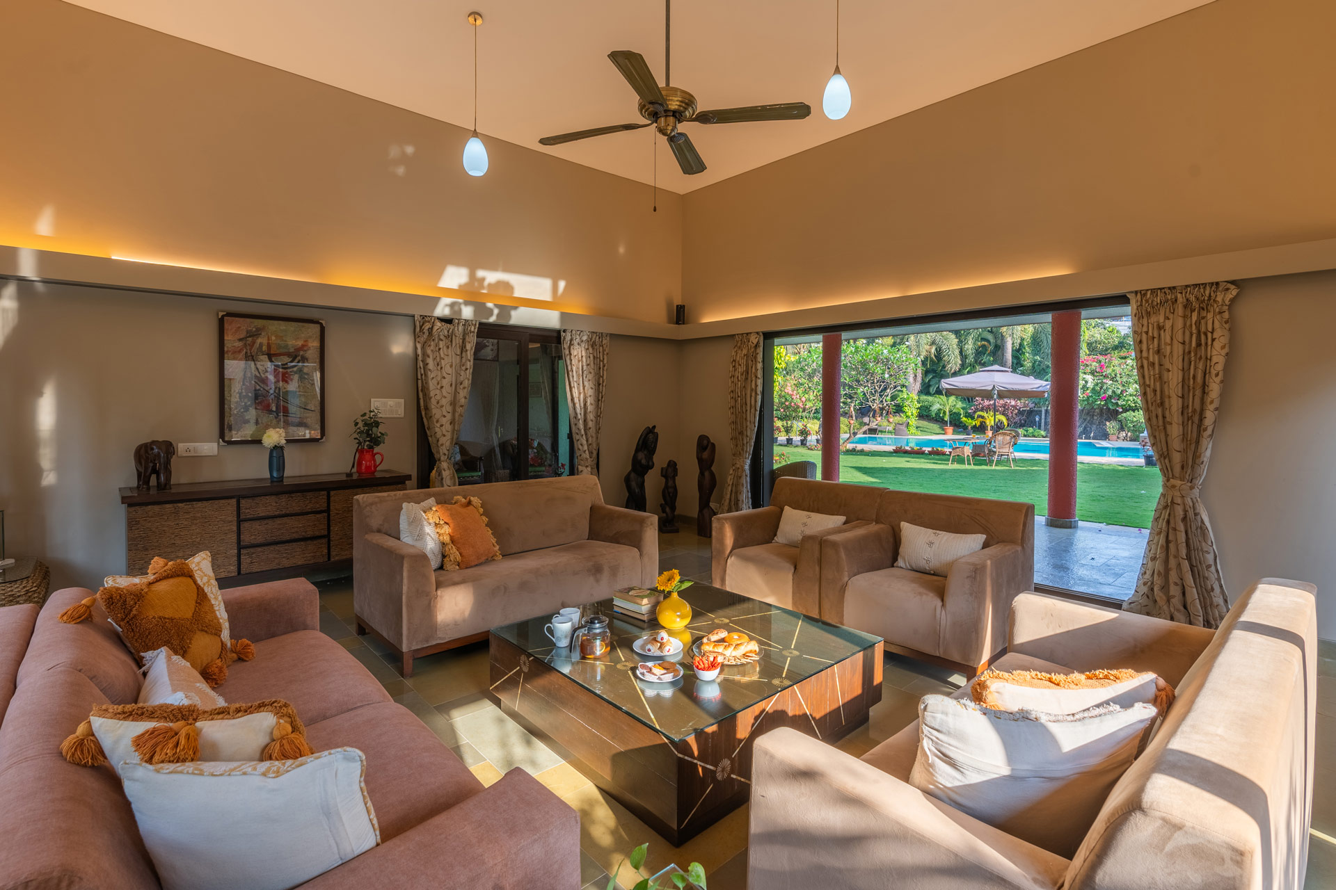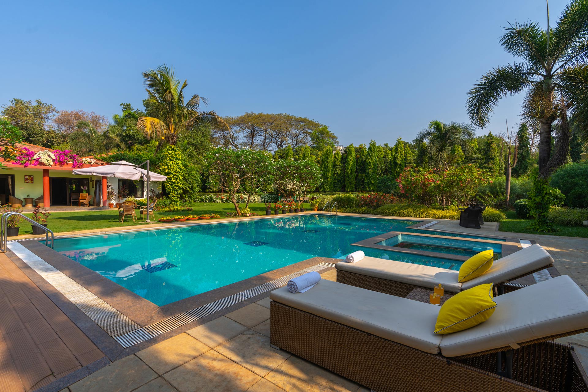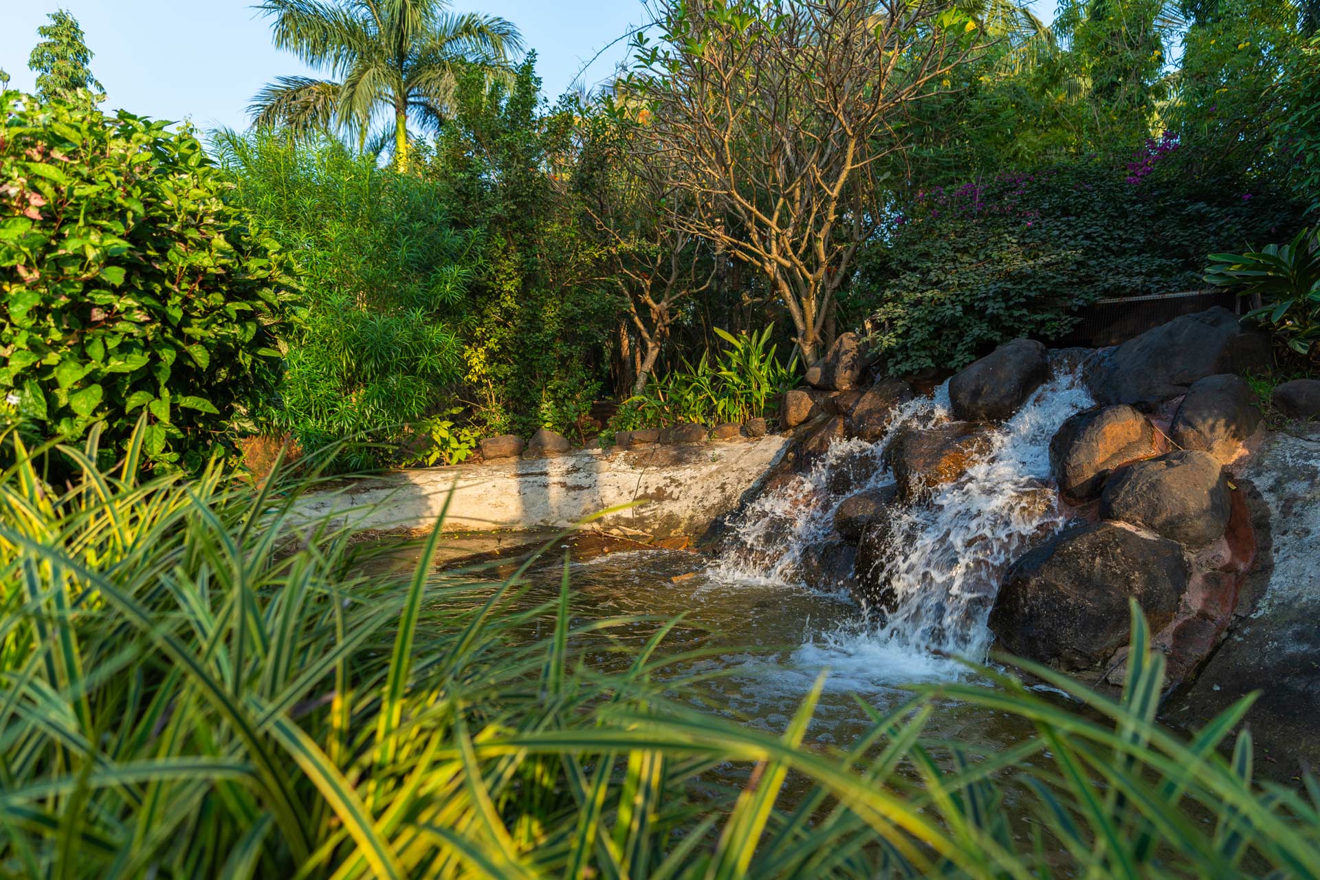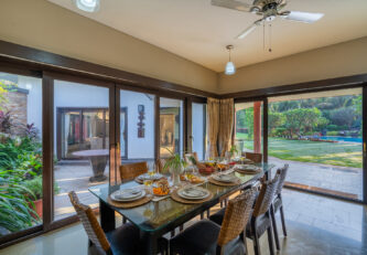 Replete with the beauty of orchards and greenery, enjoy the spectacular interiors and surroundings of this beautiful villa. Don’t get too comfortable with your solitude, as you can expect some company in the form of chirping birds and blooming bougainvilleas while the waterfalls form a soothing background score.