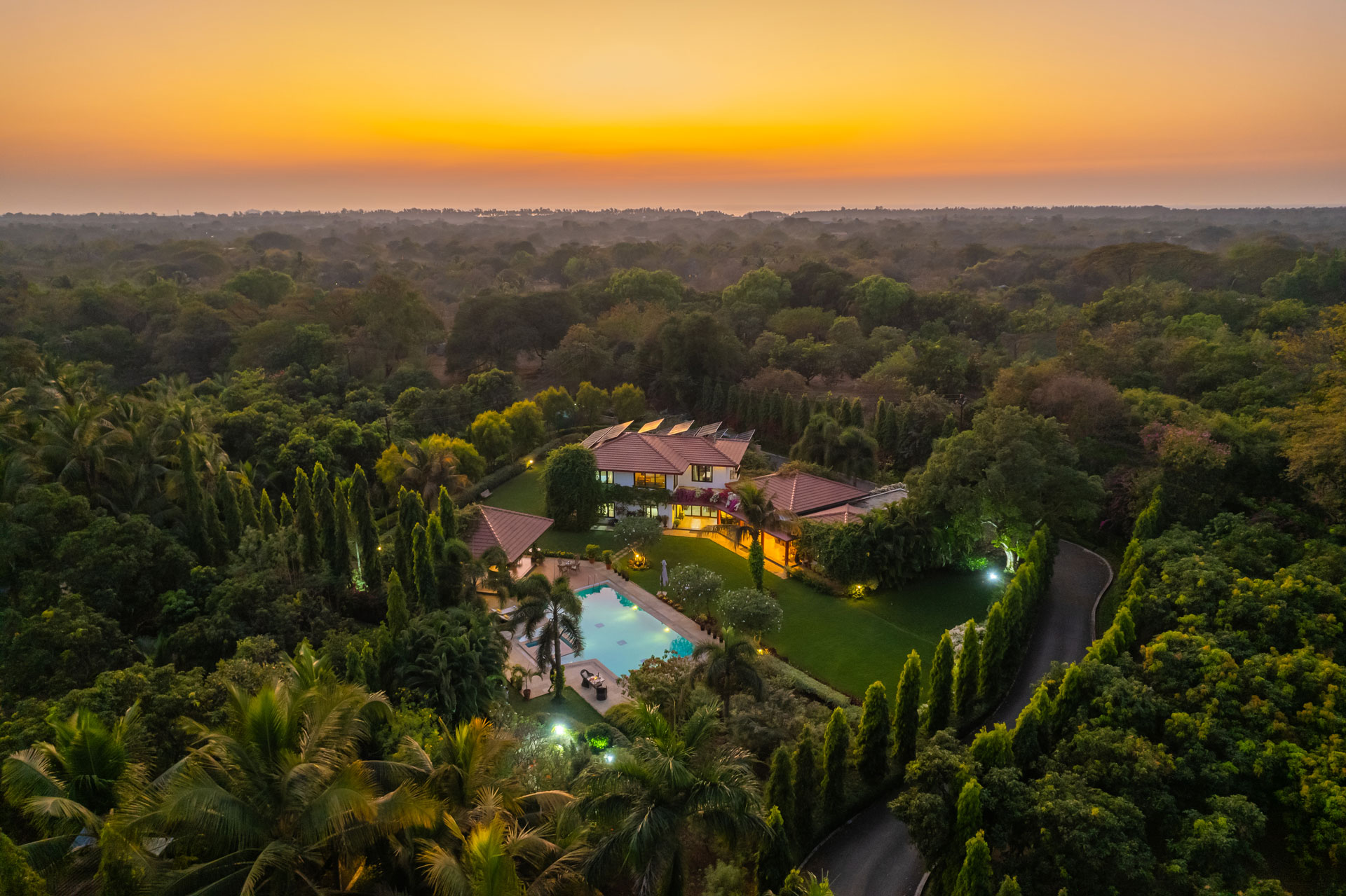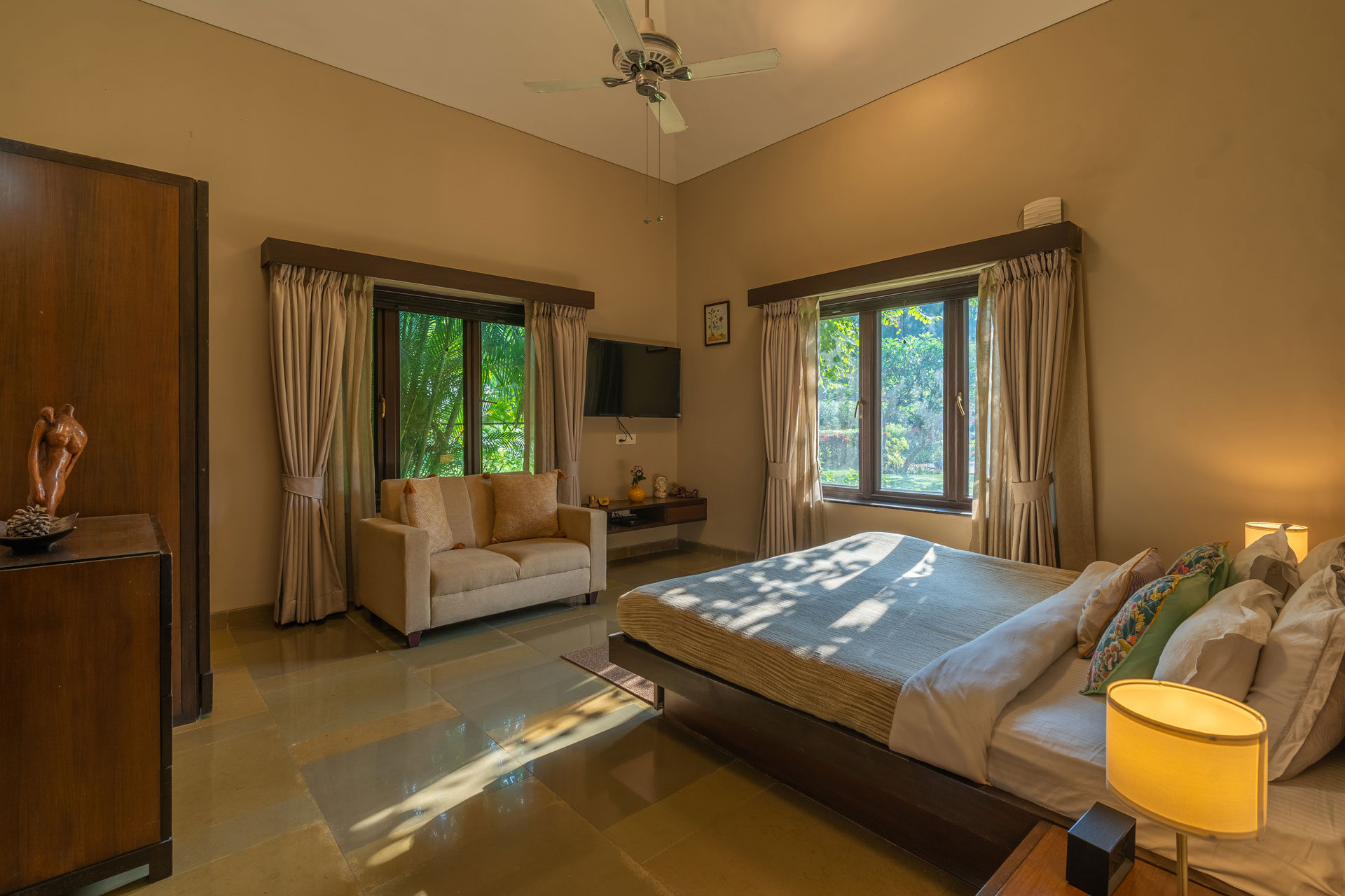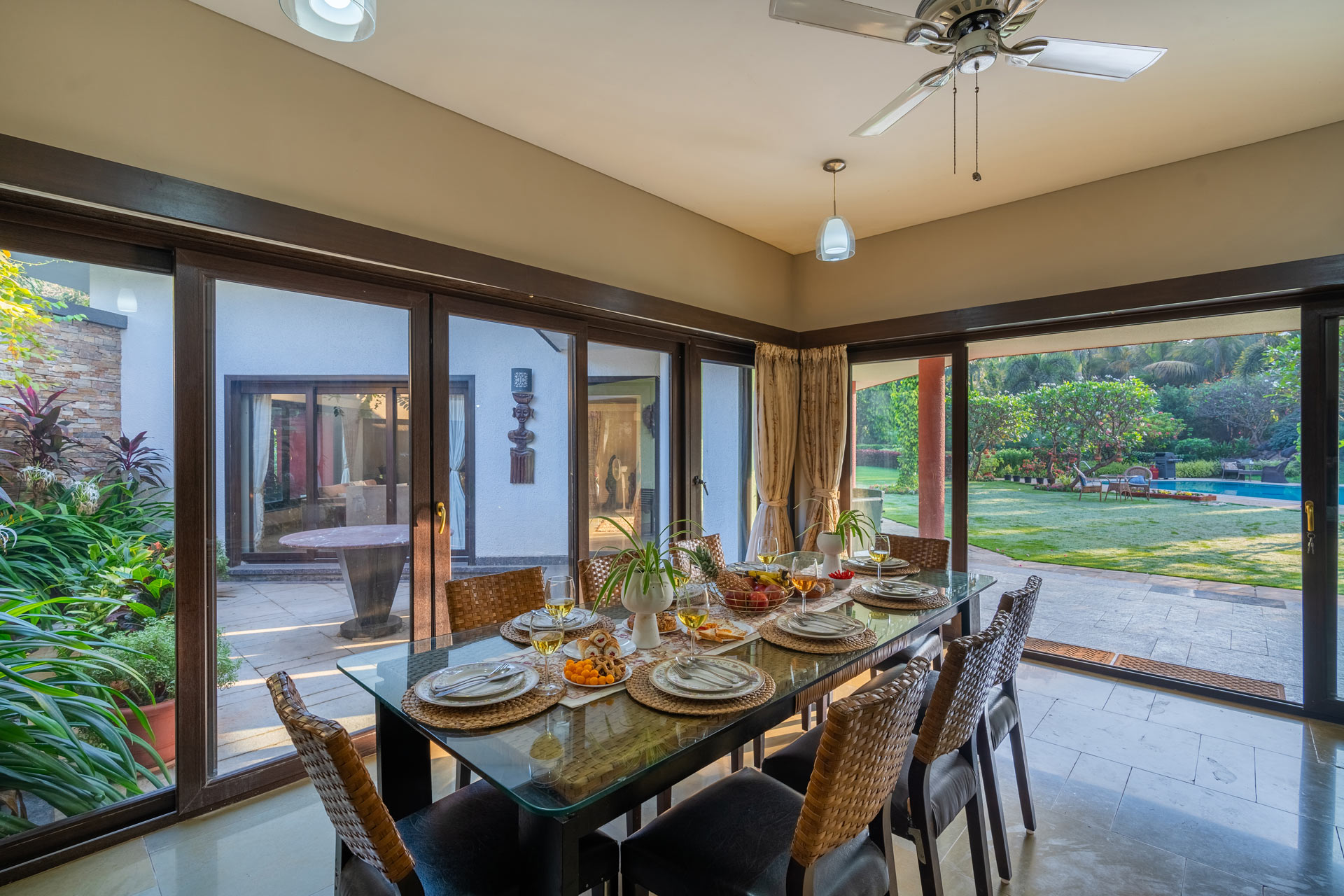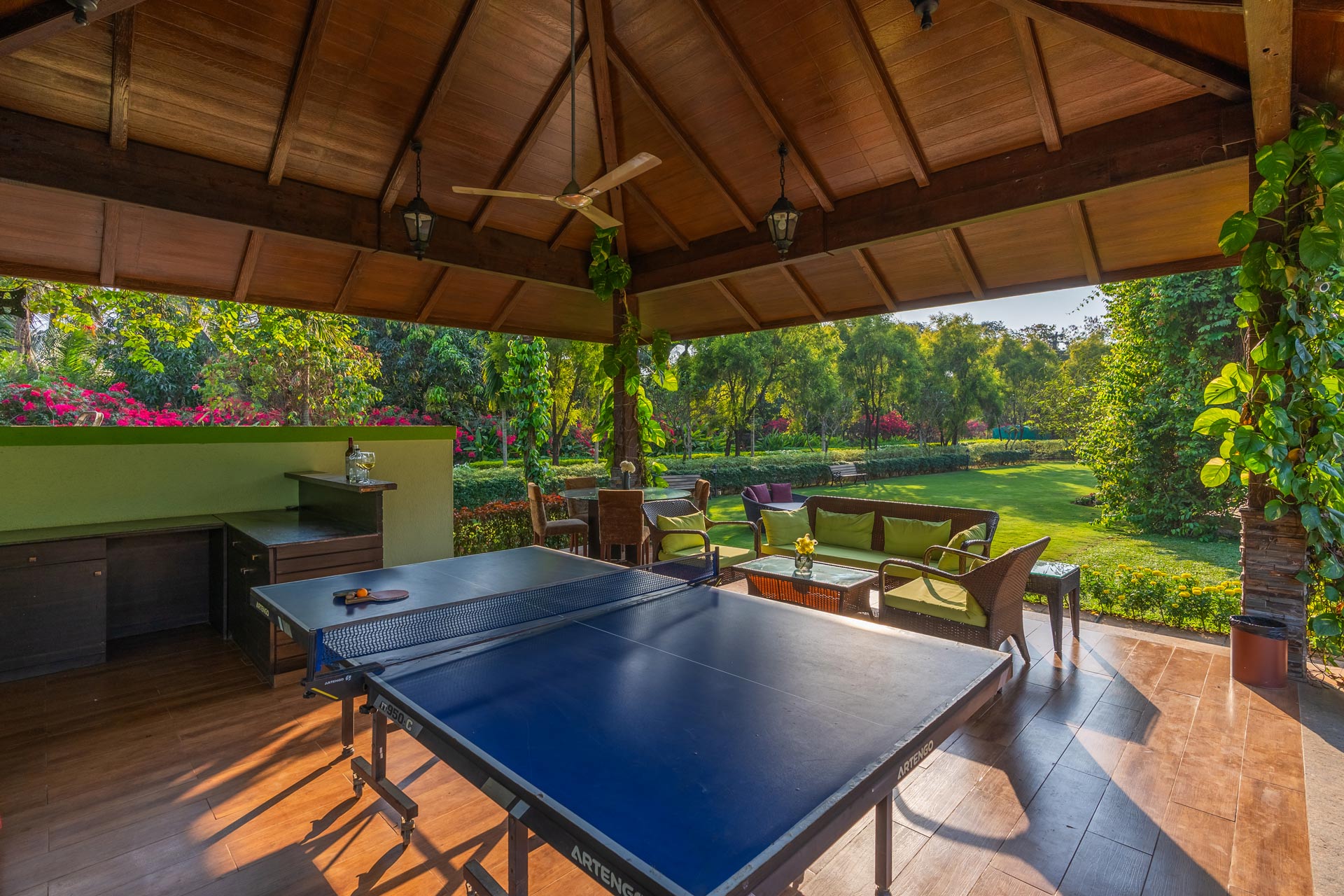 Replete with the beauty of orchards and greenery, enjoy the spectacular interiors and surroundings of this beautiful villa. Don’t get too comfortable with your solitude, as you can expect some company in the form of chirping birds and blooming bougainvilleas while the waterfalls form a soothing background score.