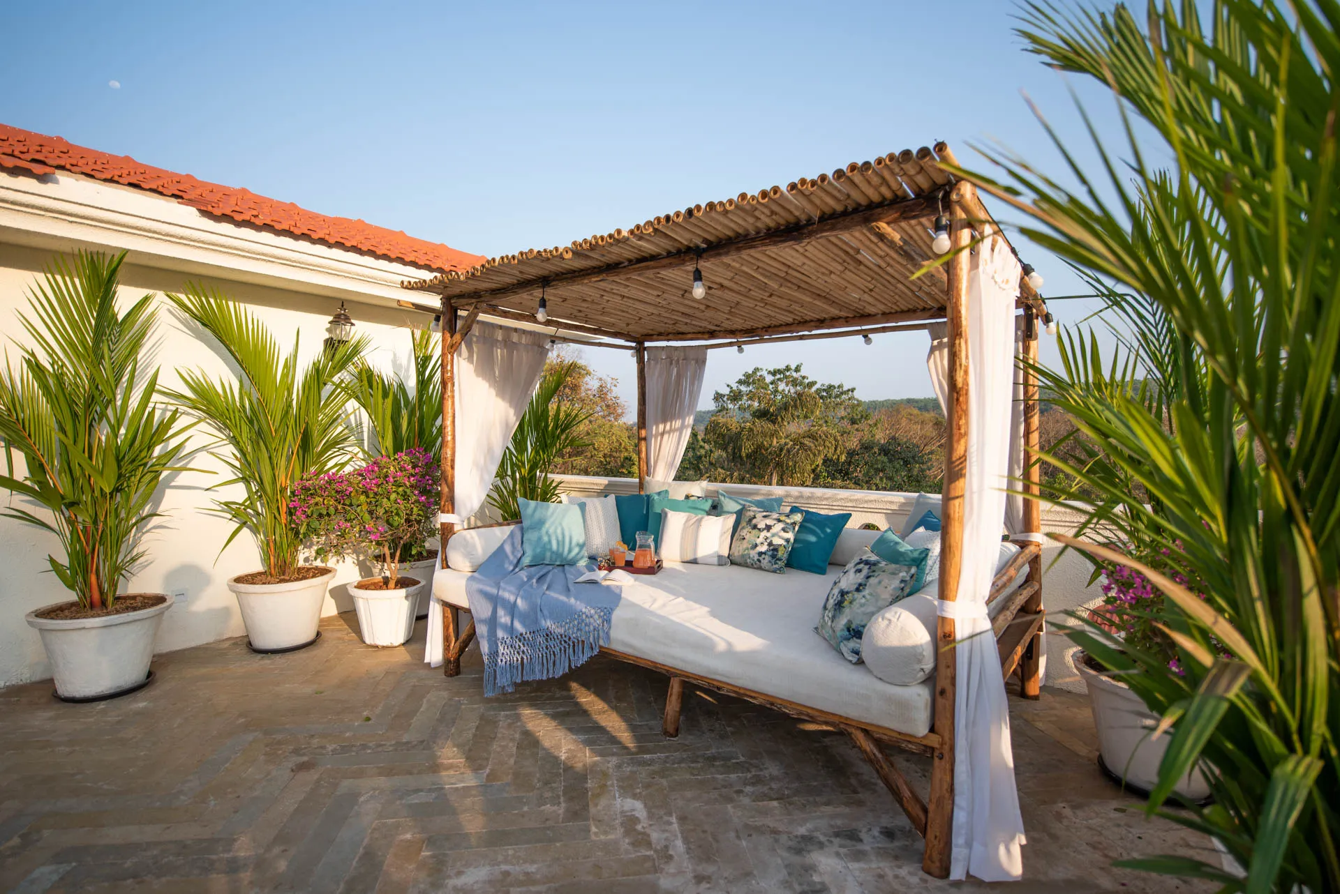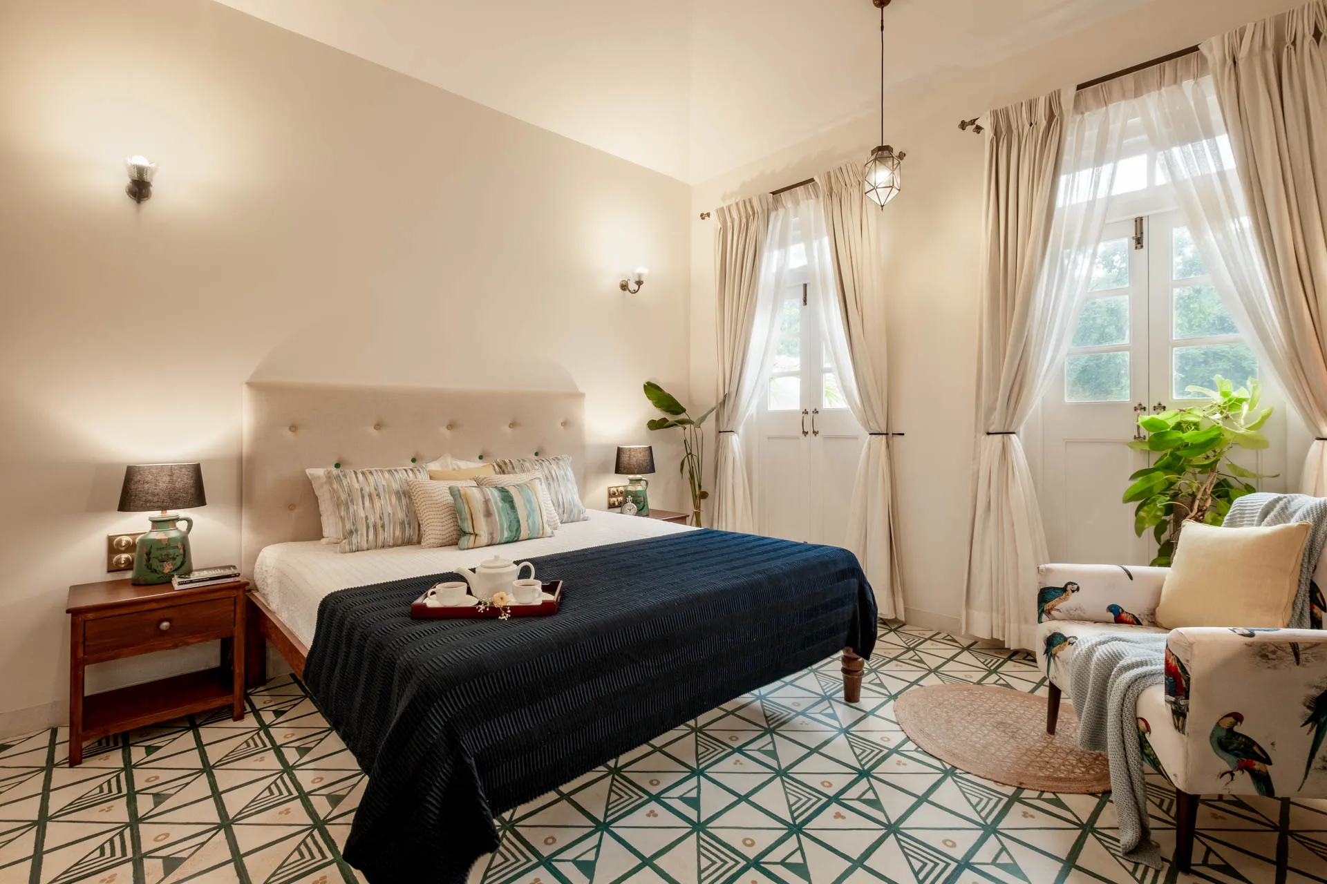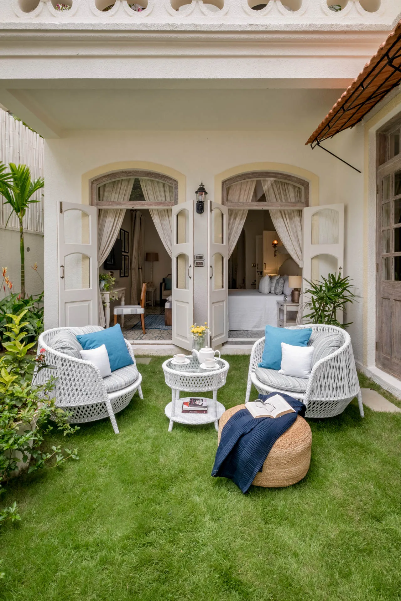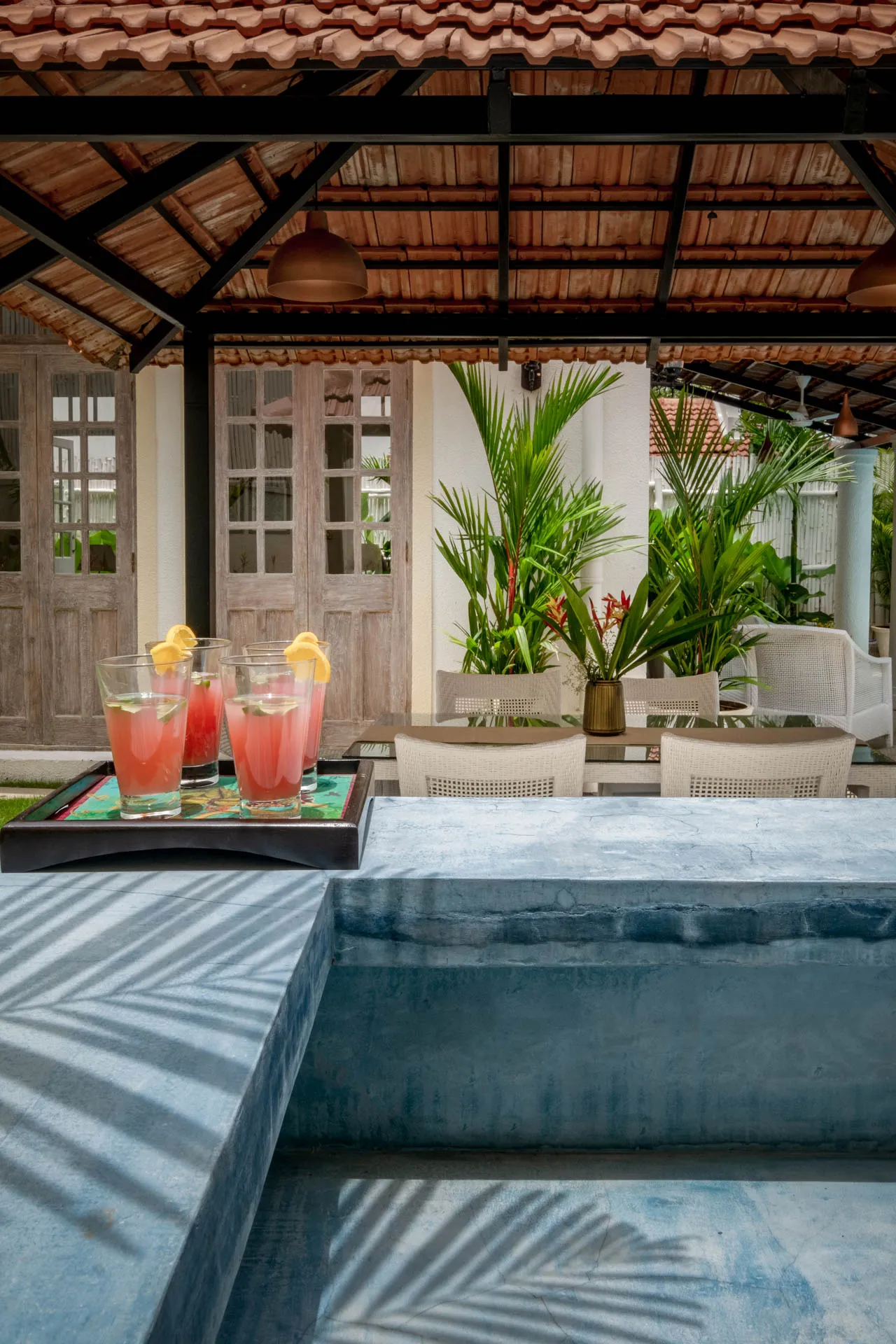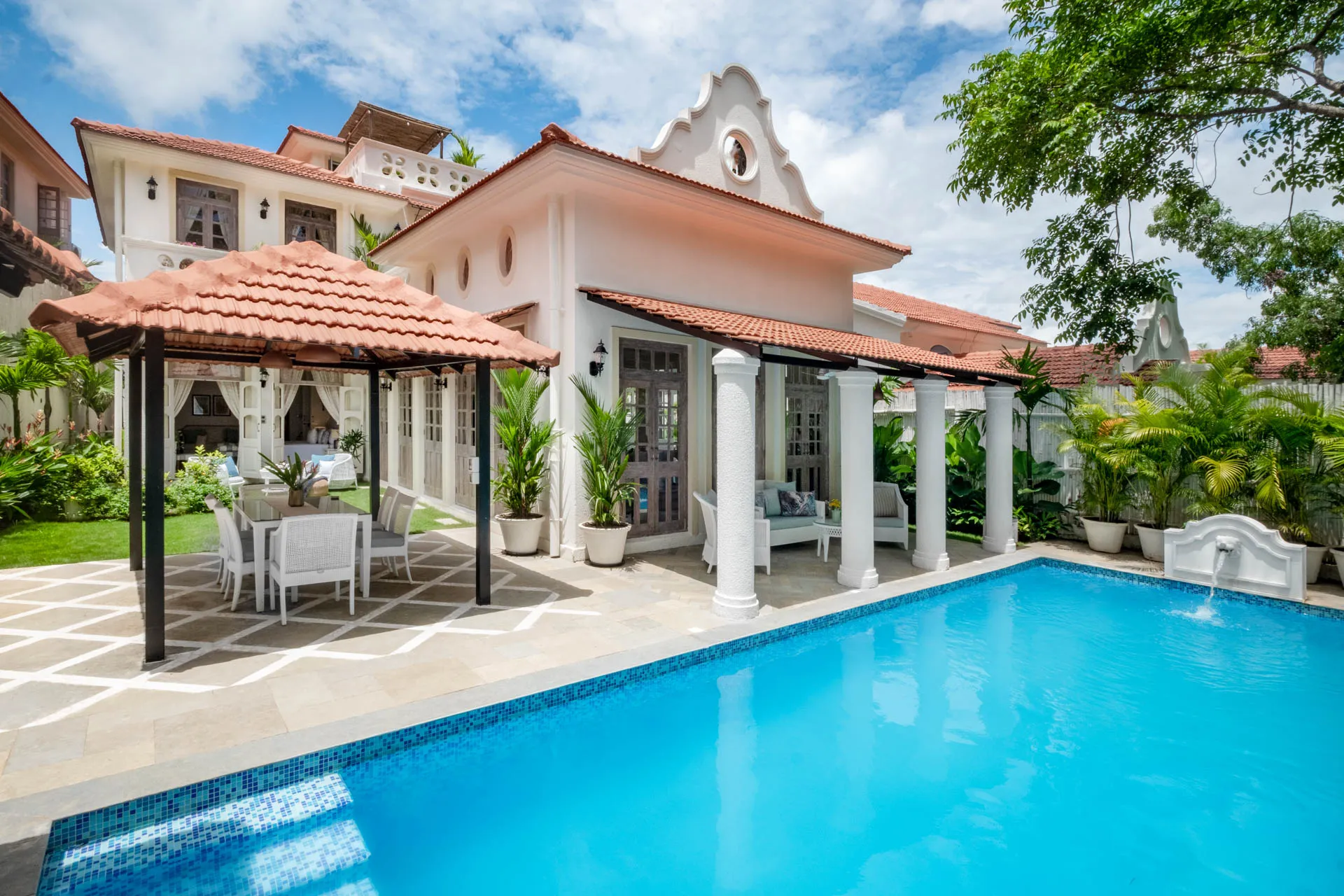 Villa Verde is a four-bedroom home located on the border of Anjuna and Assagaon. This luxury holiday home has a rectangular courtyard with the pool in the centre, three bedrooms plus a study surrounding it. Antique doors open up to an airy living room with remarkably high ceilings. The master bedroom upstairs has graphic cement tiles and a Juliette balcony which is the perfect spot to enjoy an espresso or two. Right from the outdoor deck to the alfresco dining table surrounded by exotic plants, guests who have stayed here, love Villa Verde’s common areas.