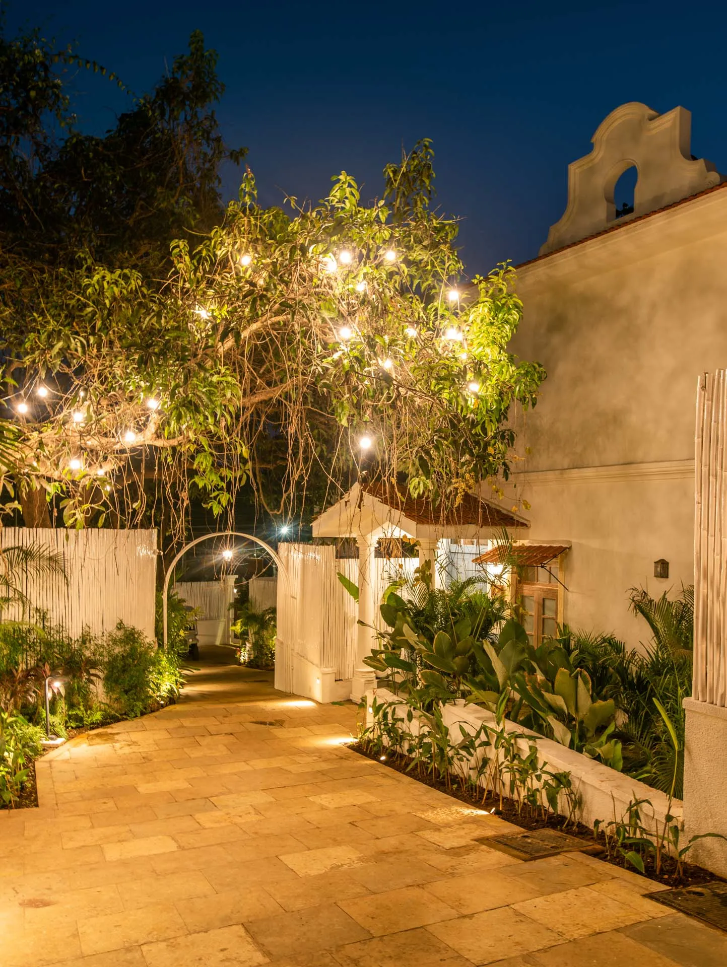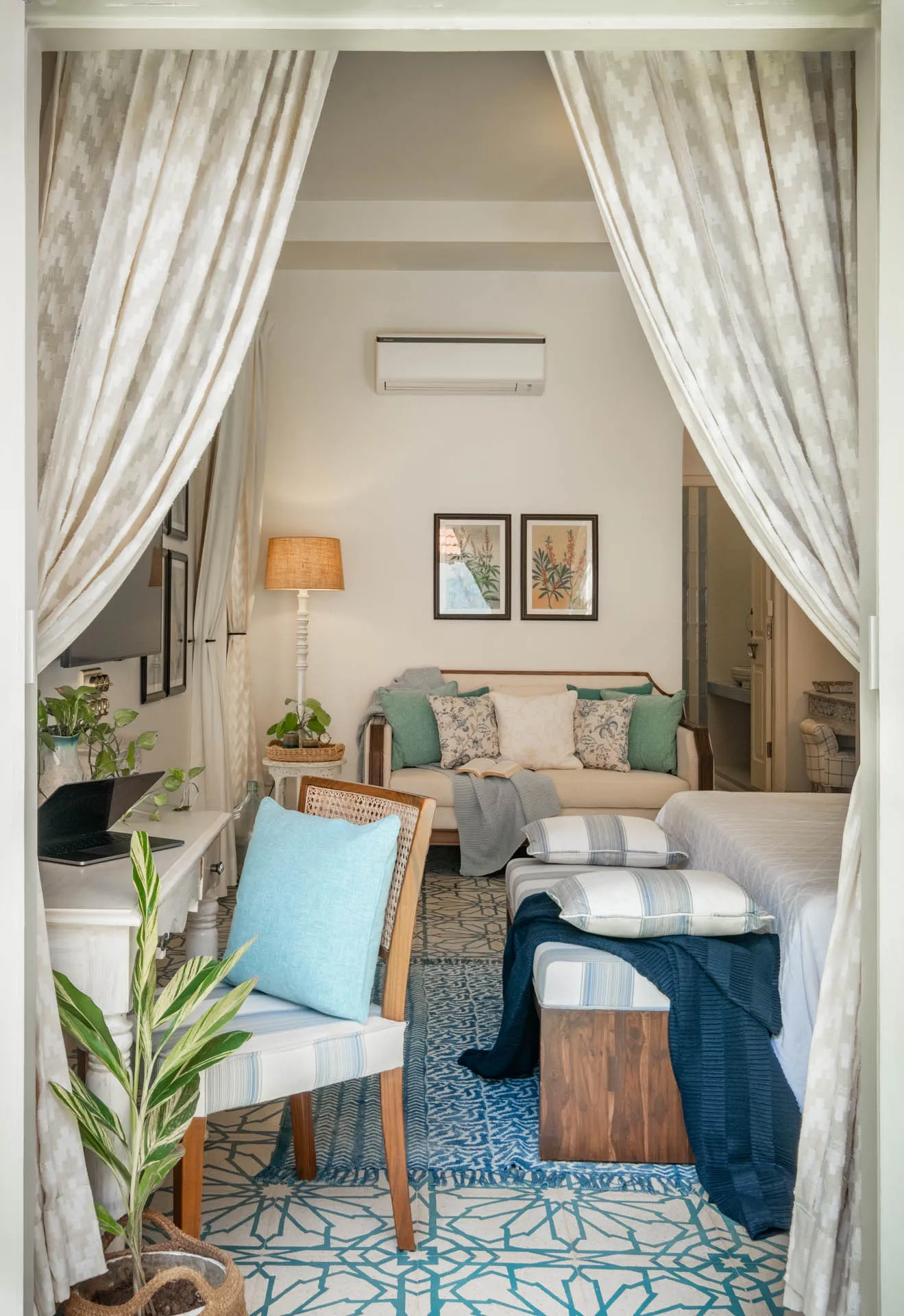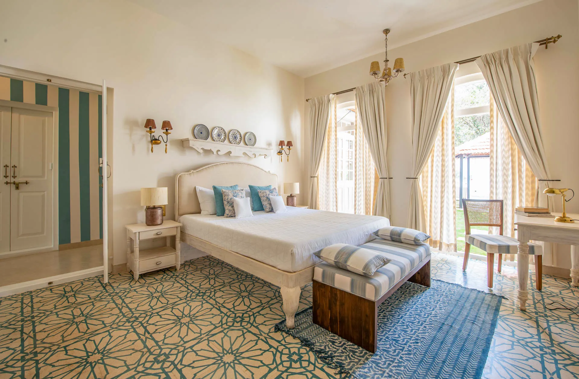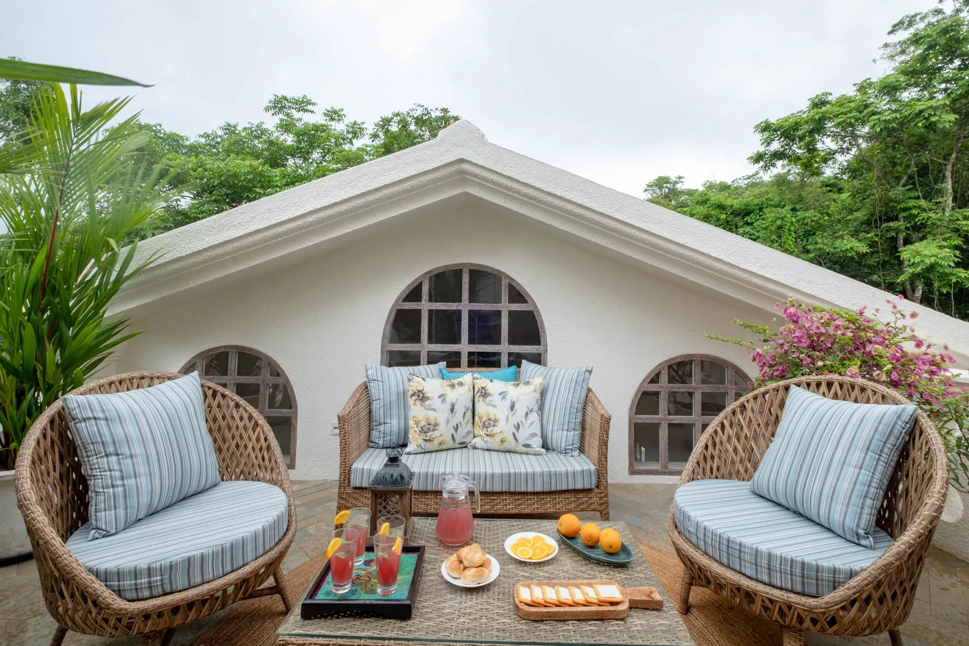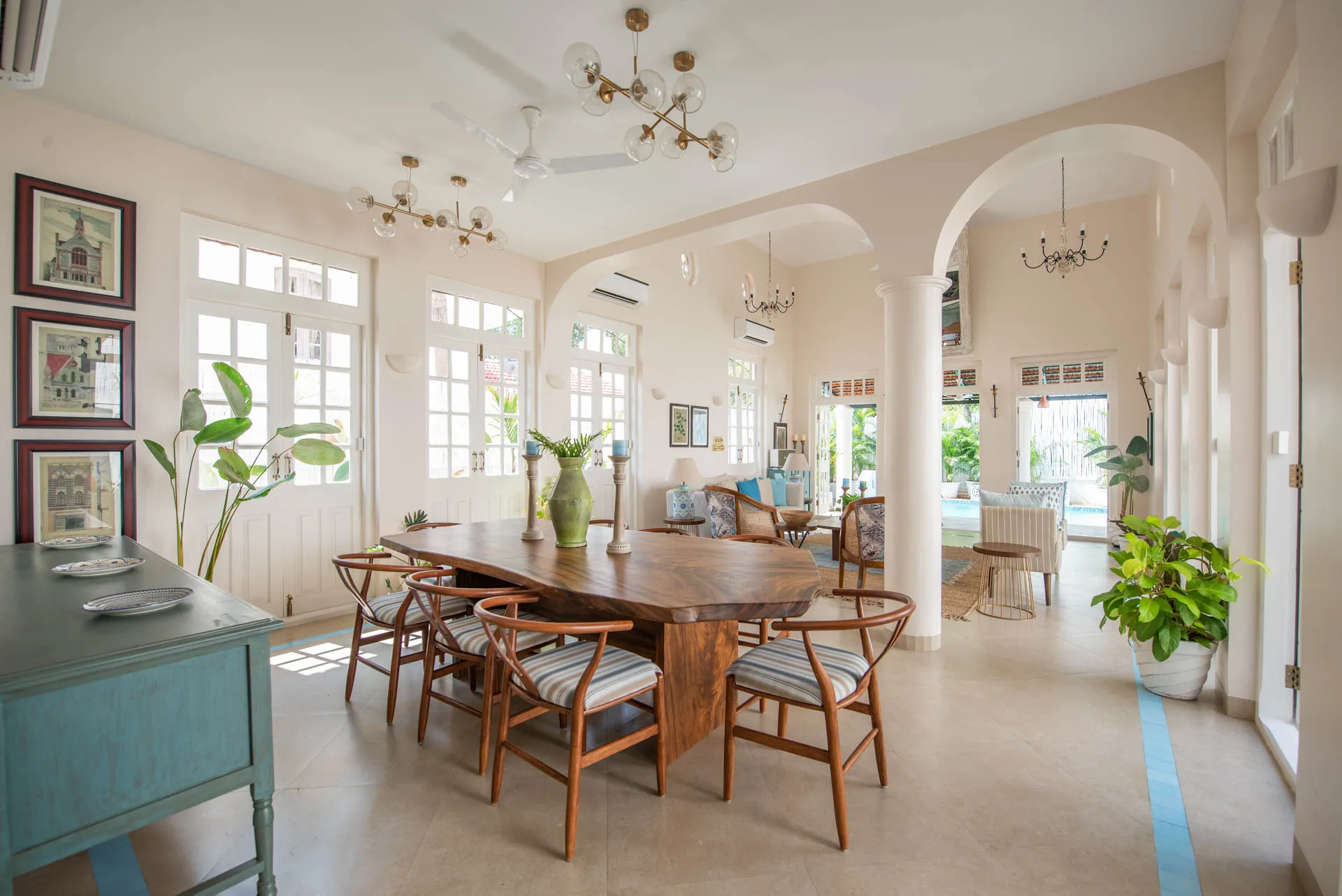 Villa Verde is a four-bedroom home located on the border of Anjuna and Assagaon. This luxury holiday home has a rectangular courtyard with the pool in the centre, three bedrooms plus a study surrounding it. Antique doors open up to an airy living room with remarkably high ceilings. The master bedroom upstairs has graphic cement tiles and a Juliette balcony which is the perfect spot to enjoy an espresso or two. Right from the outdoor deck to the alfresco dining table surrounded by exotic plants, guests who have stayed here, love Villa Verde’s common areas.