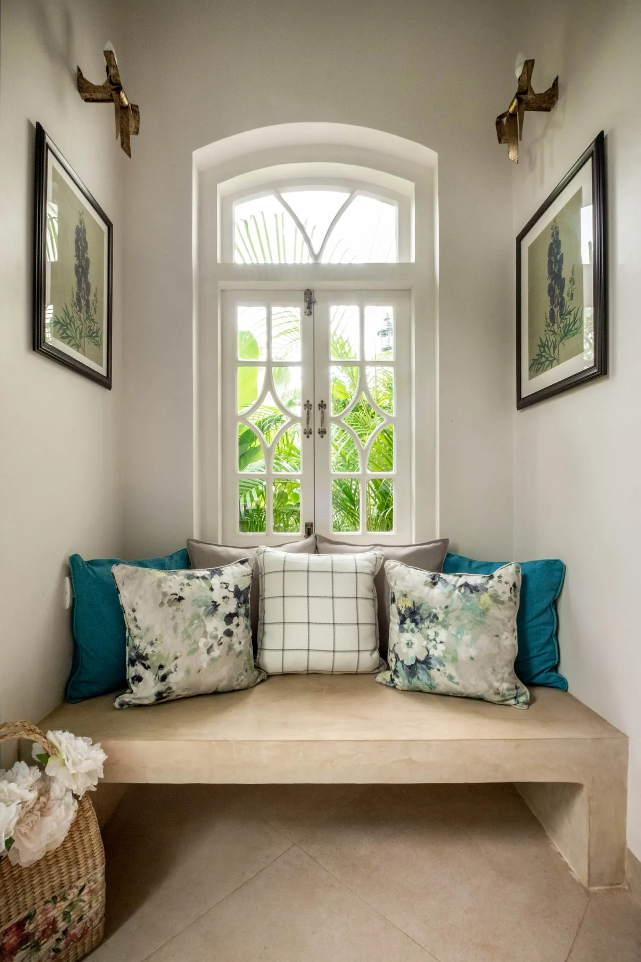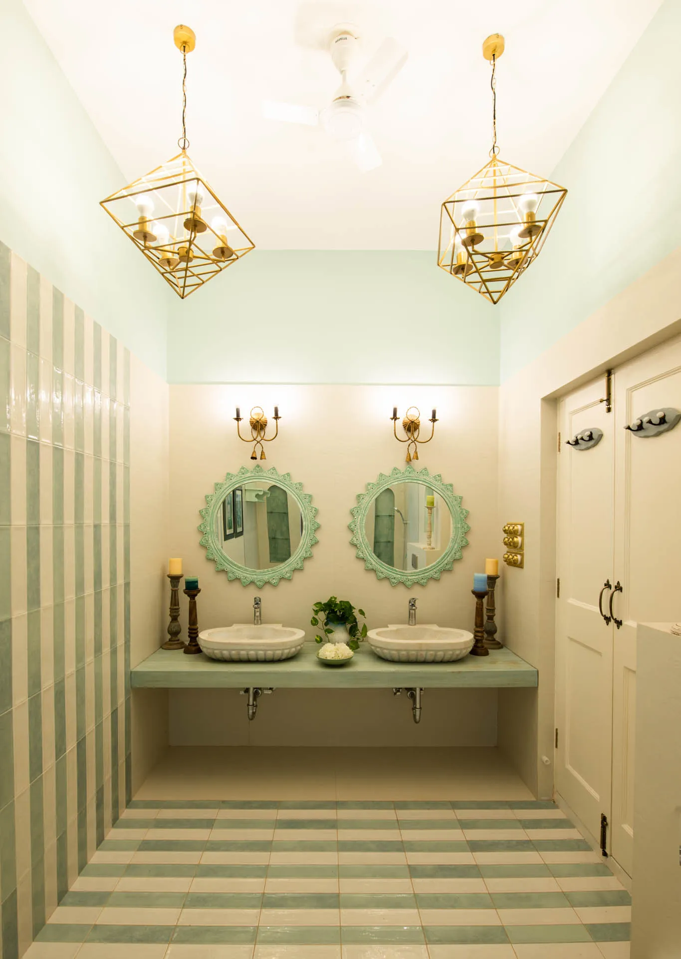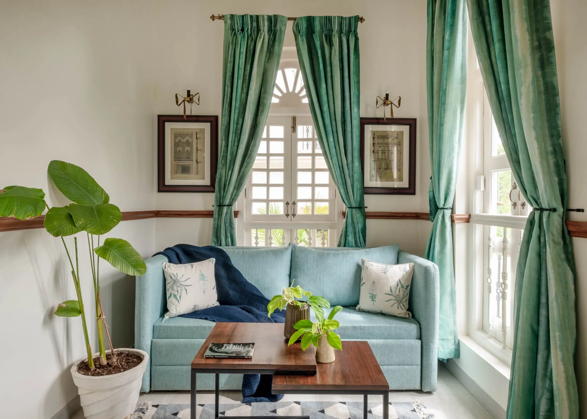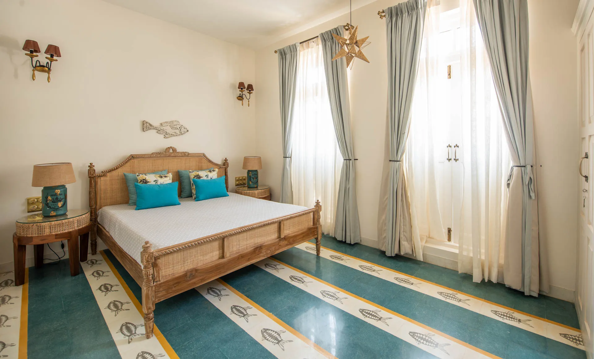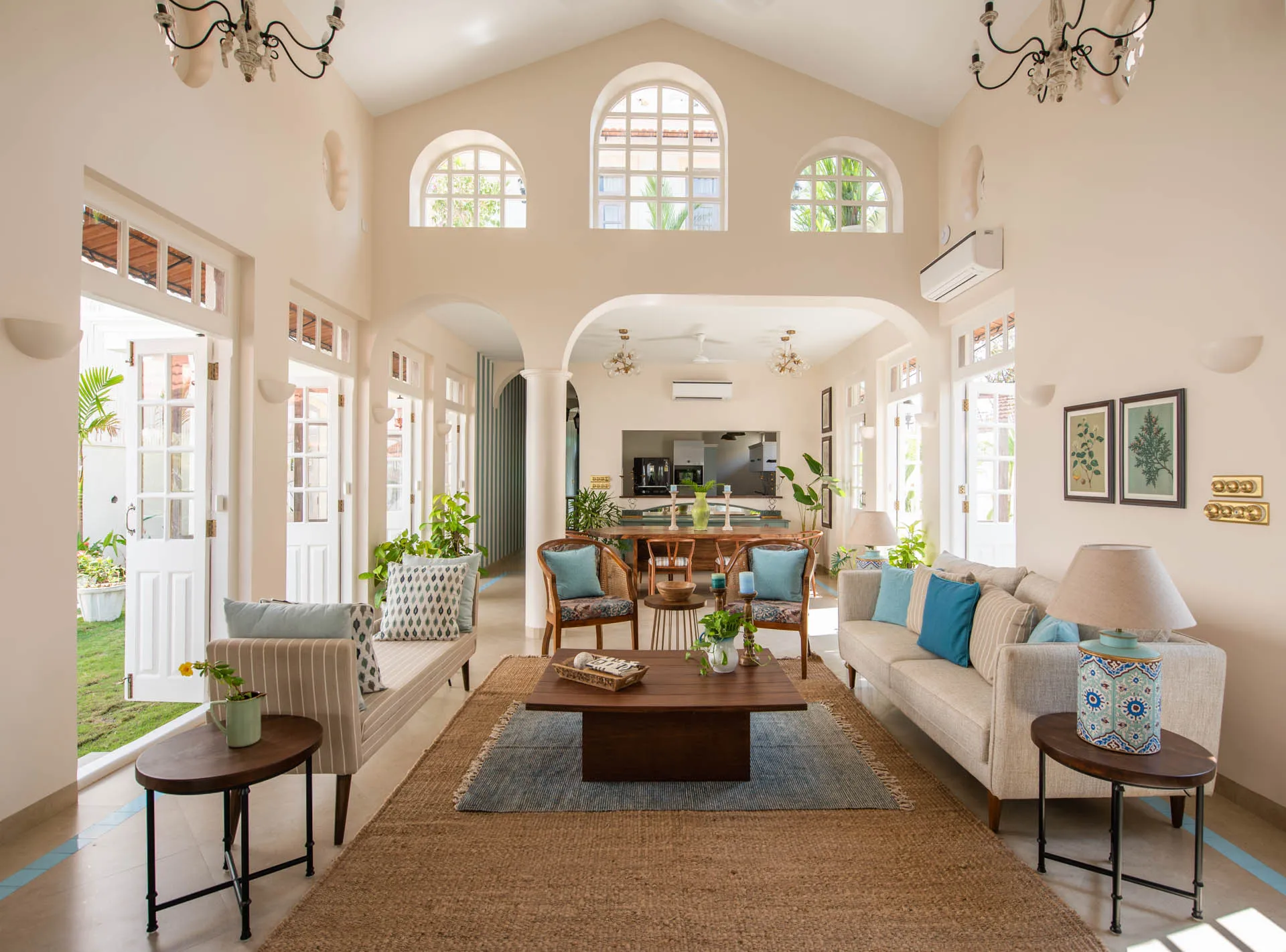 Villa Verde is a four-bedroom home located on the border of Anjuna and Assagaon. This luxury holiday home has a rectangular courtyard with the pool in the centre, three bedrooms plus a study surrounding it. Antique doors open up to an airy living room with remarkably high ceilings. The master bedroom upstairs has graphic cement tiles and a Juliette balcony which is the perfect spot to enjoy an espresso or two. Right from the outdoor deck to the alfresco dining table surrounded by exotic plants, guests who have stayed here, love Villa Verde’s common areas.
