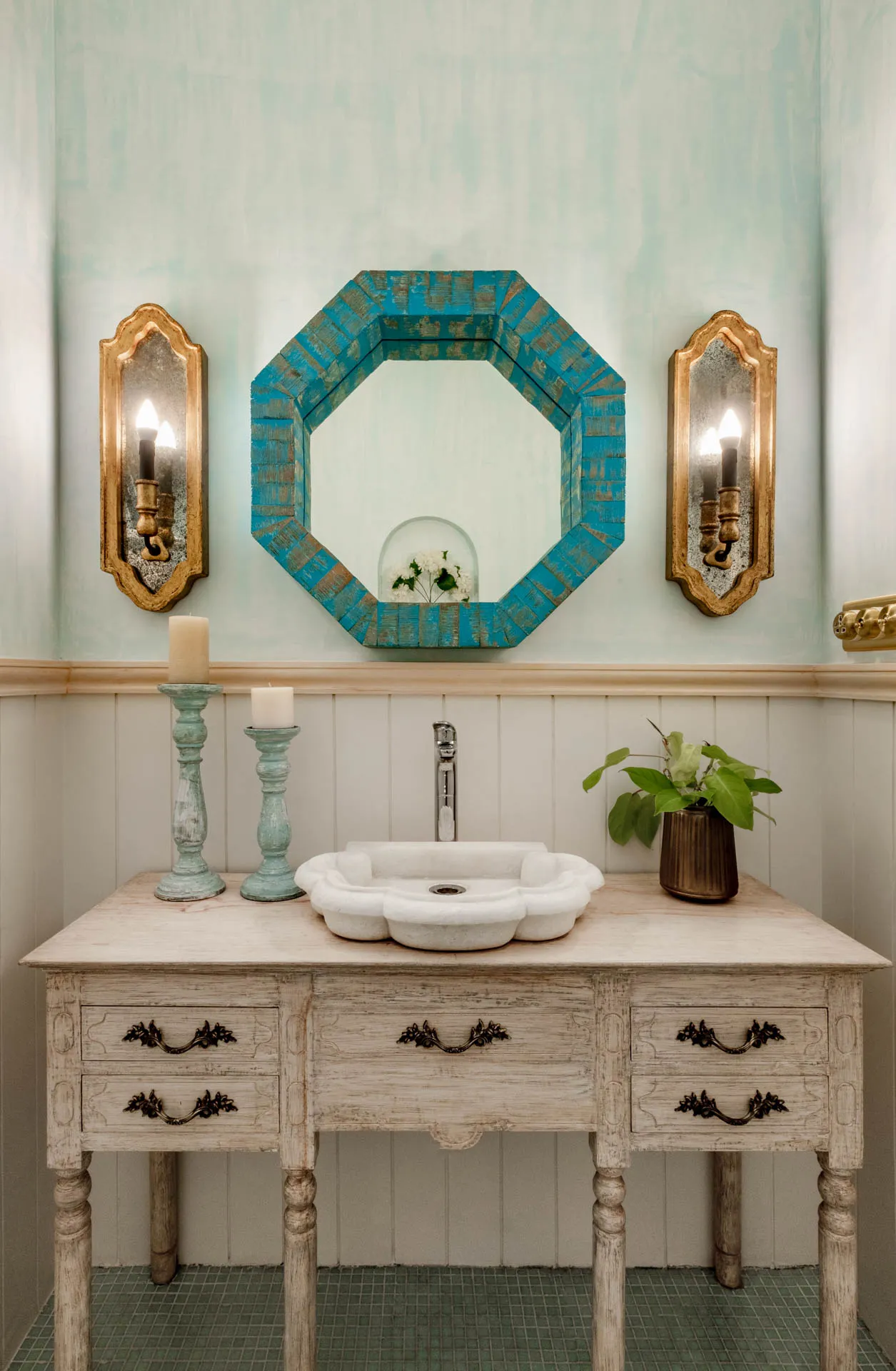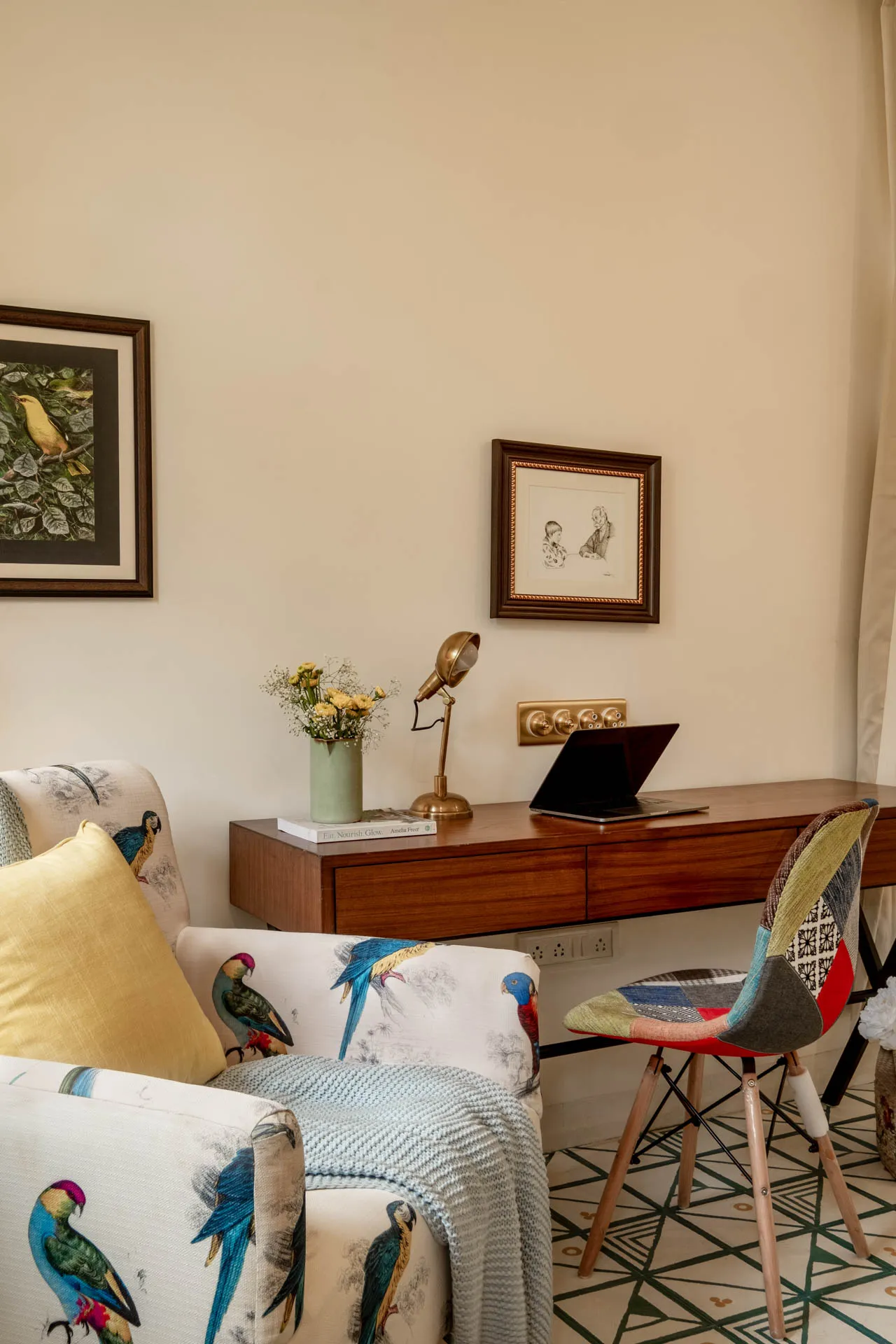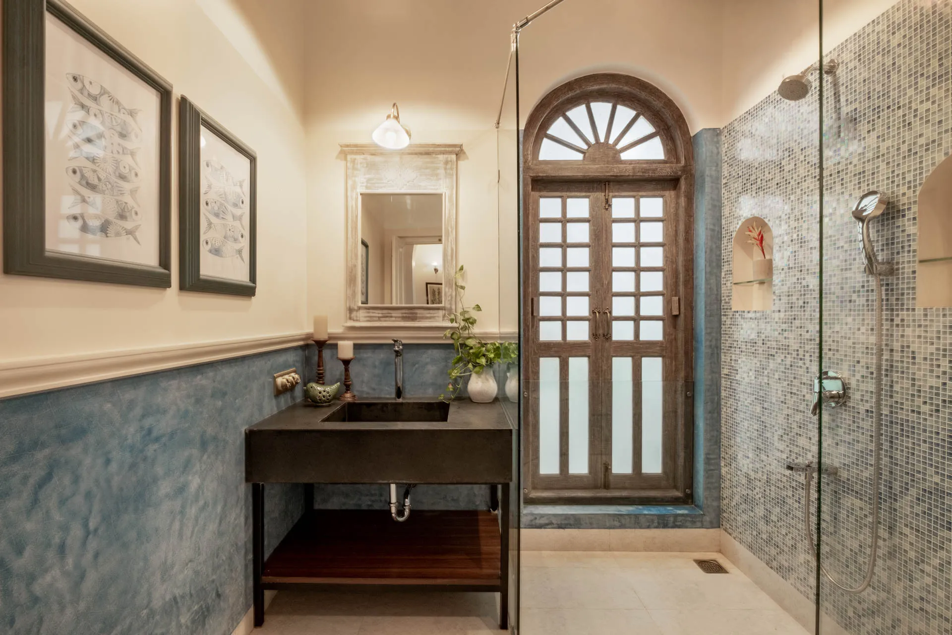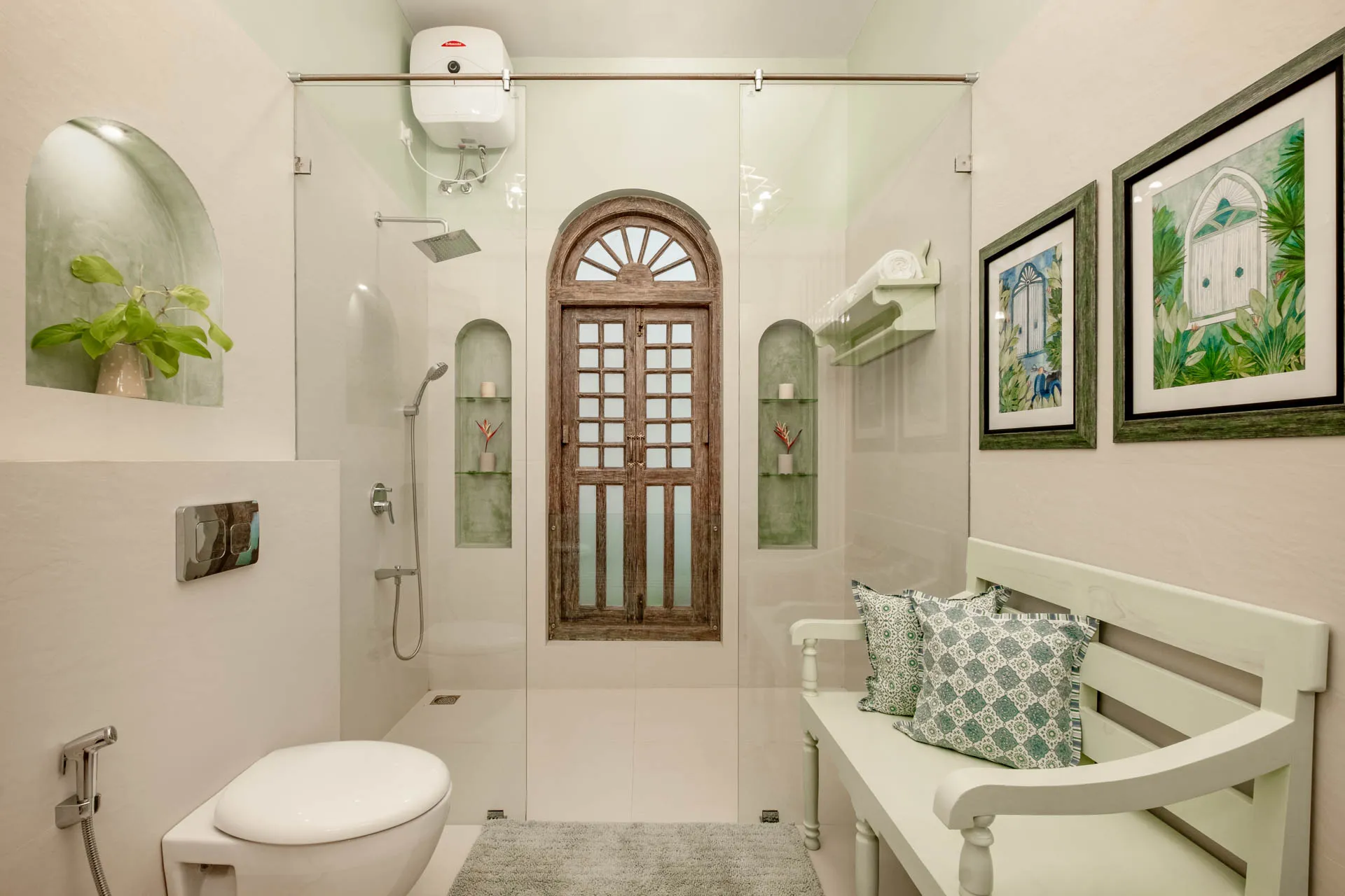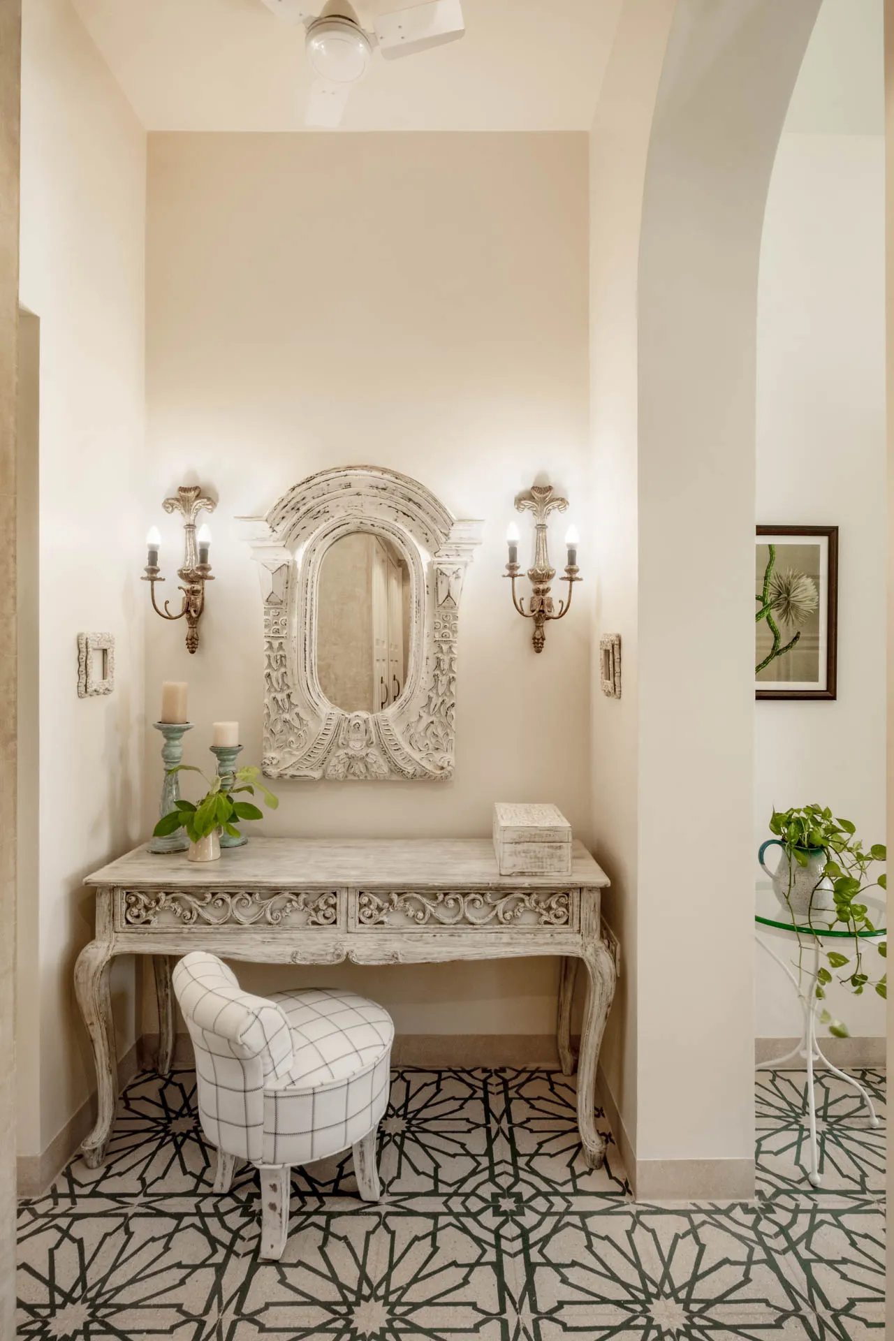 Villa Verde is a four-bedroom home located on the border of Anjuna and Assagaon. This luxury holiday home has a rectangular courtyard with the pool in the centre, three bedrooms plus a study surrounding it. Antique doors open up to an airy living room with remarkably high ceilings. The master bedroom upstairs has graphic cement tiles and a Juliette balcony which is the perfect spot to enjoy an espresso or two. Right from the outdoor deck to the alfresco dining table surrounded by exotic plants, guests who have stayed here, love Villa Verde’s common areas.