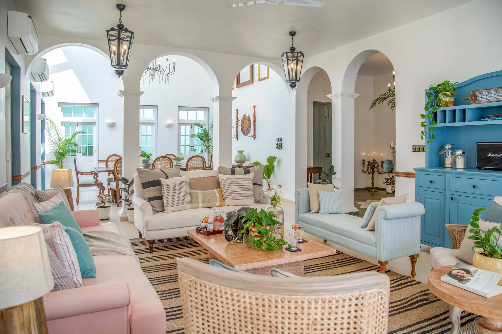 Sweeping arches, full-length windows and double-heighted spaces coupled with pastel-coloured furnishings strike the perfect balance between palatial beauty and comfort at the two-storied Villa D. Hints of Mediterranean and Portuguese design styles are visible through the 4 ensuite bedrooms as well as the charming living area which opens out to a private pool and gazebo. Cook up a storm in the fully equipped kitchen or order-in from the many trendy restaurants in the area and enjoy an al fresco meal on the cosy terrace.