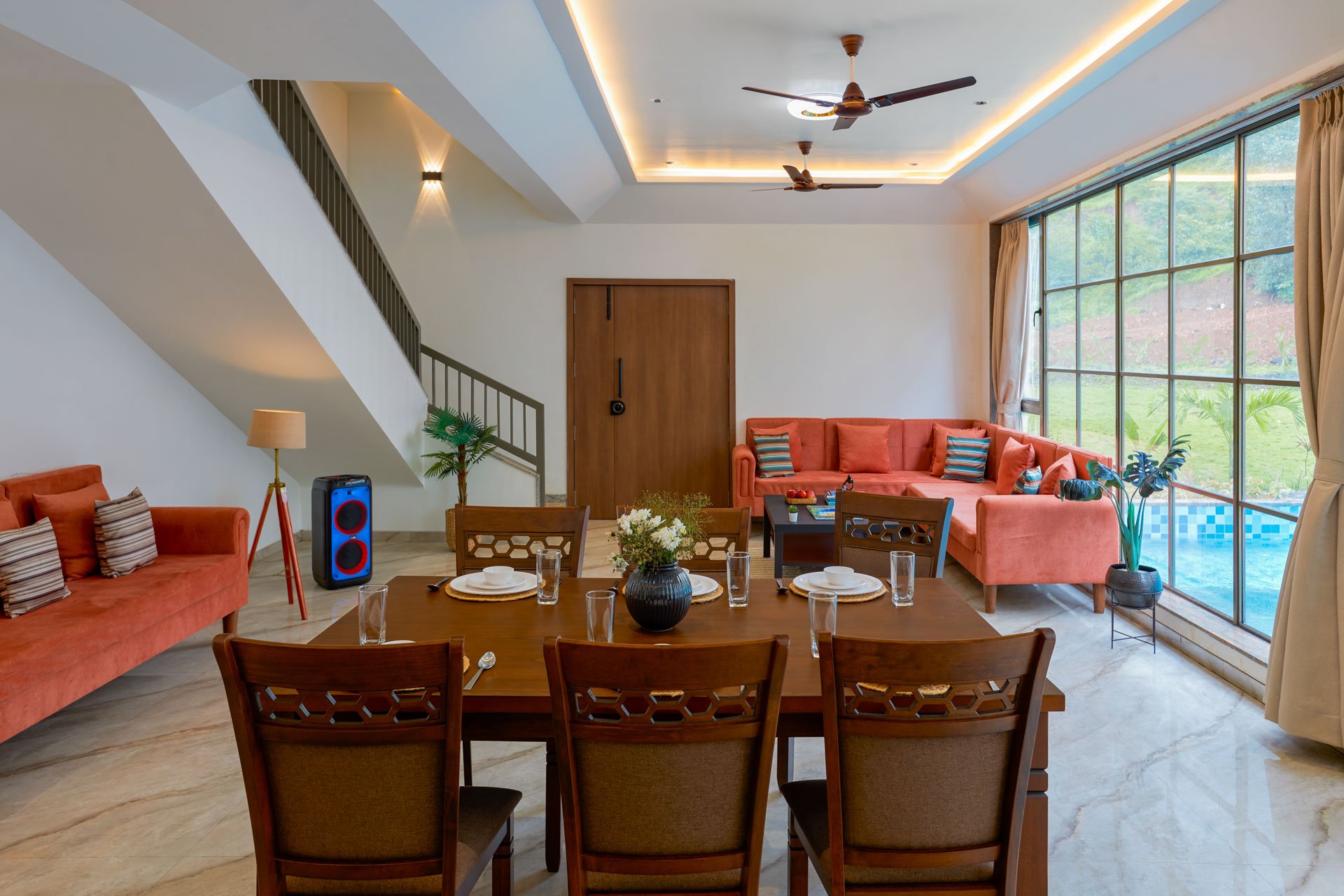Breakfast is shared with your favourite people around the big table which is full of food, laughter, and plans for the day. Some head to the pool for a refreshing dip, others unwind on the lawn or dive into a board game inside. Afternoons are meant for naps, books, or a round of indoor games. By evening, you’re gathered around the bonfire, watching the sky turn shades of pink and gold. Dinner is relaxed, stories are flowing, and as the night sets in, you’ll wonder why every day can’t feel just like this.