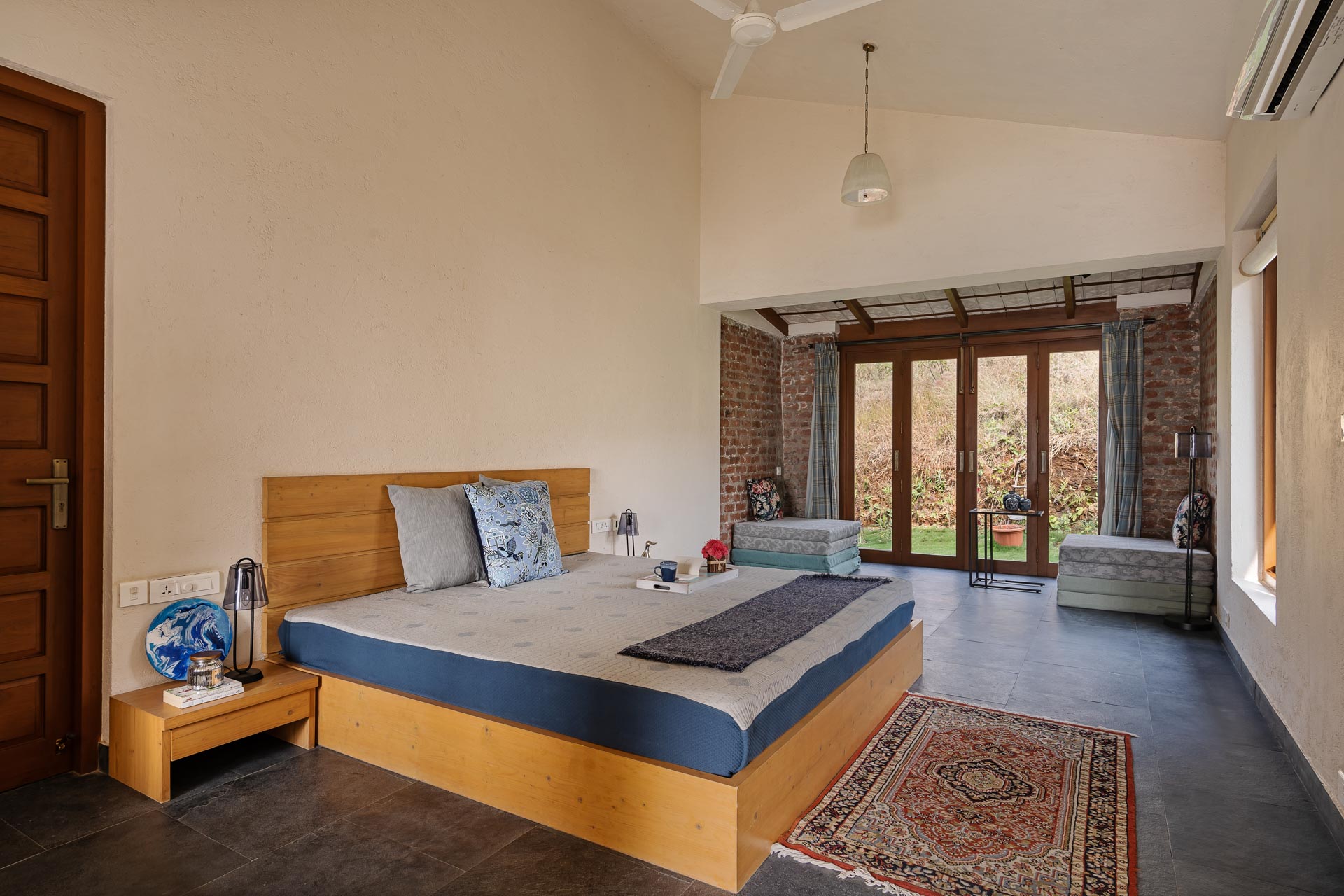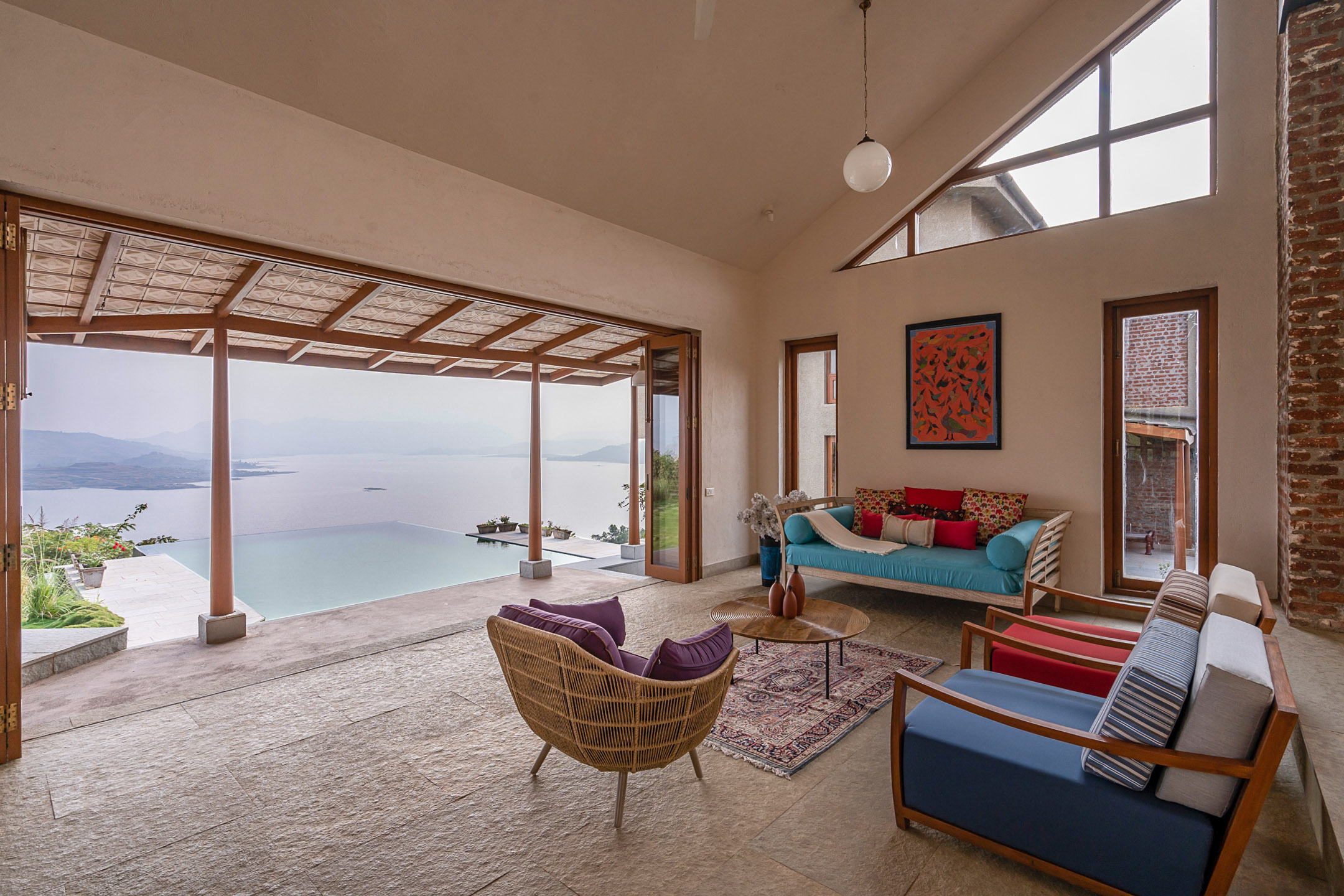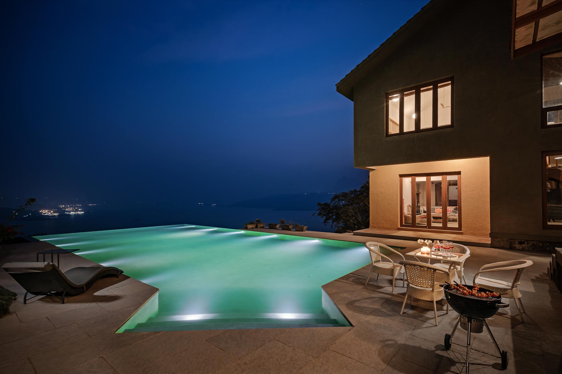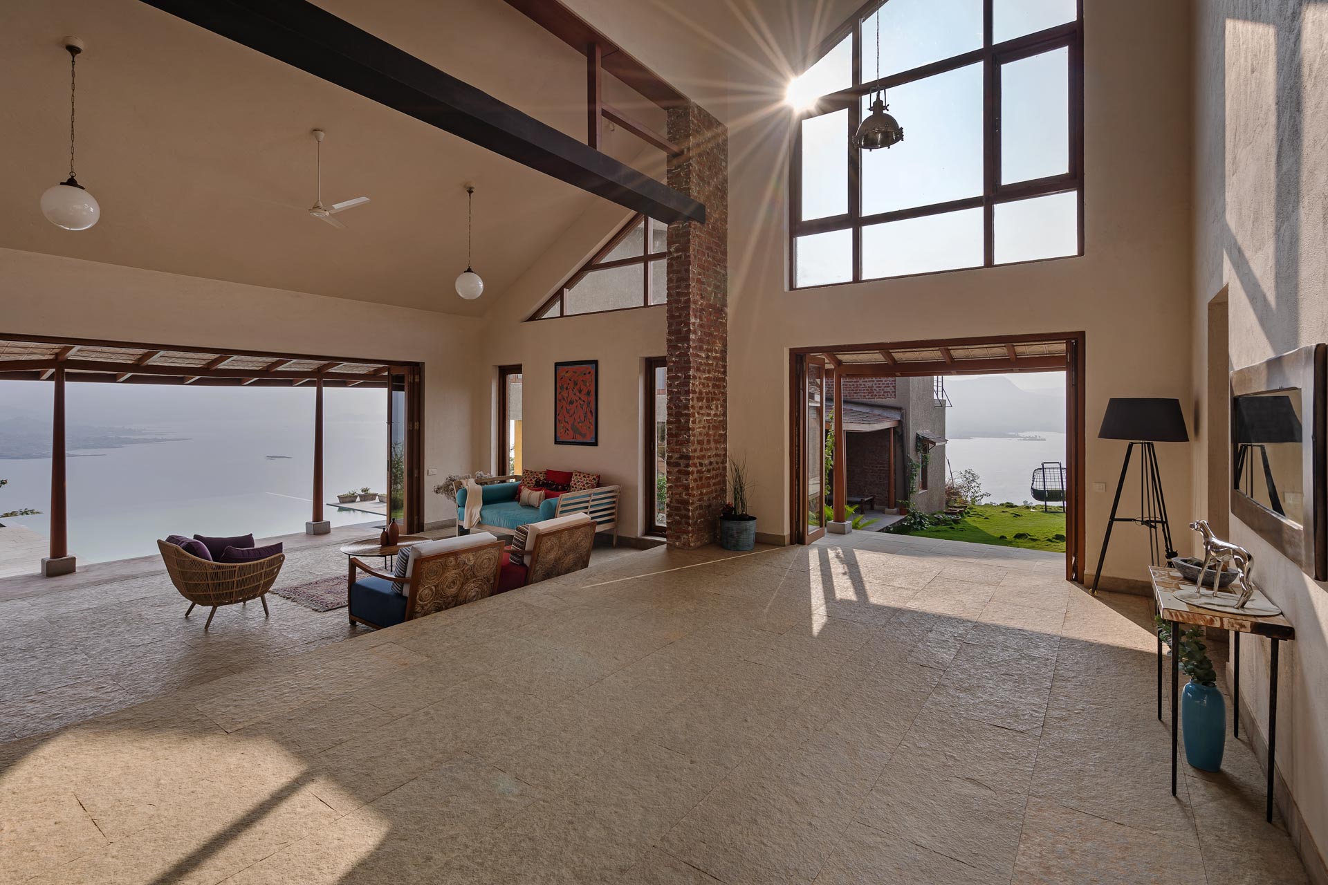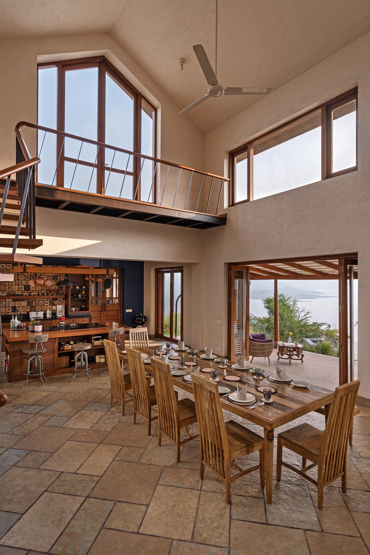 Overlooking the Sahyadris and the serene Pawna Lake, Om Anantha emerges inconspicuously with earth-toned structures. Following the meandering terrain, the 4-bedroom home comprises independent living and bedroom blocks that allow for maximum privacy and a splendid infinity pool that will take your breath away. The living and dining area, with its double-height ceiling, allows the sun to intermingle and cast beautiful shadows throughout the day while offering picture-perfect views of the outdoors. From open-air bathrooms to beautiful decks and patios, the bedrooms are perfect for those lazy, breezy afternoons. Truly unwind and disconnect from city life at Om Anantha as you bask in the peaceful atmosphere and make the most of stellar service. And if you’re looking for some excitement, you can head out to conquer the nearby forts of Tungi, Tikona or Lohagad.