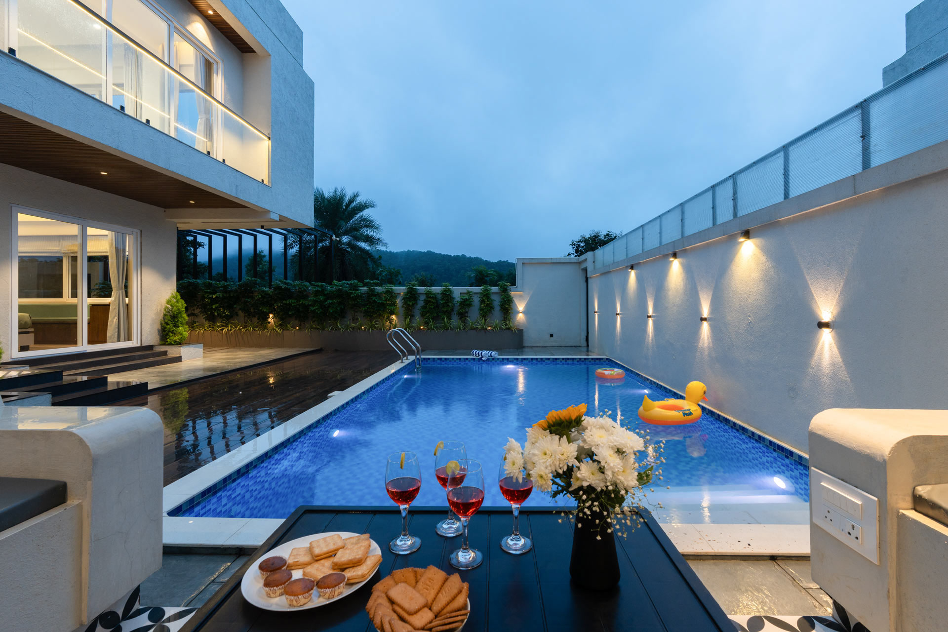 As evening falls, the villa comes alive with warmth. The hills in the distance glow softly, making the perfect backdrop for your night.