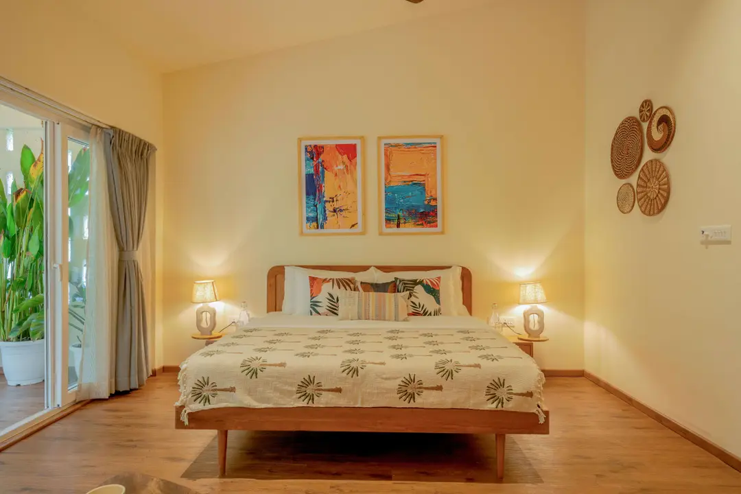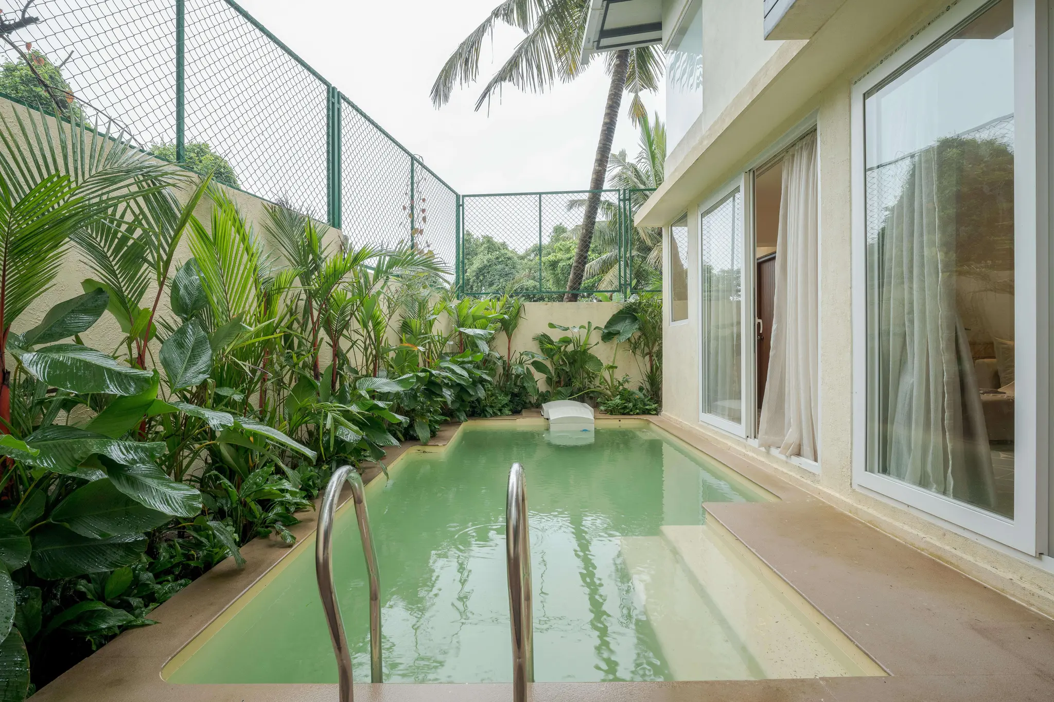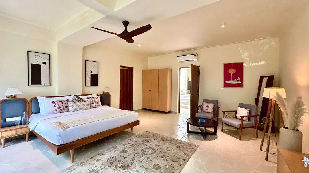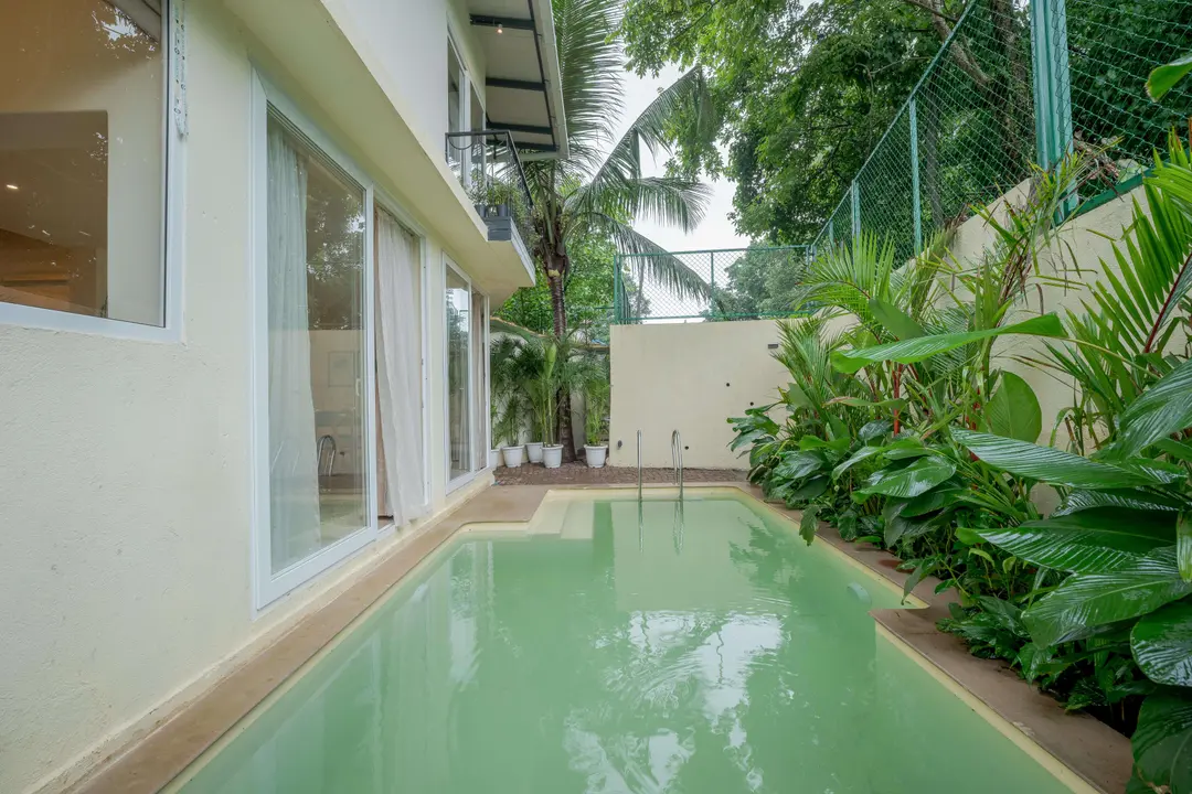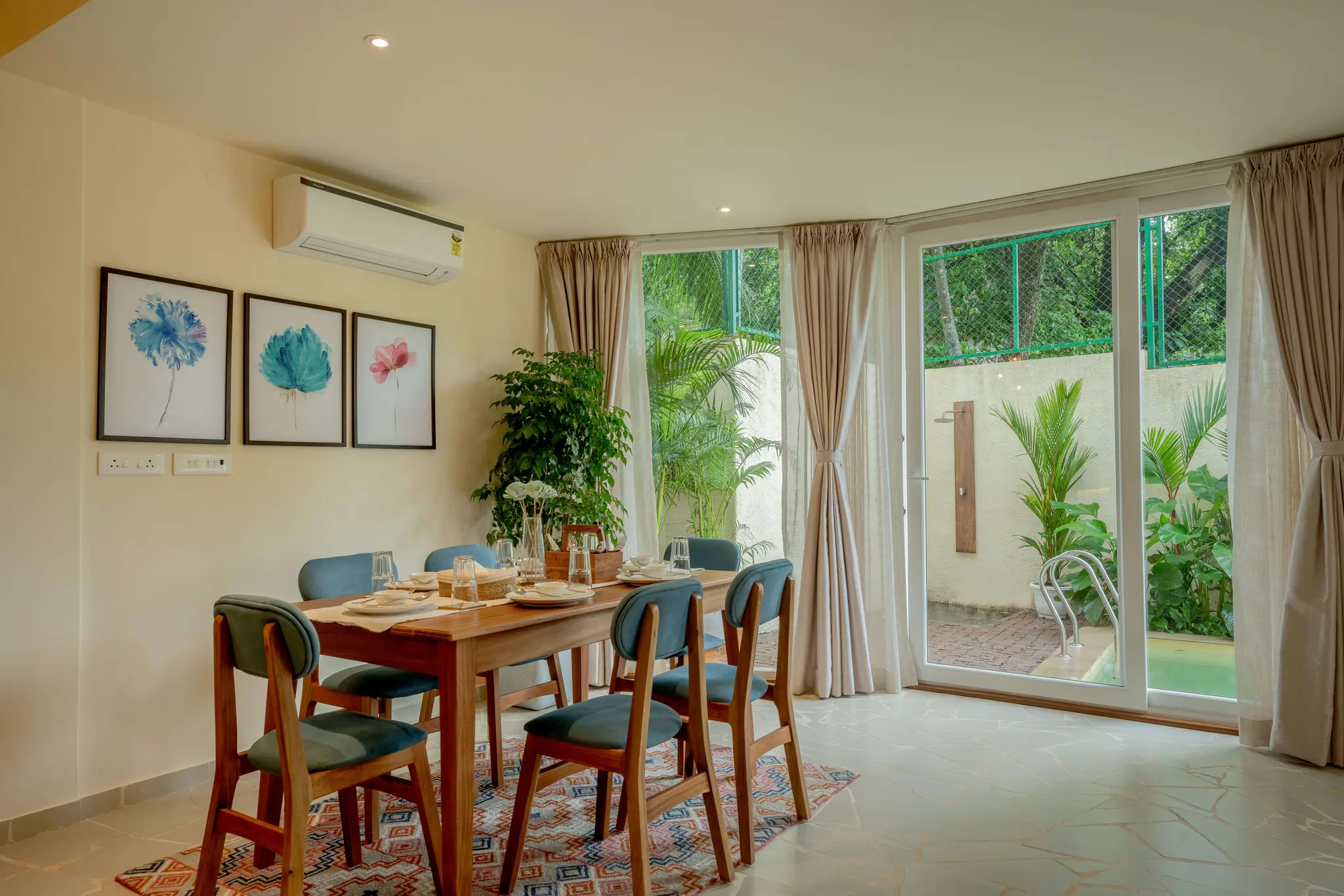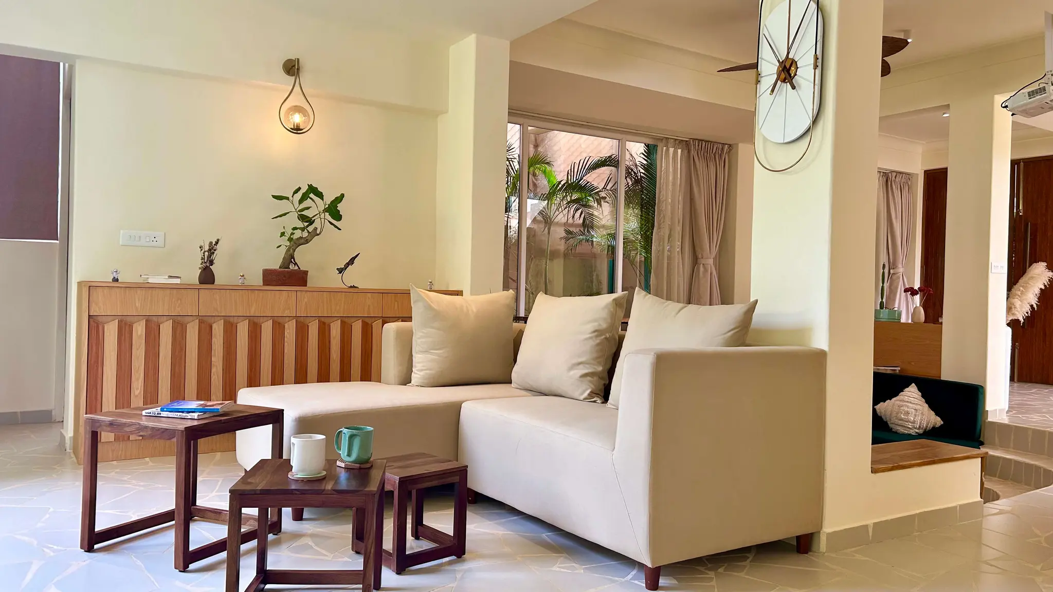 Just 800 meters from Vagator Beach and 900 meters from Chapora Fort, Oslo is a stylish, pet-friendly luxury villa offering warm Pinterest-inspired interiors, a glowing tropical pool, and sunken seating with a projector for unforgettable movie nights.