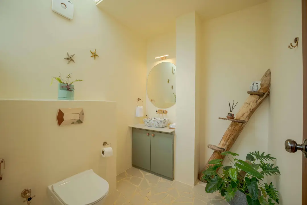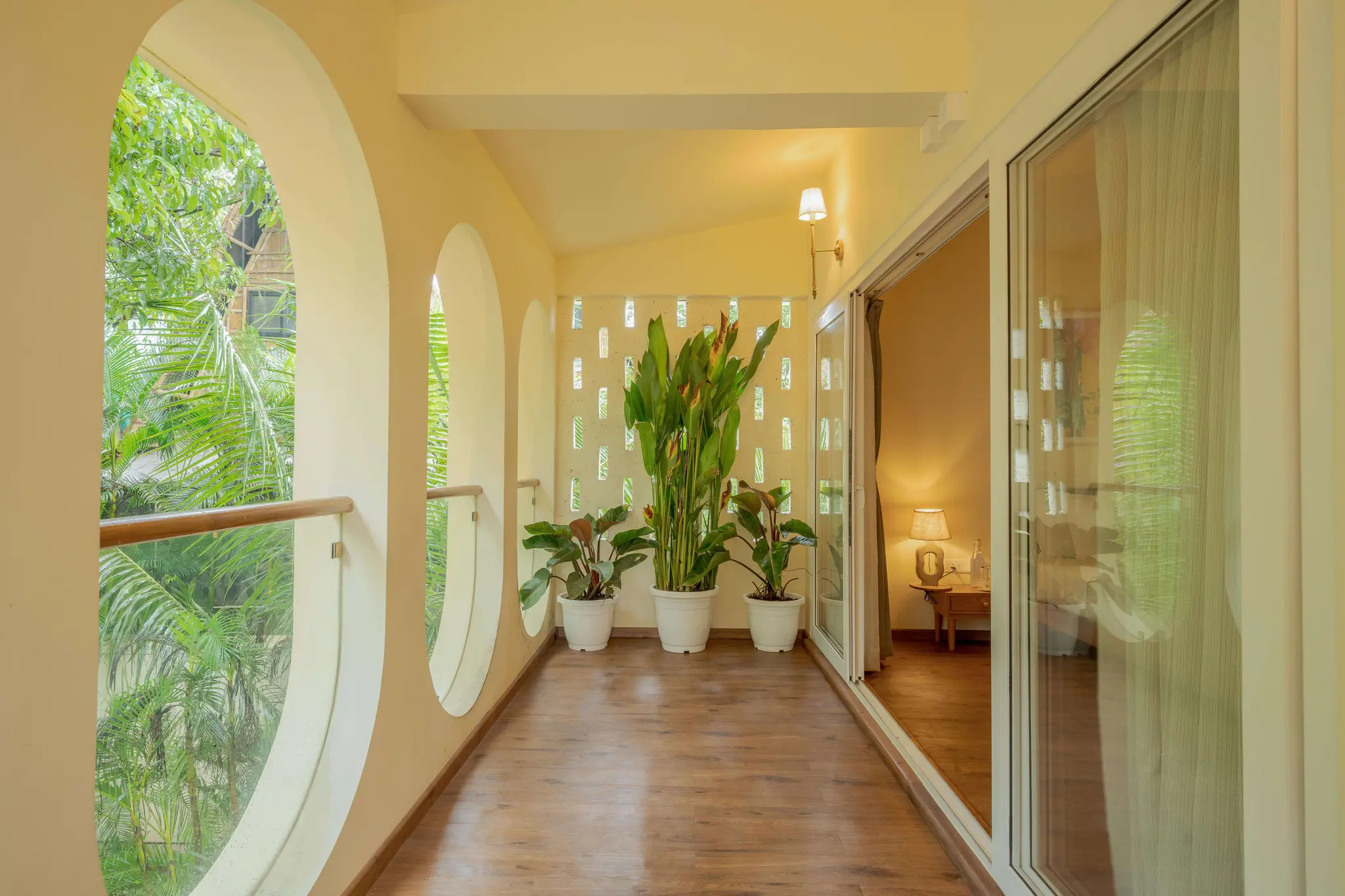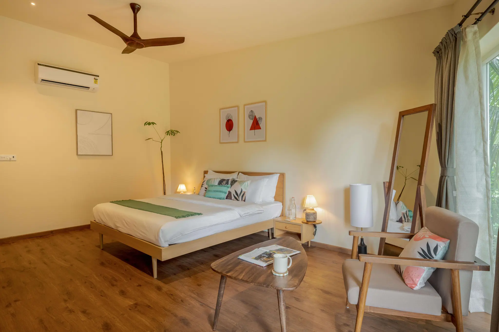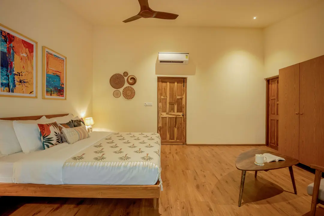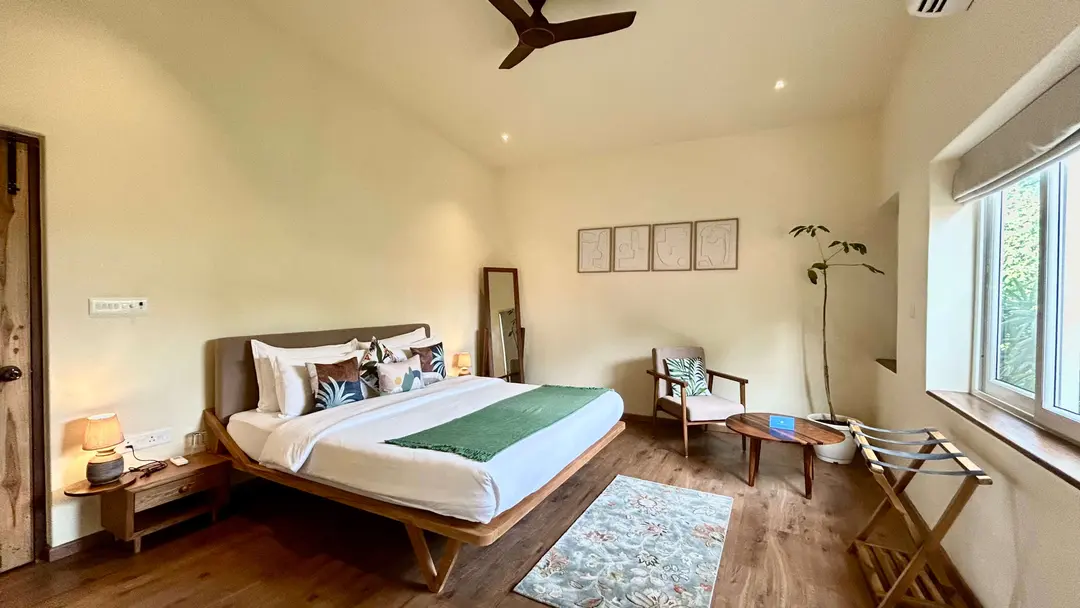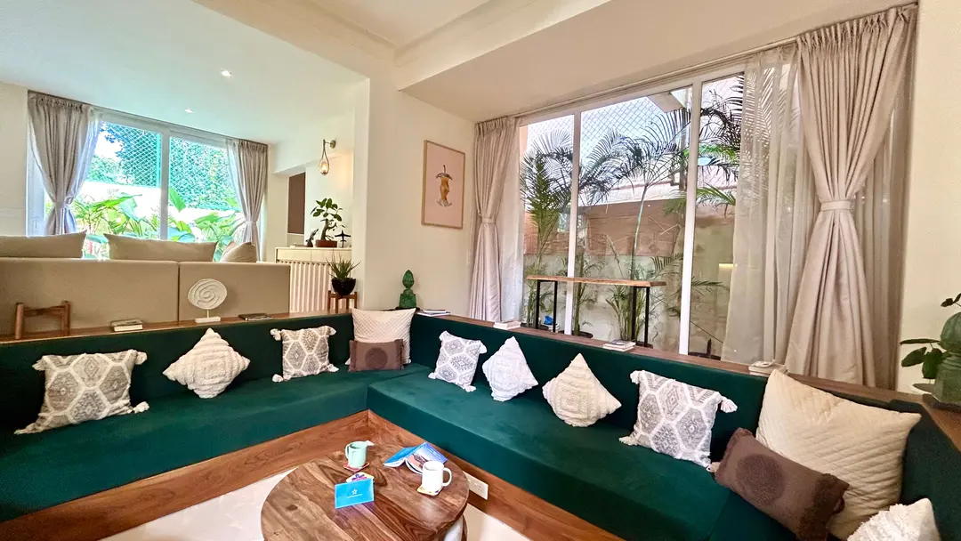 Just 800 meters from Vagator Beach and 900 meters from Chapora Fort, Oslo is a stylish, pet-friendly luxury villa offering warm Pinterest-inspired interiors, a glowing tropical pool, and sunken seating with a projector for unforgettable movie nights.