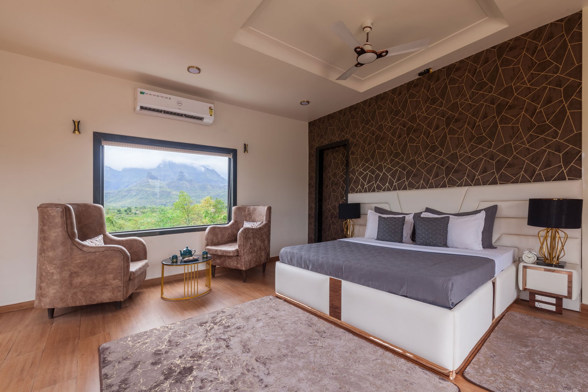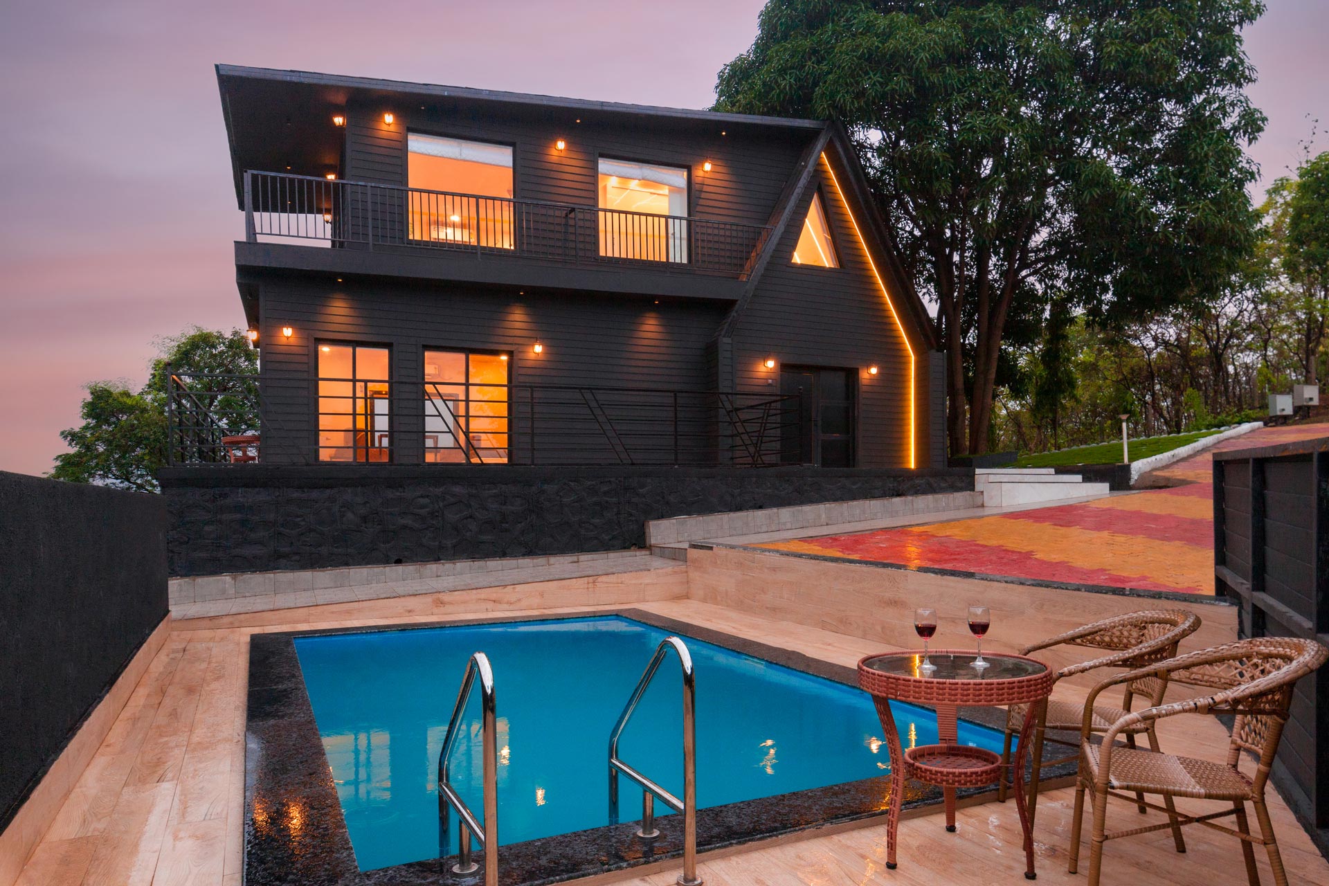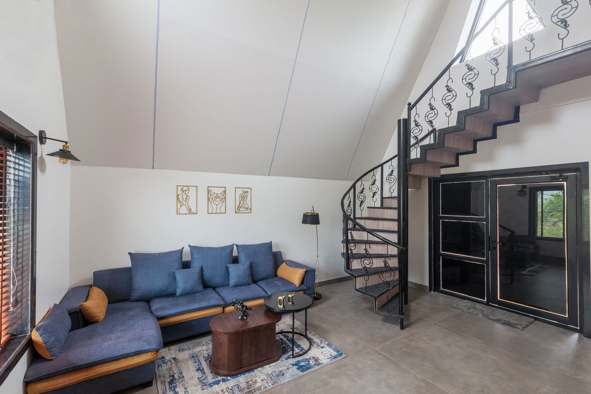 This luxurious haven offers an unparalleled experience of tranquillity and serenity, surrounded by greenery and majestic mountains. With three distinct units, including a 3BHK house, an A-shaped cottage, and two charming tents placed outside the villa, this property offers a unique blend of comfort and natural beauty. It boasts chic, royal, and modern interiors that are sure to captivate your senses. The colour palette creates an elegant and timeless ambience, while the exterior of the villa exudes charisma with its pristine white facade. The A-shaped cottage, in contrast, stands out with its sleek black exterior, adding a touch of contemporary charm to the premises. The property also features three common areas for all units, including a spacious community hall, a well-maintained tennis court, and outdoor gaming zones, providing ample opportunities for leisure and recreation.