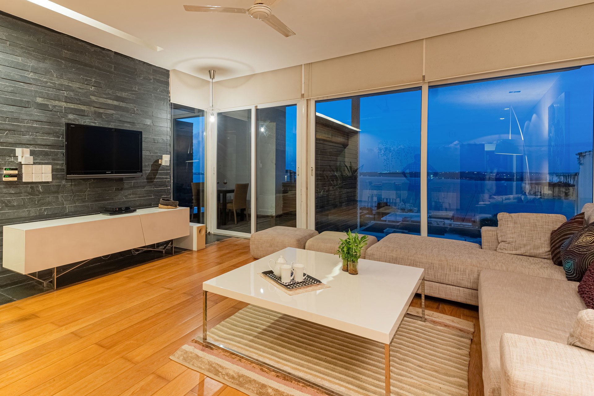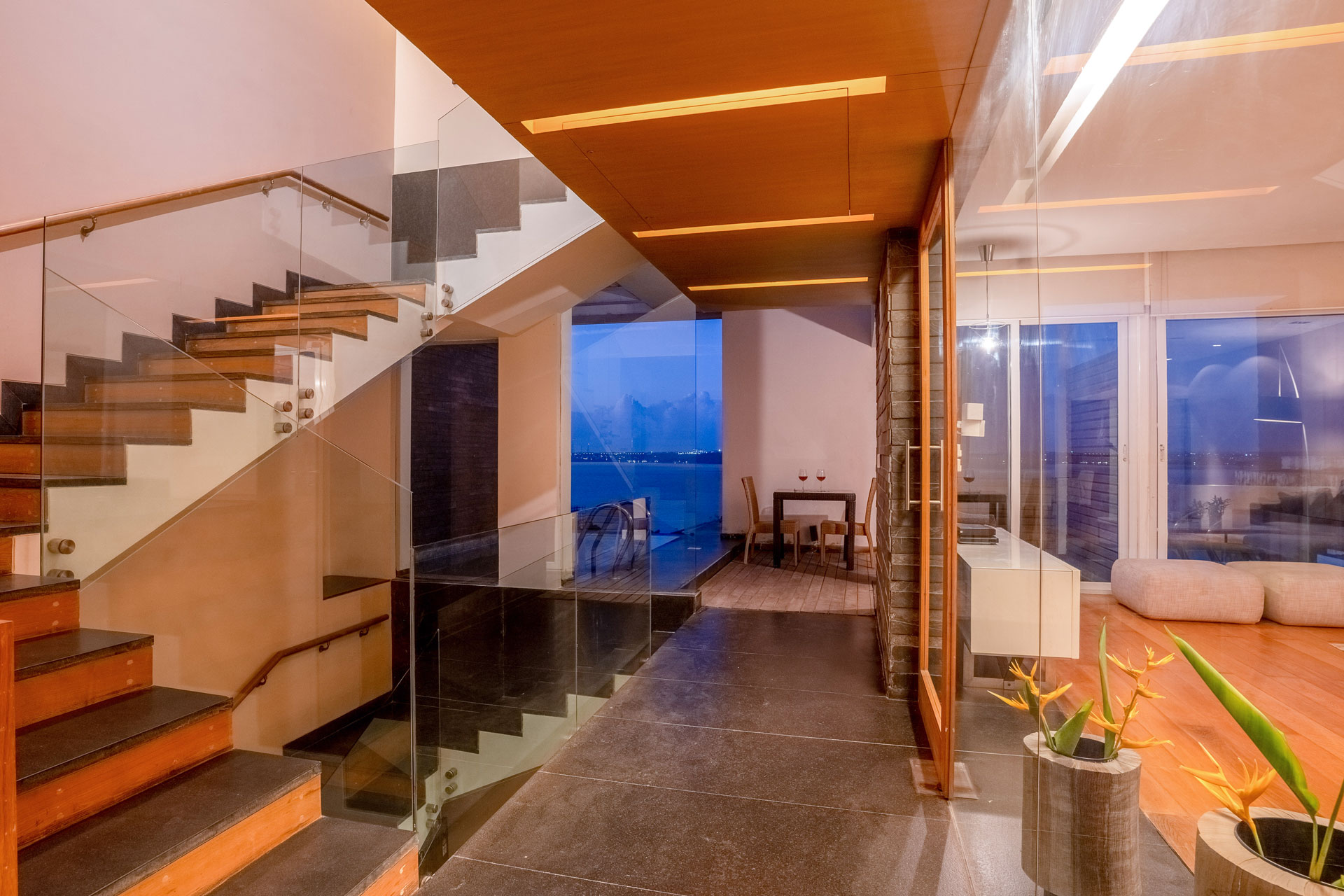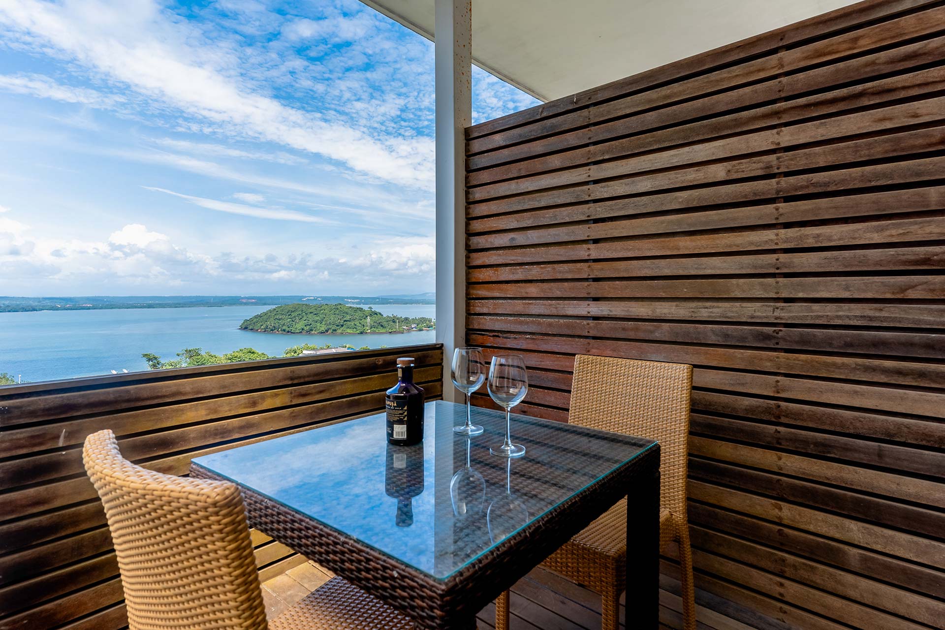 – Guests can head over to the private terrace that offers gorgeous views of the bay and sky.