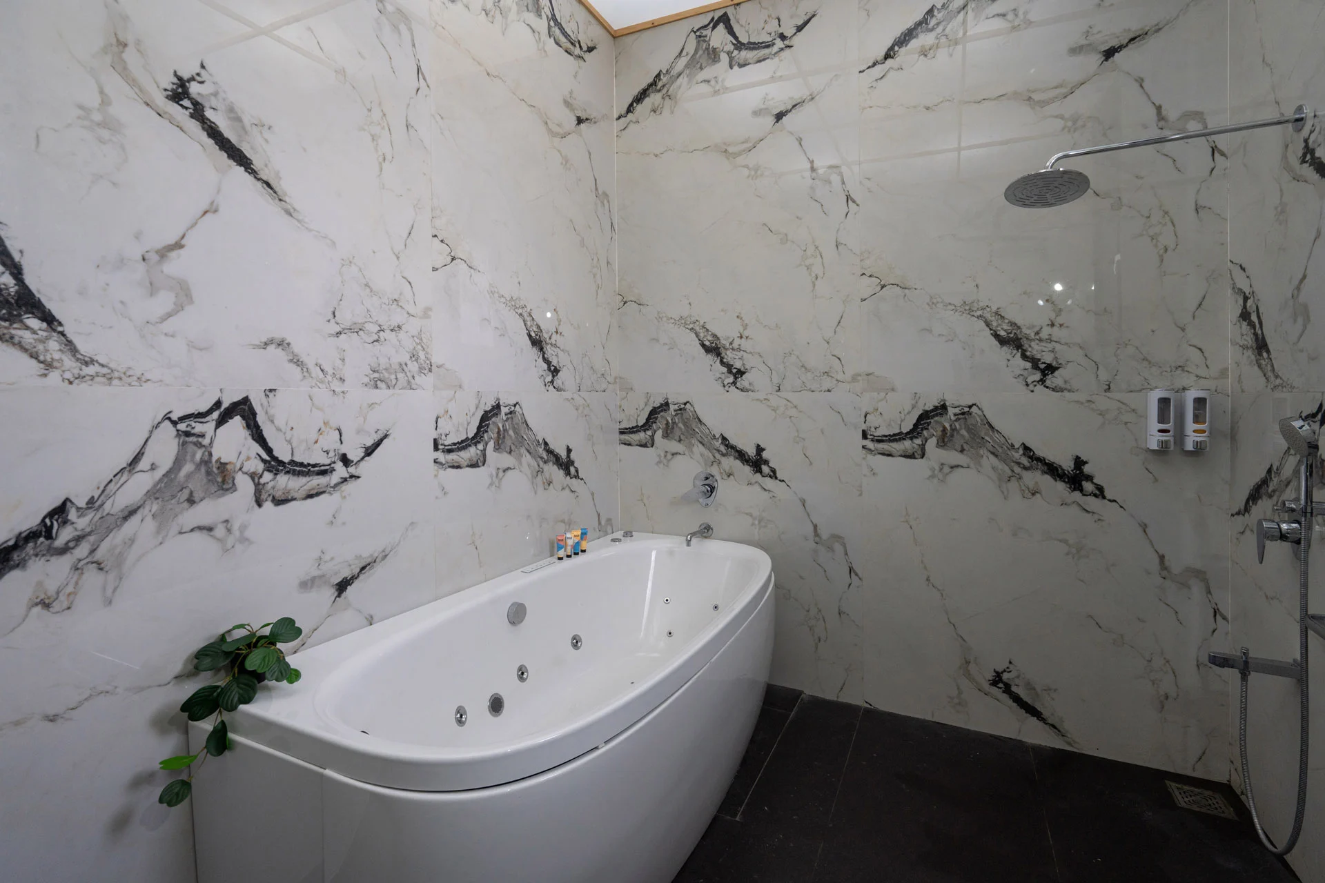 This room is also equipped with an ensuite bathroom with a luxurious bathtub with a built-in jacuzzi feature.