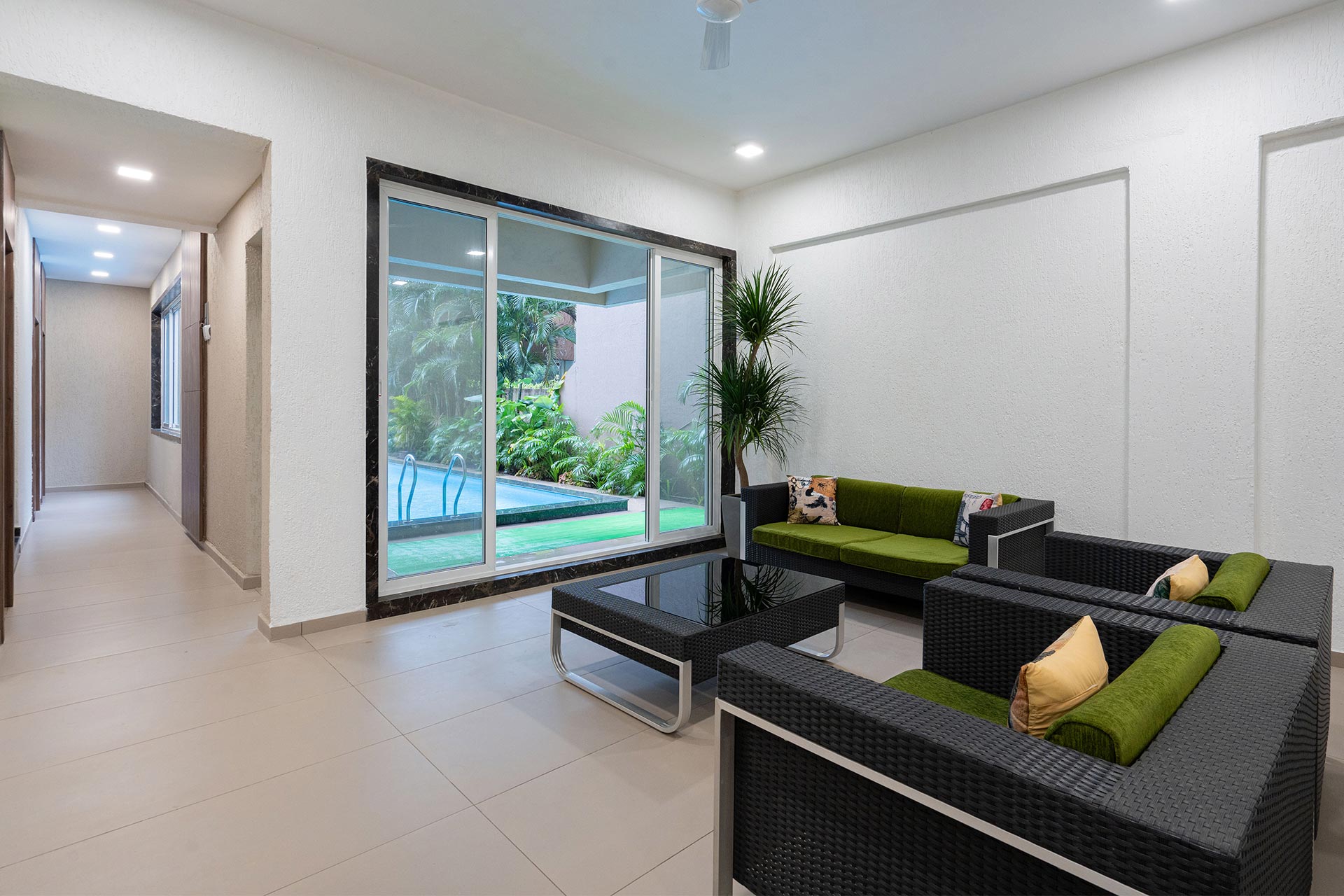 Rosso offers a striking blend of contemporary interiors and decor that perfectly complements its elegant facade. Nestled amidst lush greenery, the villa boasts a spacious lawn that’s not just a feast for the eyes but also ideal for fun games or group yoga sessions, allowing you to connect with nature while enjoying your stay. For entertainment, look no further than the stunning theatre-cum-disco room. Here, everyone can immerse themselves in a world of music, movies, and dancing, ensuring that there’s never a dull moment. When it’s time to relax and recharge, the outdoor pool is there for your enjoyment. If you’re up for some friendly competition, the game room offers a wide array of fun and challenging activities, ensuring that everyone in the group has a fantastic time. Come experience the perfect blend of luxury, leisure, and nature at this Lonavla villa. Your oasis of relaxation and recreation awaits!