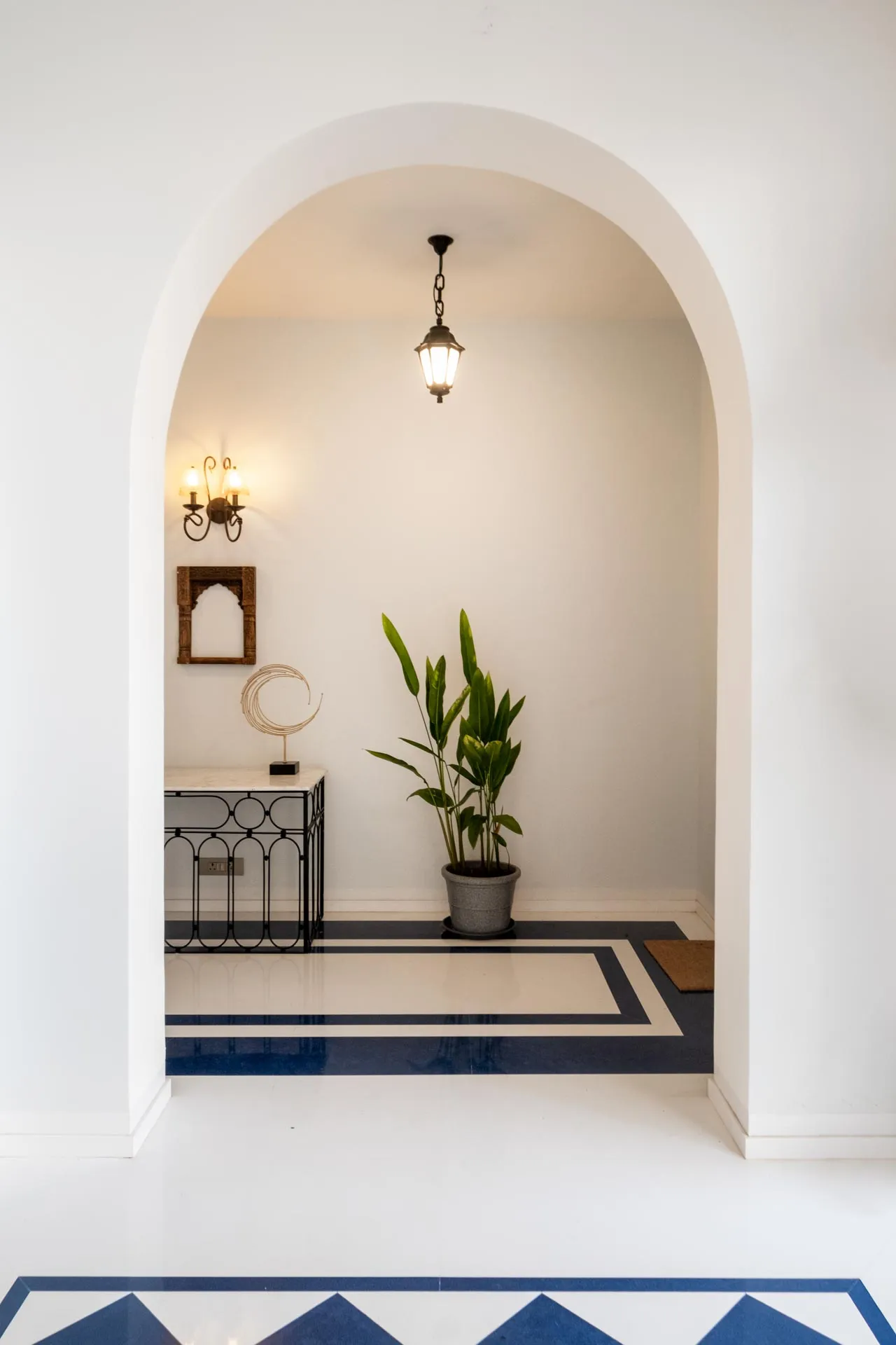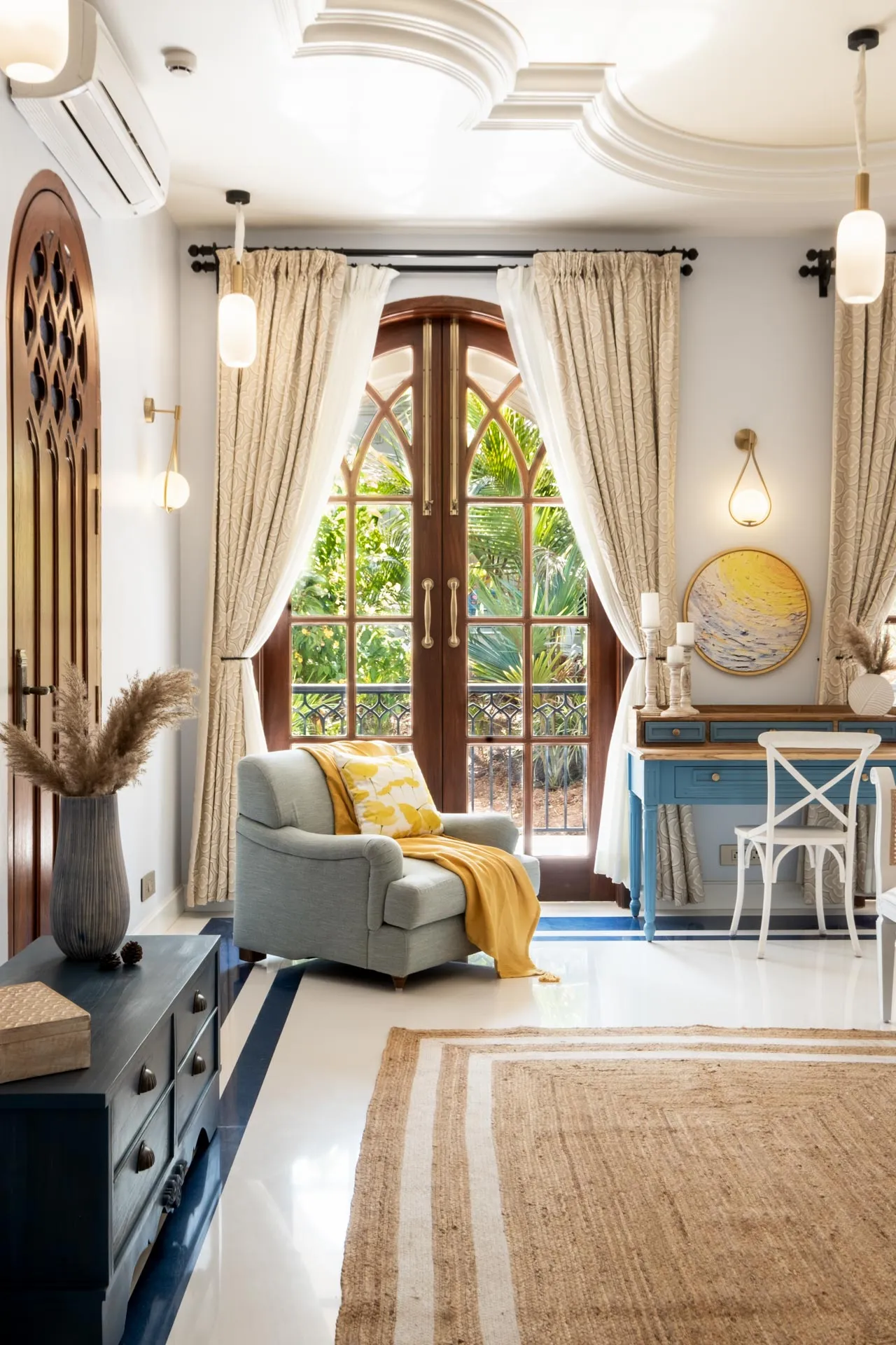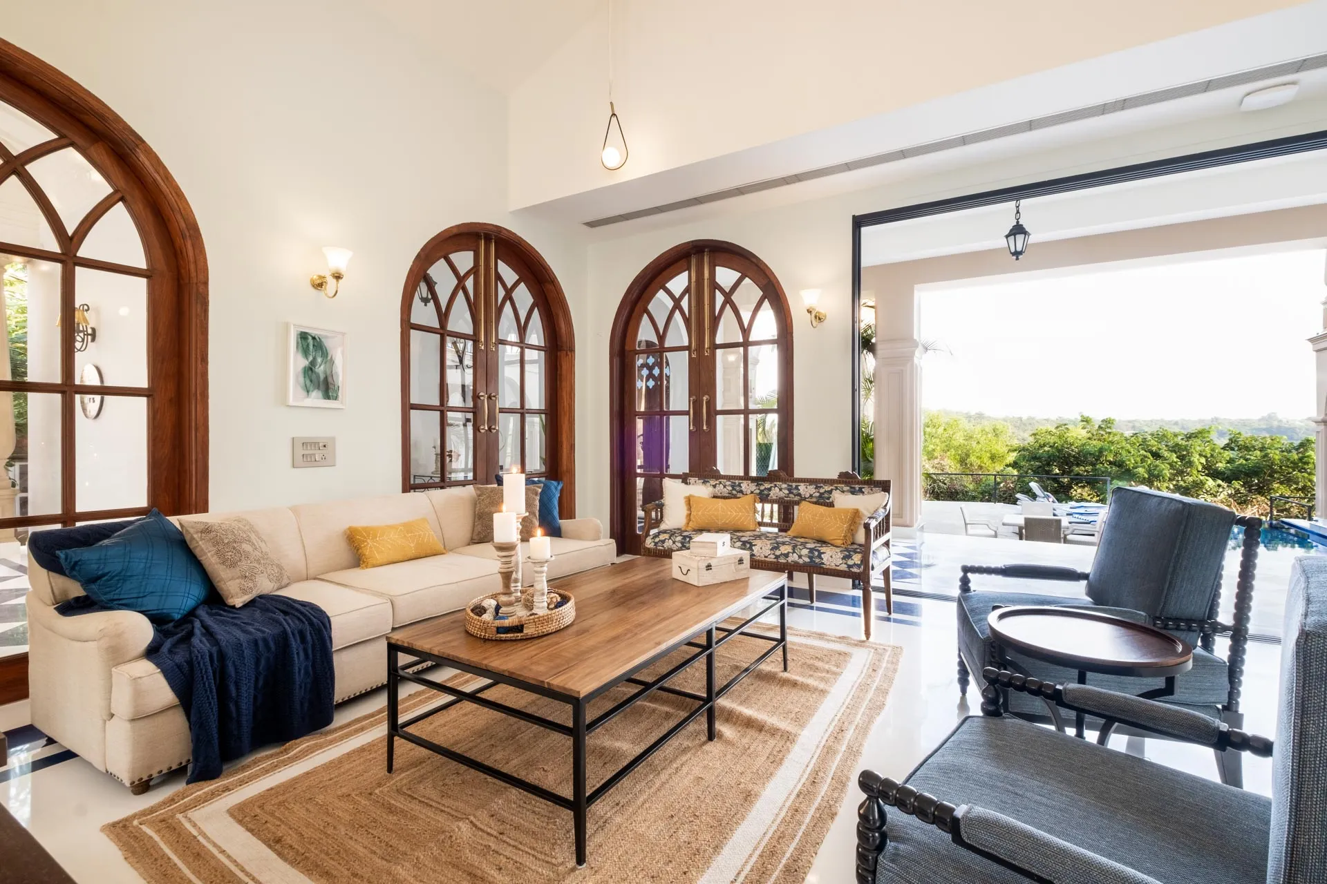 Set atop the hills of Mandrem, Sacri Borod Hill 6 is part of an exclusive villa community in Goa. Boasting majestic Mediterranean architecture and ethereal views of the surrounding vegetation, the villa is an idyllic getaway for large groups. Find a cosy corner in one of the 5 ensuite bedrooms or gather with your friends and family in the elegant living room. Enjoy a playful match in the games room or watch the sunset from one of the balcony sit-outs overlooking the Ashwem sea. Dip in the private pool or take a stroll in the luscious green gardens.