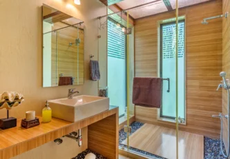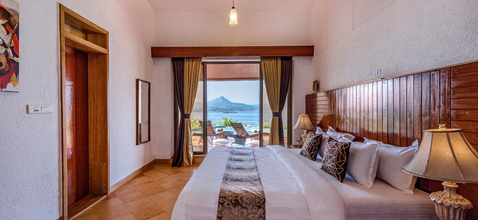 - Step inside the living room to the most mesmerizing view of Pawna Lake. The living room further stretches out to an open deck with an infinity pool with a glass front.