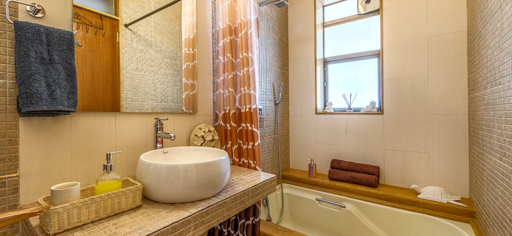 - To the right, there is 1 bedroom, while there are 2 bedrooms to the left of the living room, with ensuite bathrooms. All bedrooms are air-conditioned.