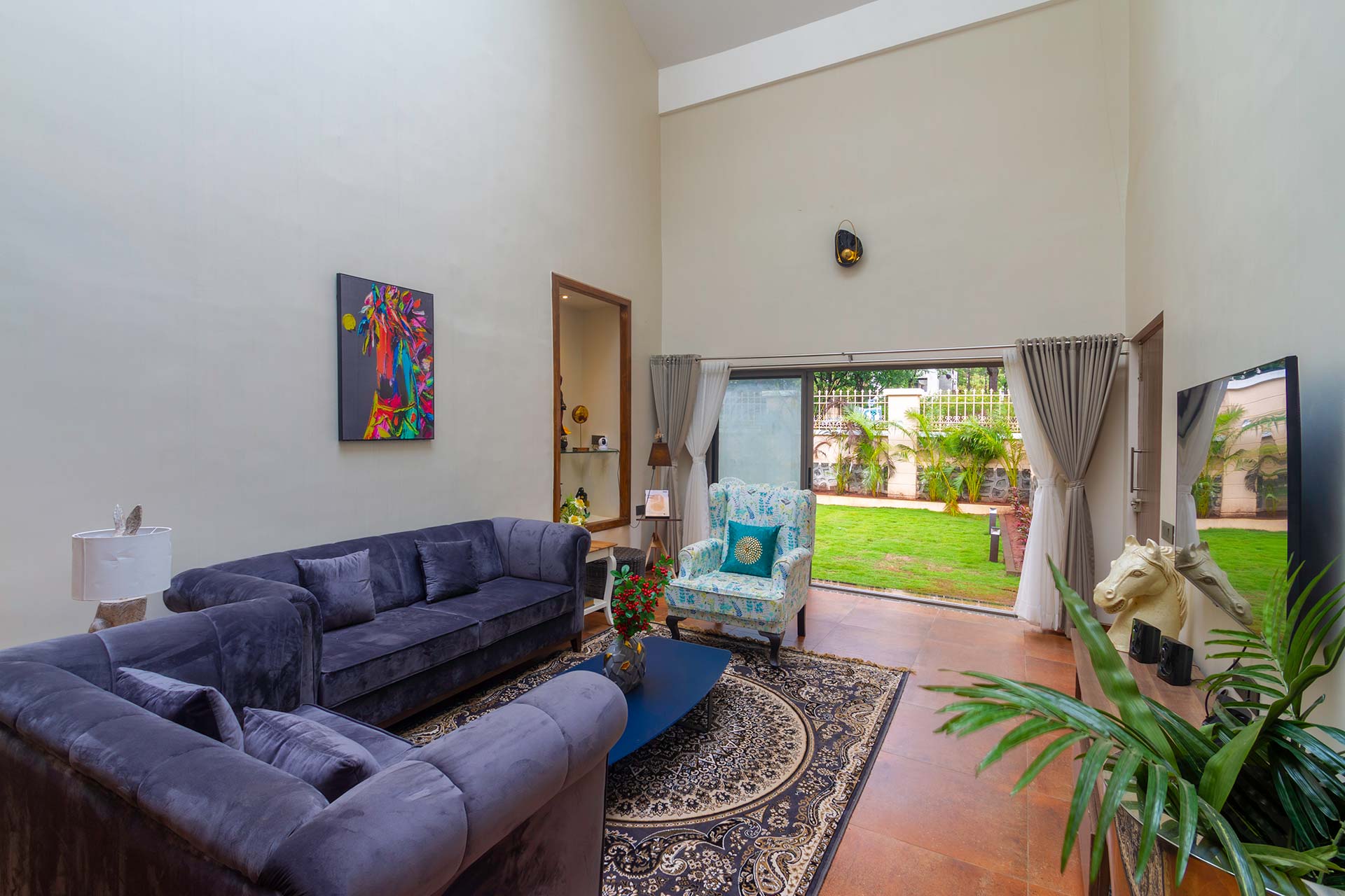 – The exteriors of this luxe property feature two lush green landscaped lawns blending in with the verdant surroundings.