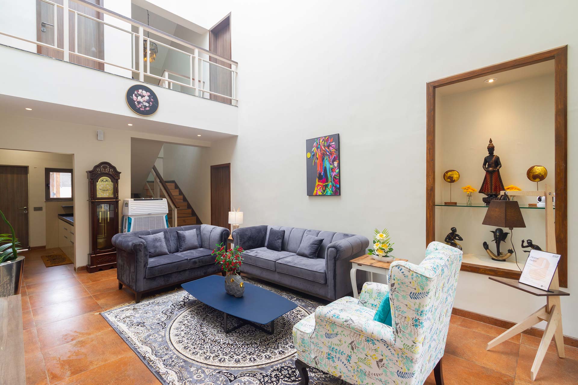 – With decor that blends in relaxation and warmth, this charming abode features an opulent living room on the ground floor.