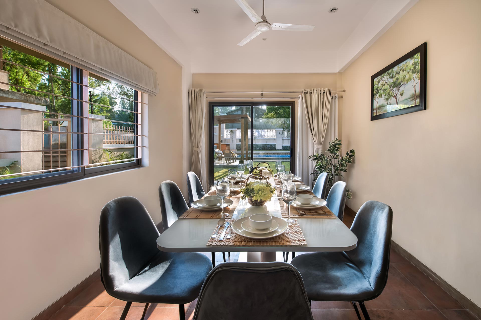 – Both the bedrooms on the first floor also feature an attached balcony overlooking the viridescent surroundings and the cool blues of the pool.