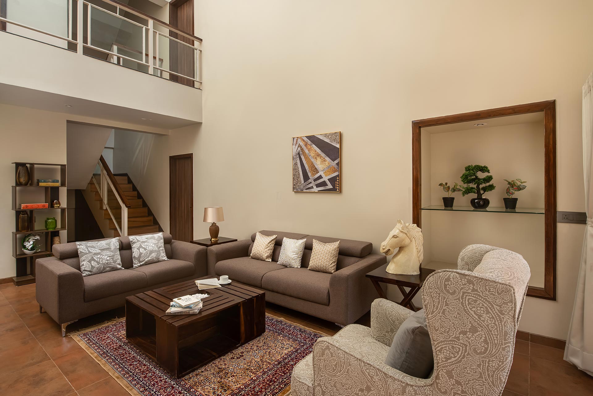 – The exteriors of this luxe property feature two lush green landscaped lawns blending in with the verdant surroundings.