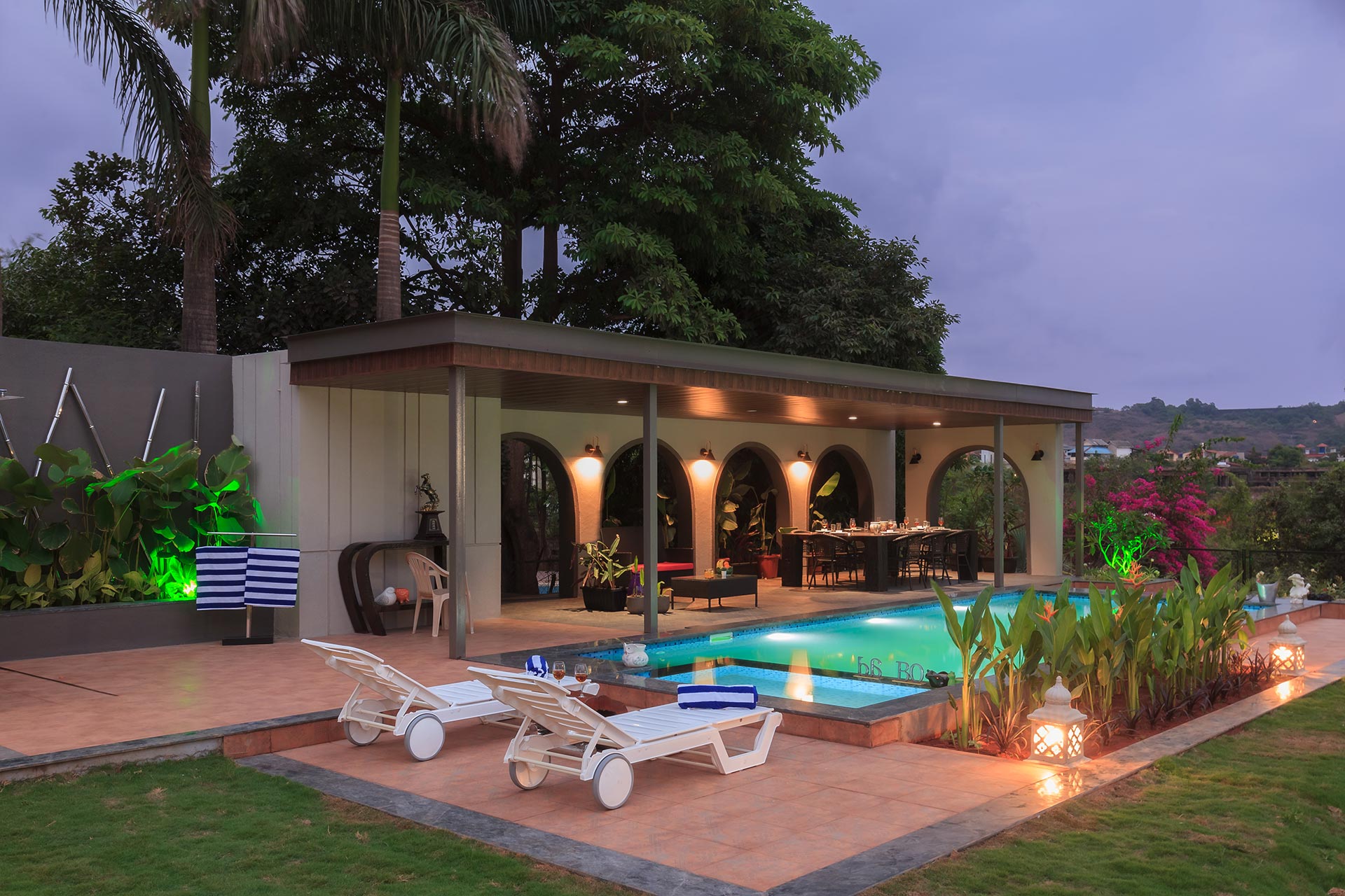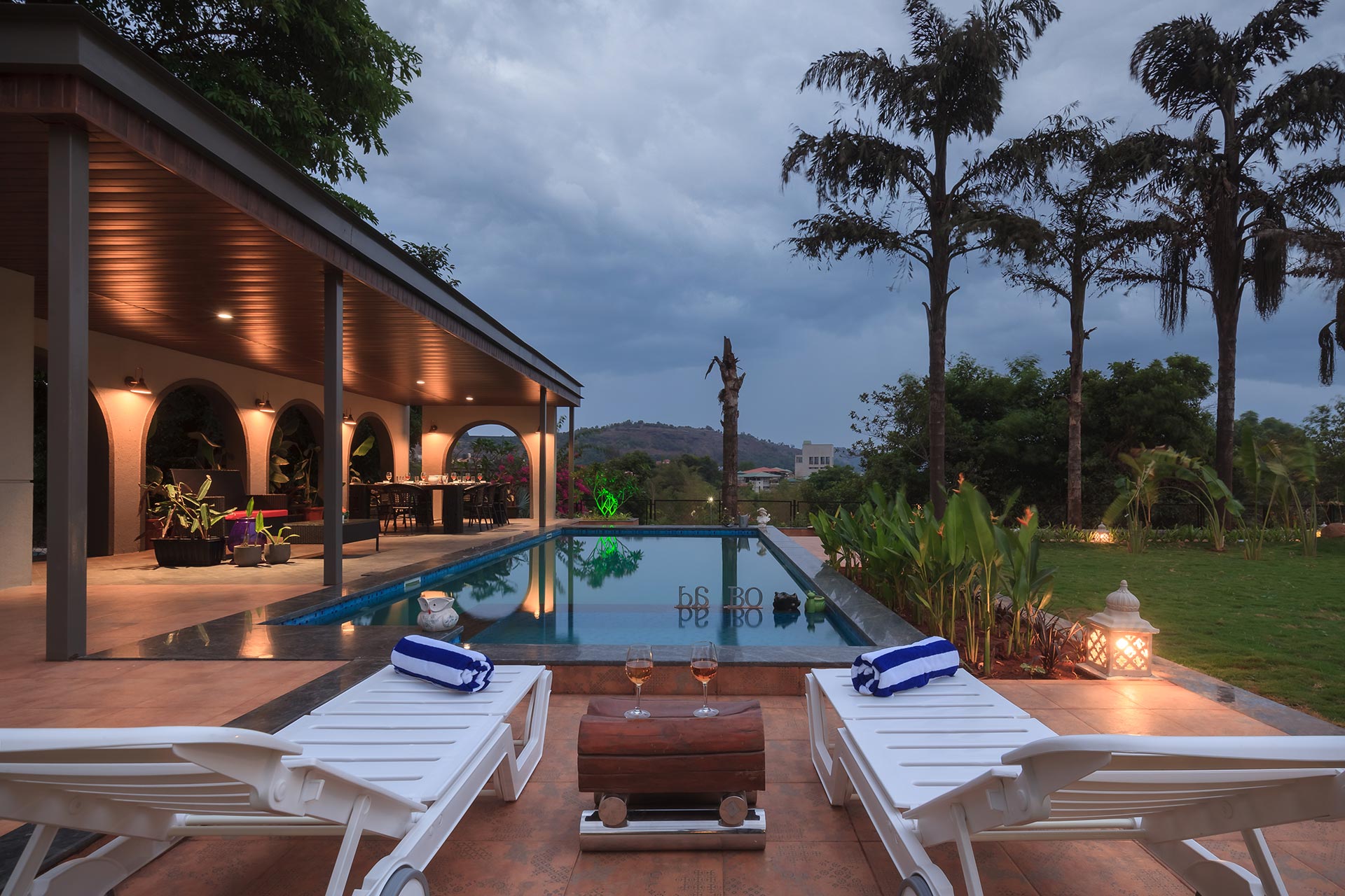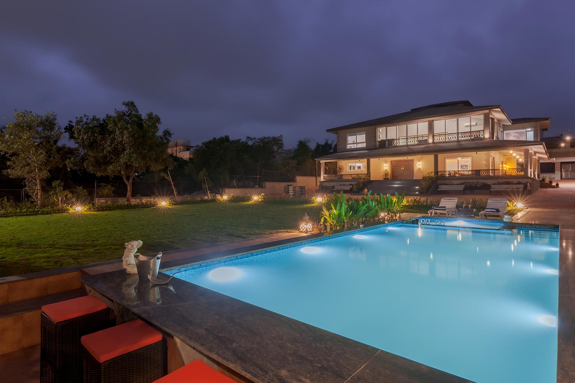A modern masterpiece just a hop away from Mumbai with astonishing views and an awe-inspiring built, The CinCin offers a myriad of handpicked experiences for everyone. Enjoy balmy evenings at the sun deck on the first floor, with a scrumptious barbeque set up in the background. The expansive, lush lawn is perfect for events or large gatherings. Kick back and lose yourself in the first floor lounge where guests can play pool, compete at foosball or dance and party away on the dance floor! When looking to refresh and relax, pamper yourself in the luxurious jacuzzi on the first floor. In the evenings, you can sit by the quintessential bar area overlooking the pool on one side and verdency on the other.