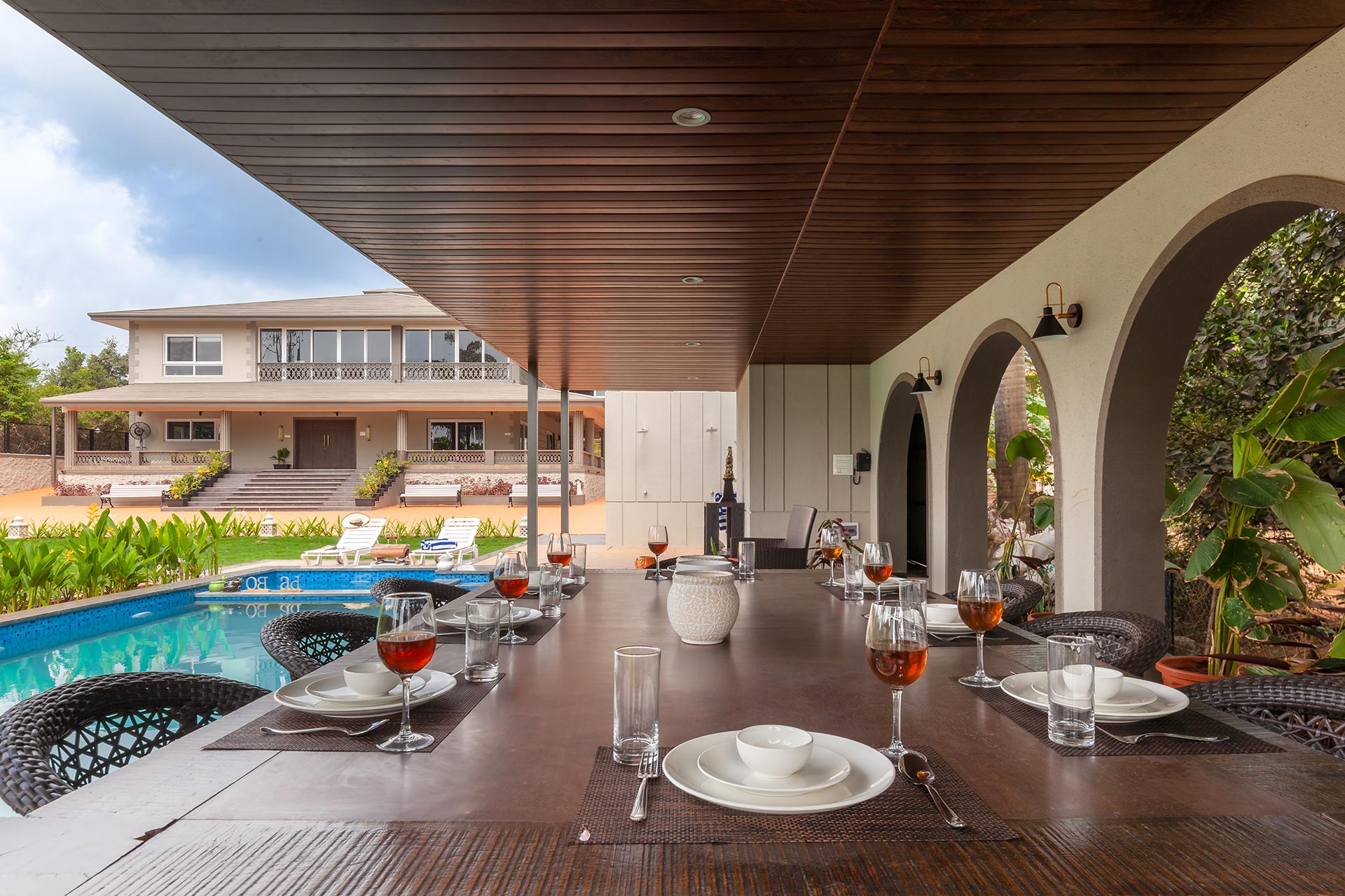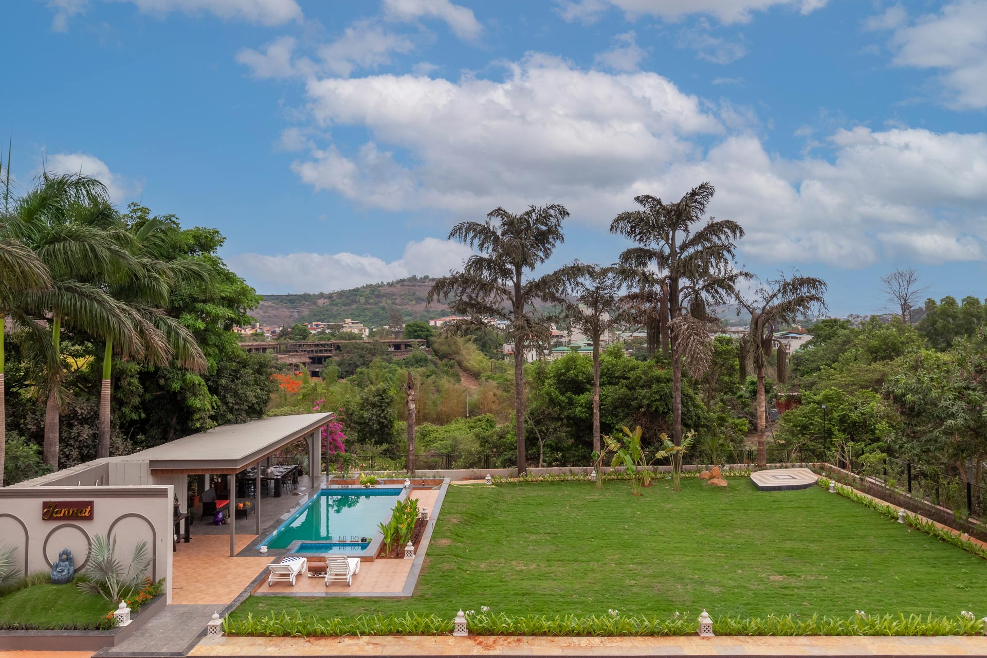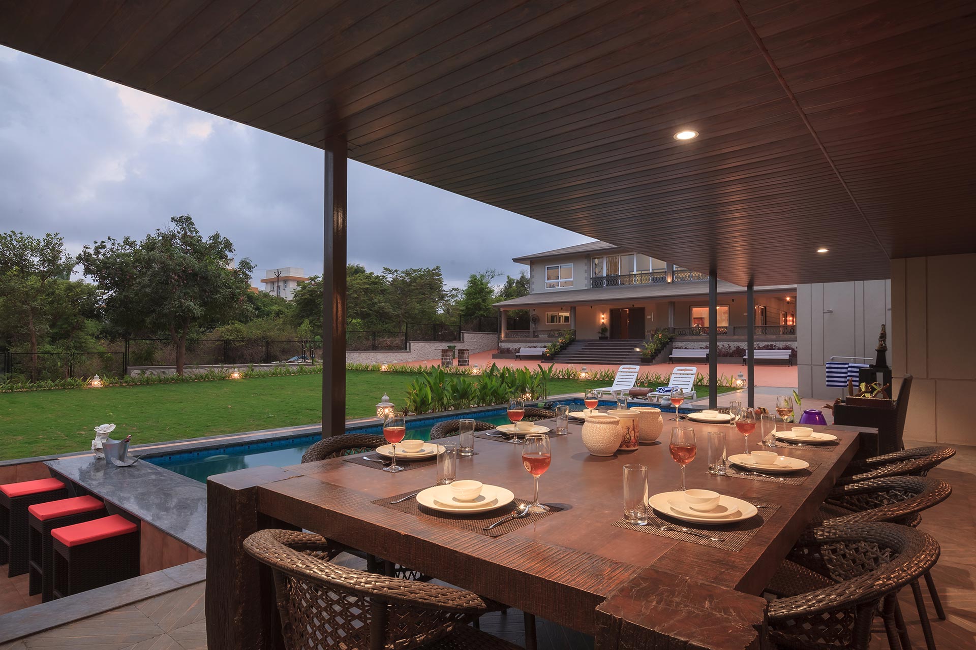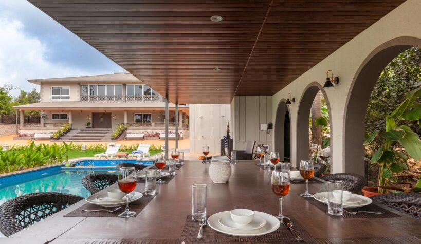 Within the property, guests can lounge in the spacious yet homely living room as they have their favourite beverage. The CinCin offers a myriad of handpicked experiences for everyone. Guests can have a memorable time playing pool or foosball with their friends and family. A scrumptious barbeque can be set up by the pool on cooler nights. This property is perfect for events and larger gatherings. The expansive lawn can accommodate upto 200 guests along with a stage! The outdoor dining area is perfect for a hearty al fresco meal. For guests who love adventure treks, there is Della adventure park just a short drive away from the property.