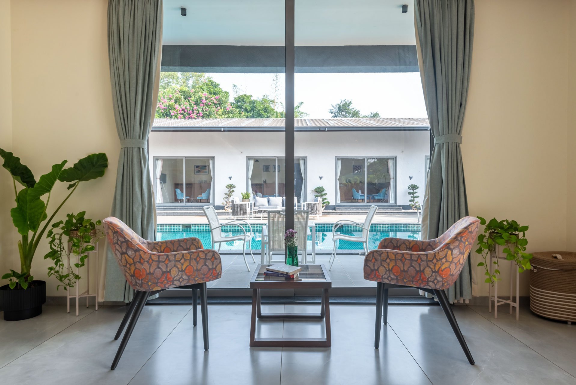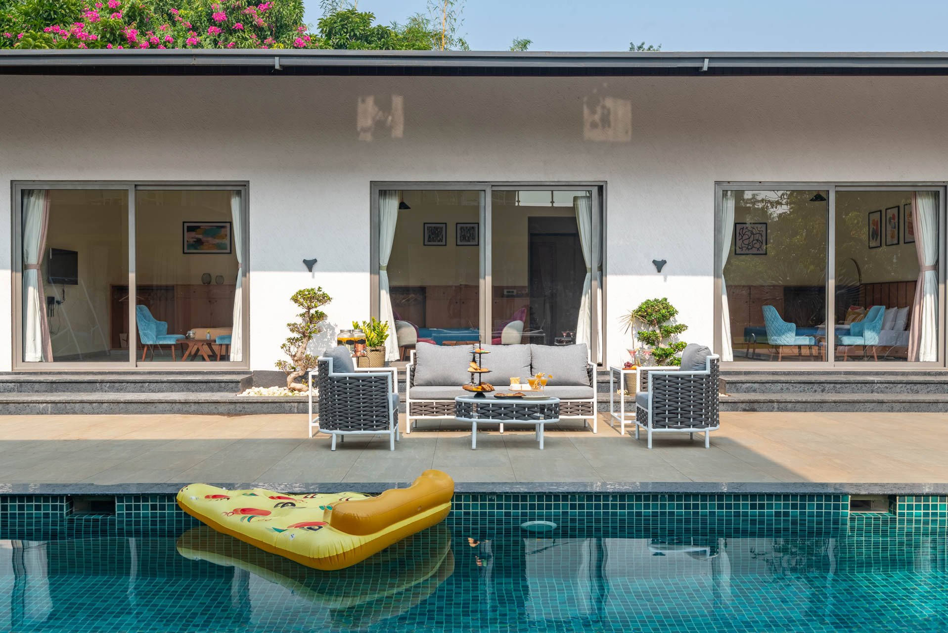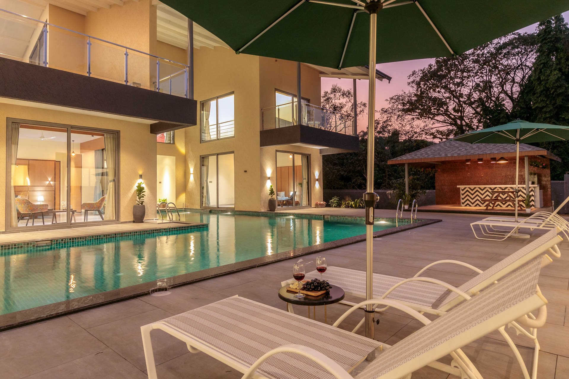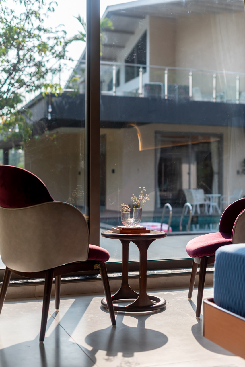 Think of a castaway experience, swathed in endless greenery and charismatic experiences right in the heart of Karjat – The Den might just be this town’s best-kept secrets. This sprawling holiday home sweeps you into a world of laidback luxury with an expansive set of alluring amenities that must be experienced in person. As you pull up the driveway, you will notice the facade of this home that is simply unlike any other home; it’s almost dreamy, wrapped in surreal landscapes of luxuriant foliage and the distant mountains. Set on extensive grounds, this getaway is almost like your sanctuary – replete with the choicest of experiences. The free-flowing indoor spaces are ornamented with classy yet swanky furnishings, sloping high ceilings and well-cushioned seating areas. Leading to the outdoors – the path weaves down to the L-shaped swimming pool, the lush green gardens and the private turf. However, the sheer highlight of this holiday home is the sun-drenched terrace that makes for the perfect setting for a delectable high tea. At The Den, we encourage you to embrace luxury and enjoy nature.