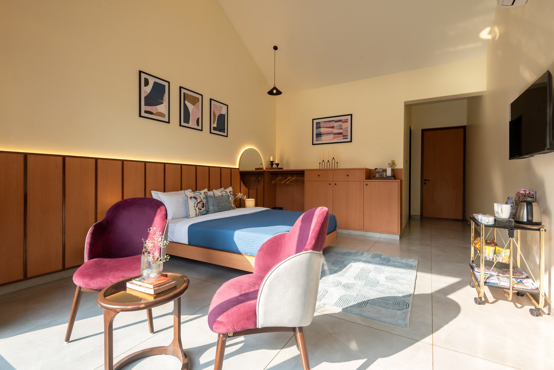 The room offers a variety of amenities including a king-sized bed, AC, wardrobe and Wi-Fi access.