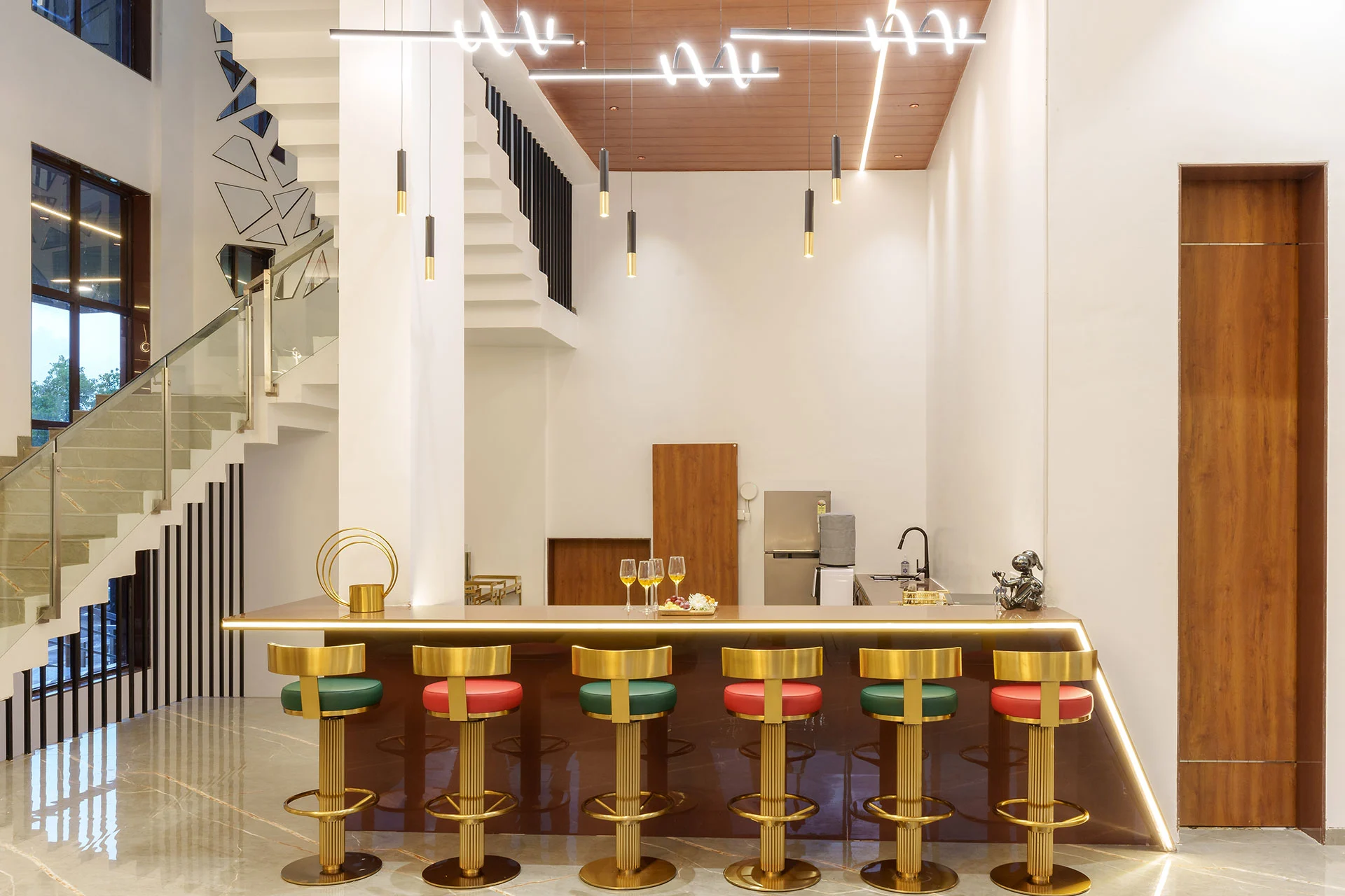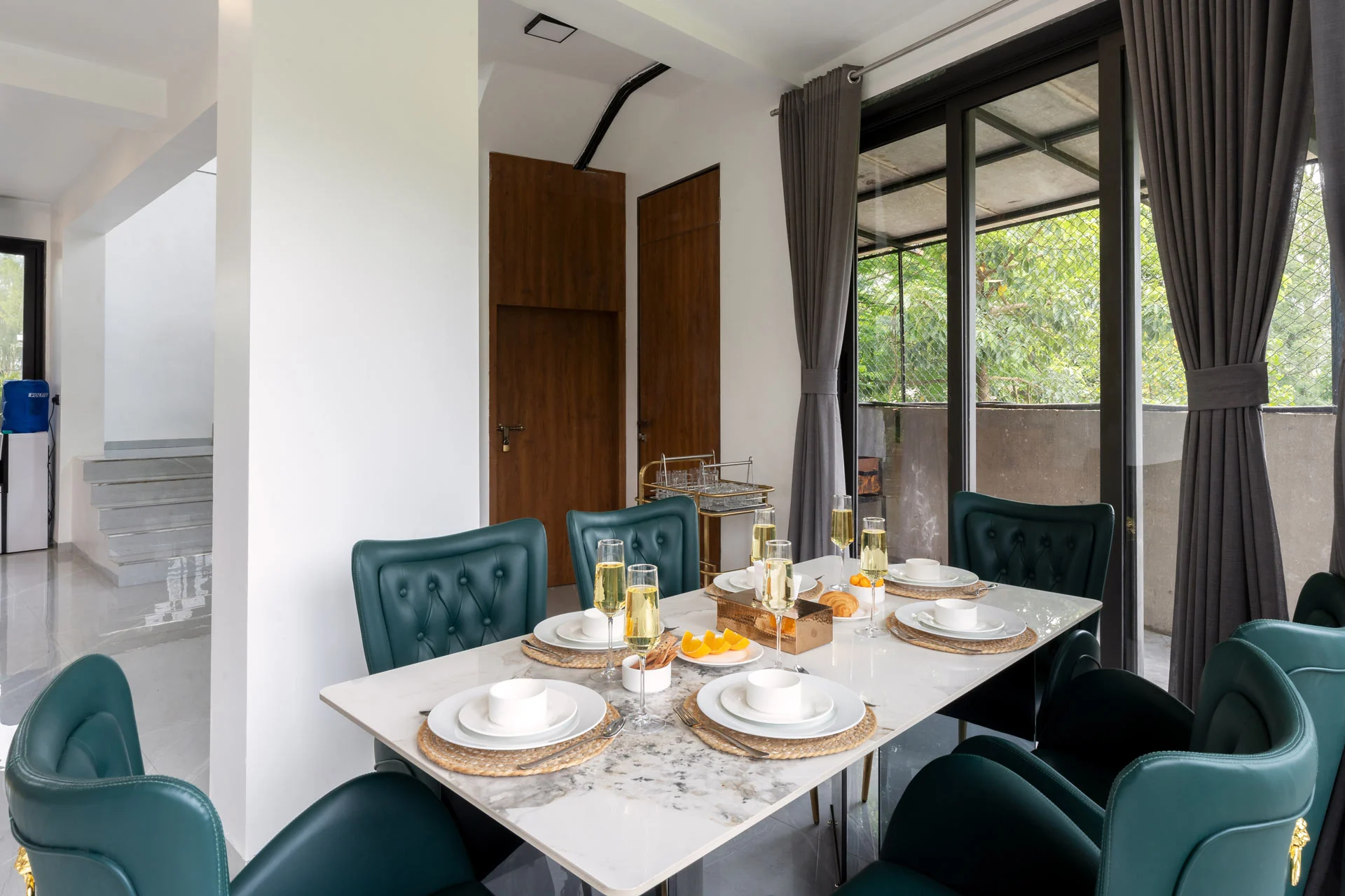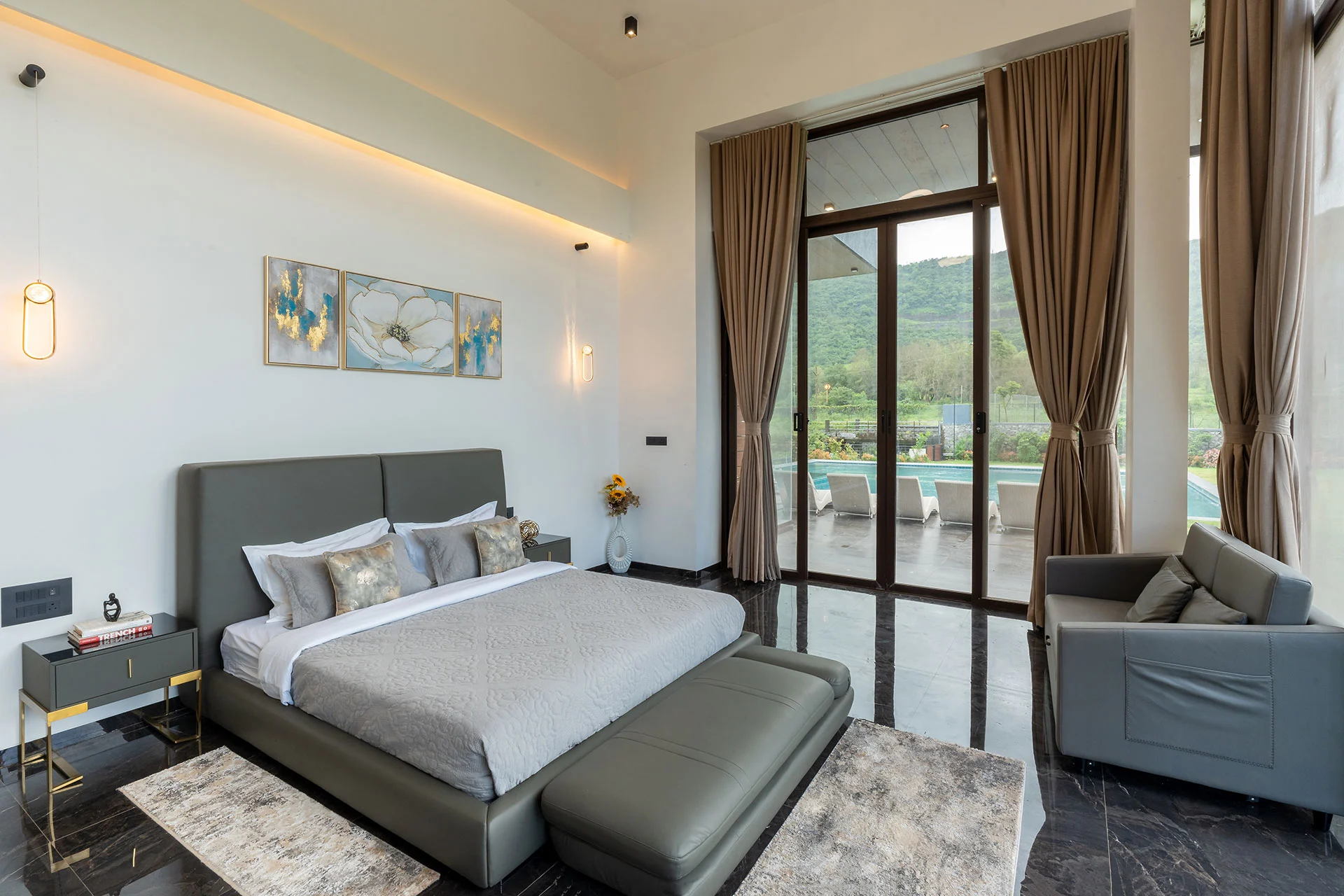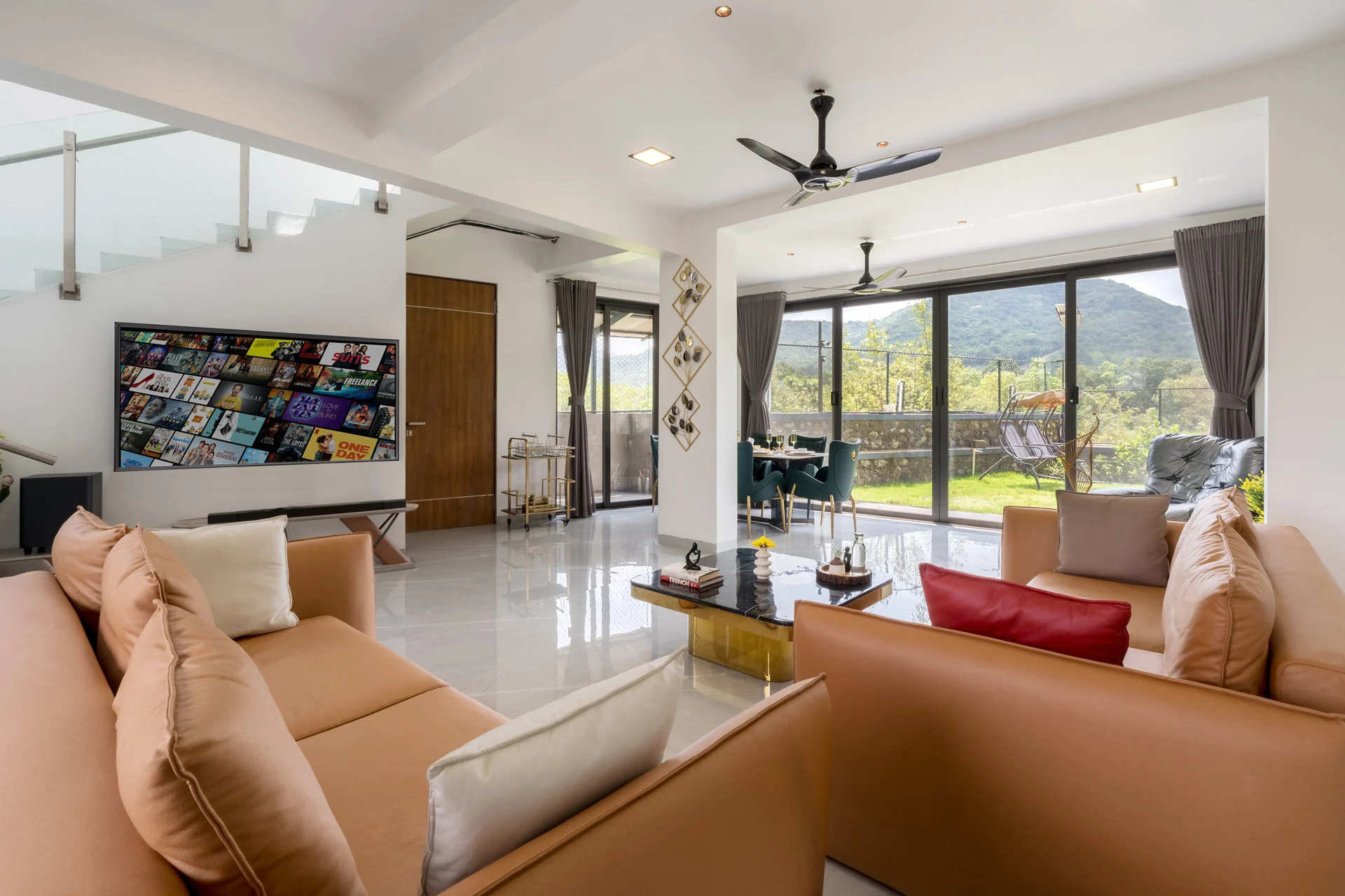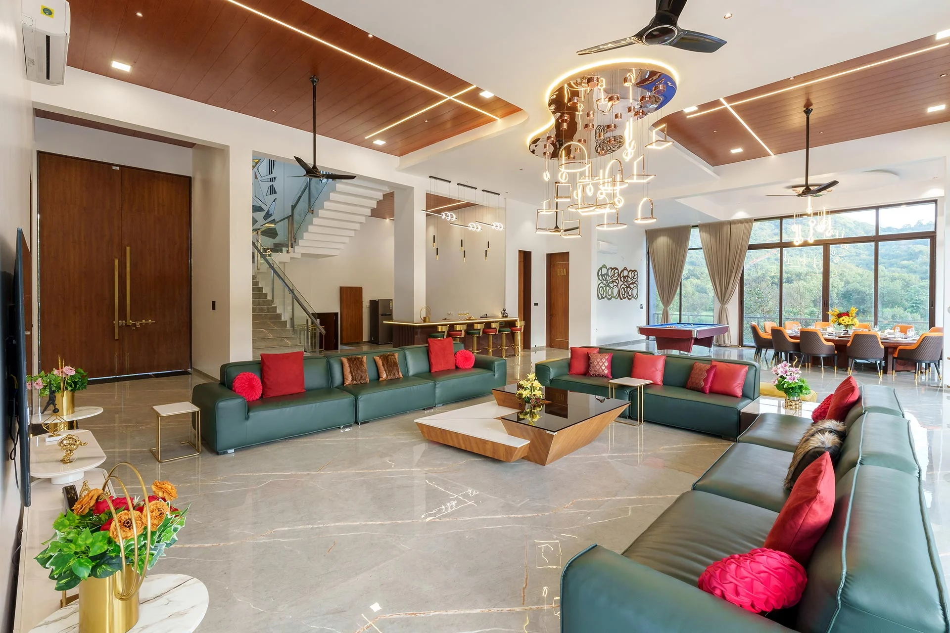 Imagine waking up at The Glen, where your day begins in the grandiose living room, perfect for a leisurely breakfast amidst elegant surroundings. Step out onto the sprawling lawn, where you can bask in the morning sun or dive into the massive pool, complete with a dedicated kids’ area and a bubbling jacuzzi. Enjoy the peaceful ambiance of nature while strolling along the charming trails, accompanied by the