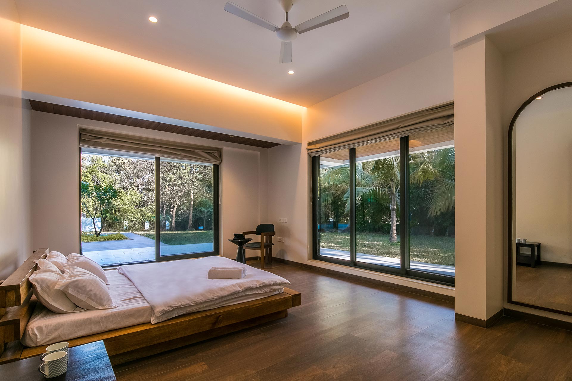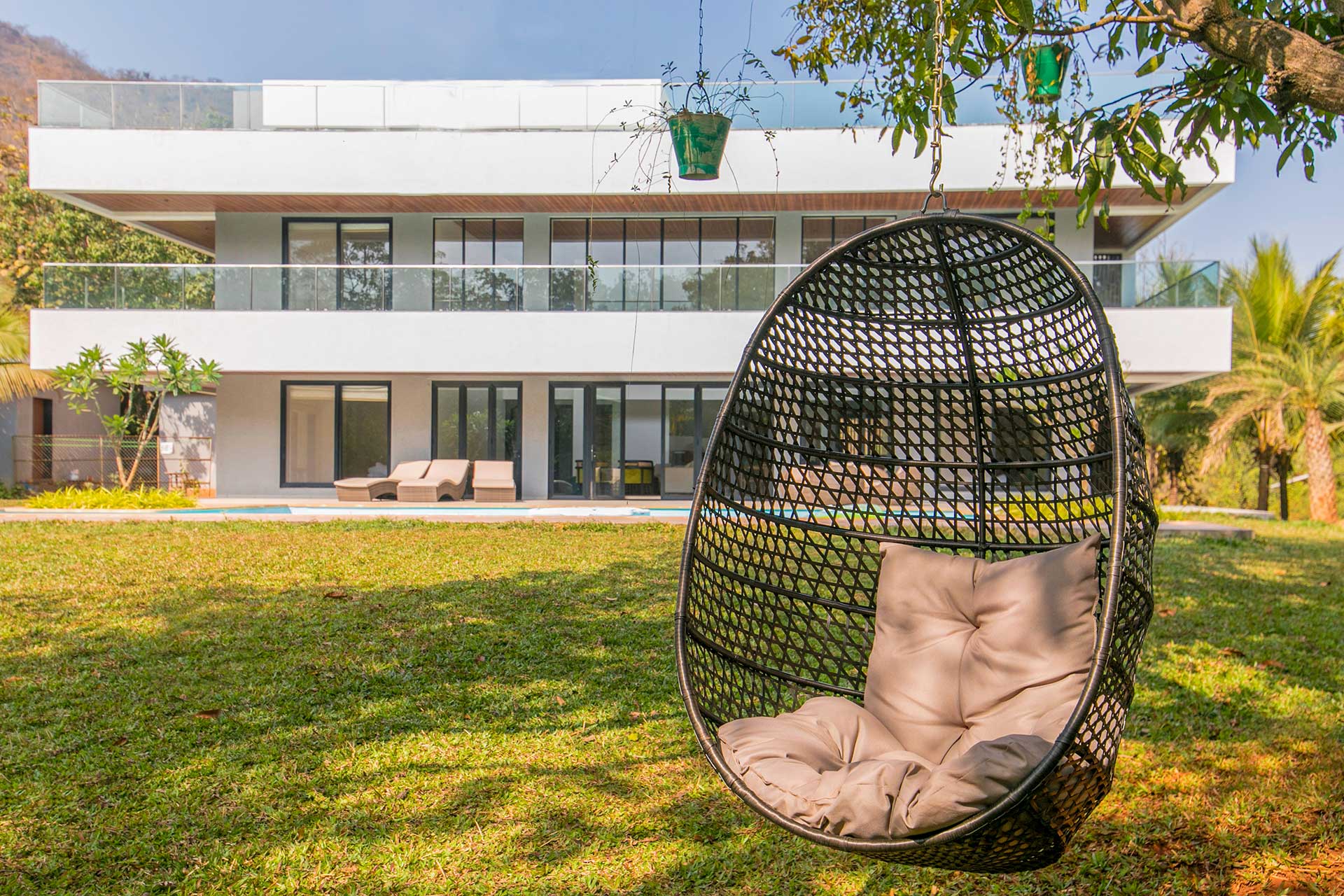 – The exteriors of the villa feature a sprawling half-acre lawn, complete with swings and a cabana, ideal for an alfresco feast.