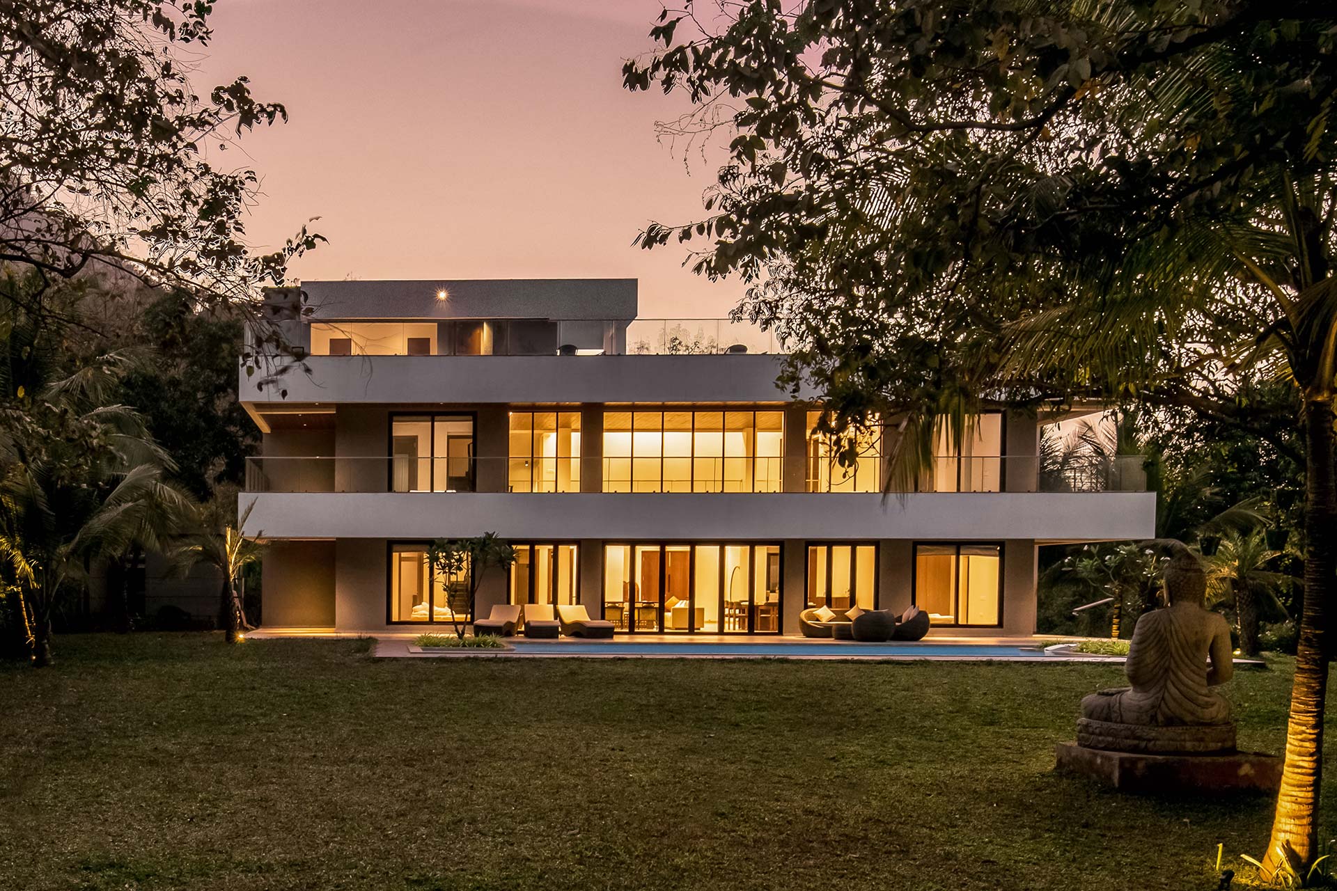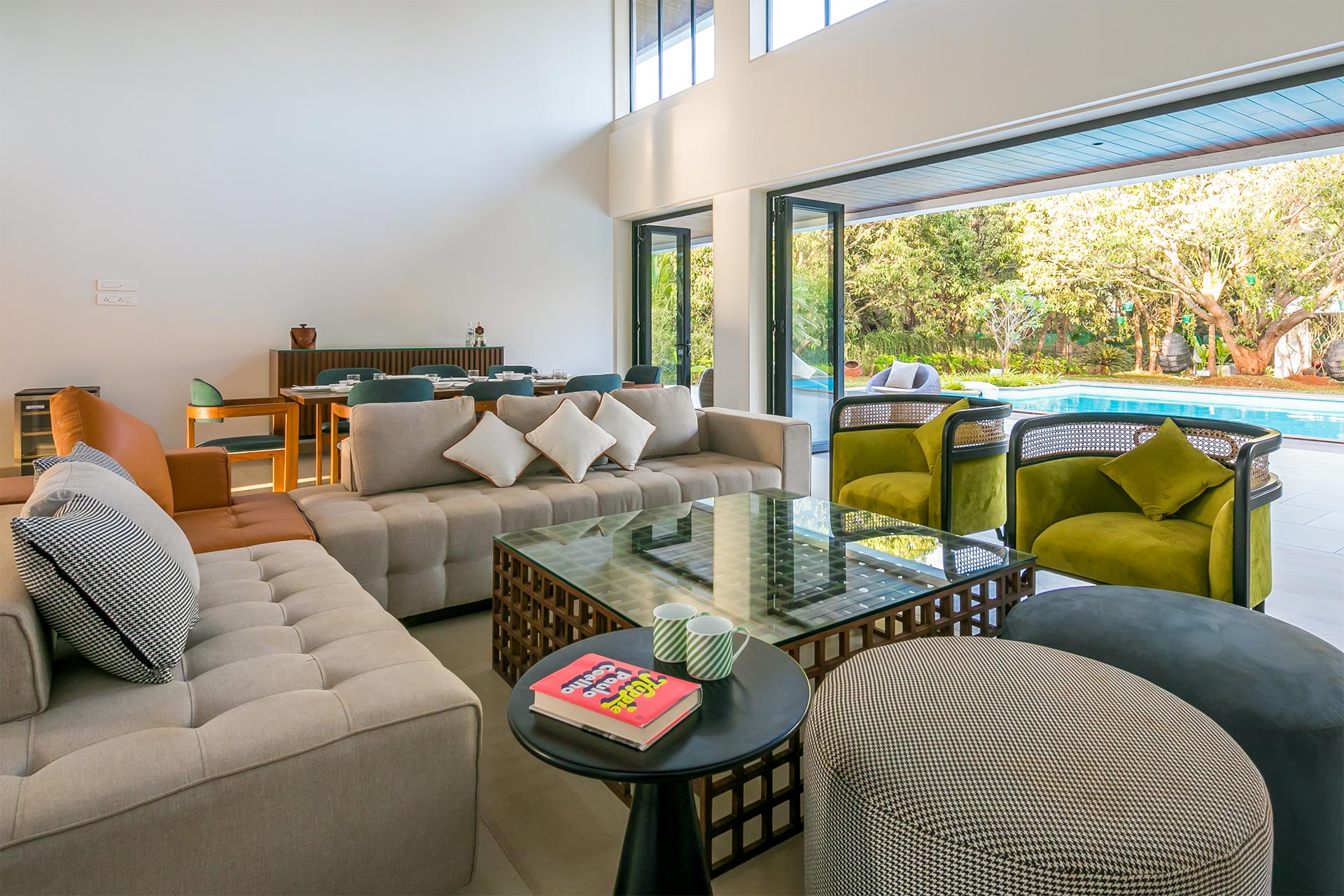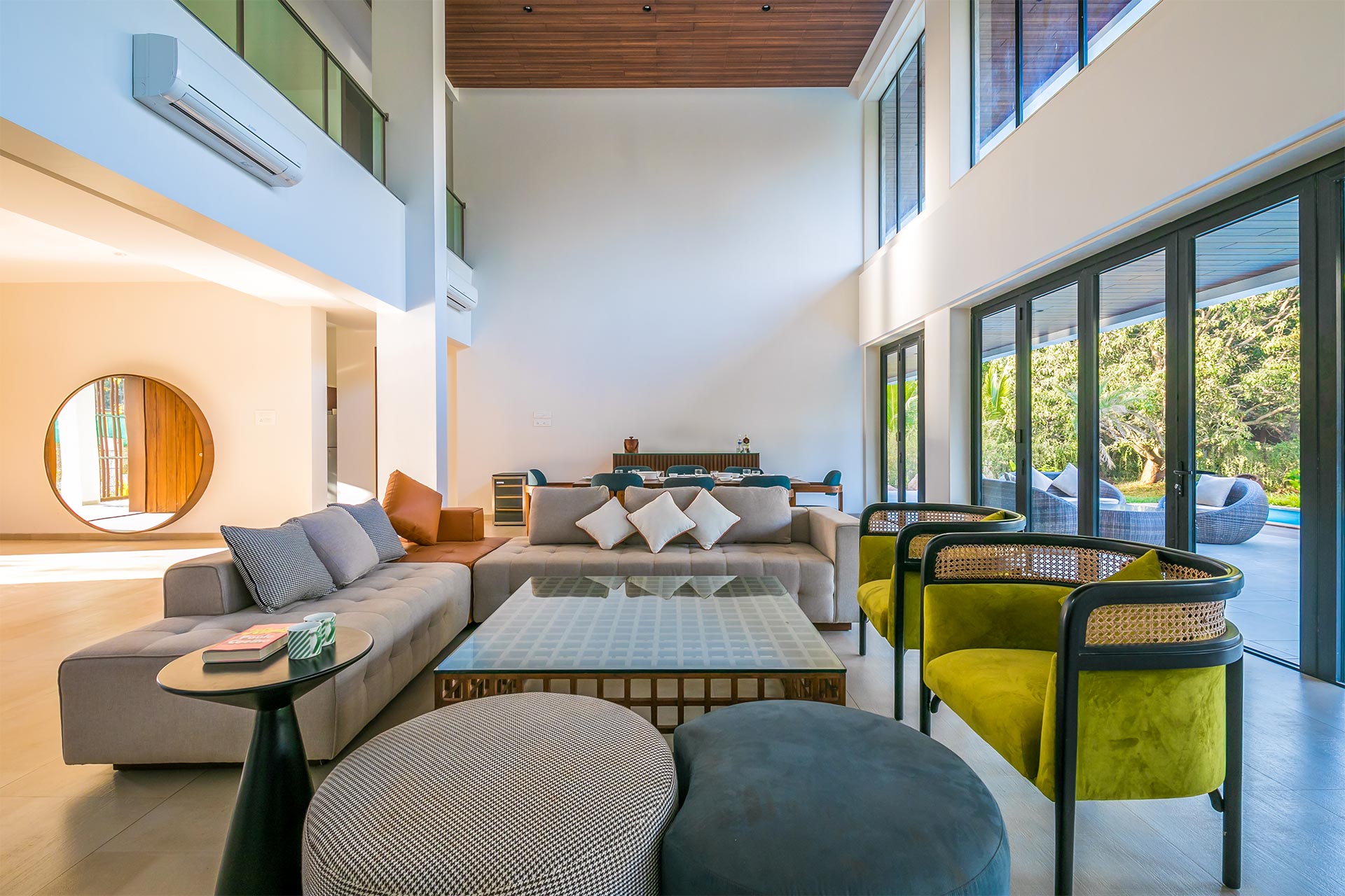 A sprawling holiday home positioned amidst glorious views, vast expanses of lush greenery and expansive outdoor spaces, The Reflection House makes for a serene getaway. The immaculate, minimal interiors complement the spacious white facade. This five-bedroom home boasts a lounge-worthy living room, a terrace with an attached bar, and a manicured lawn complete with swings and other outdoor furnishings. Clearly, it poses as the perfect holiday home for a relaxing getaway!