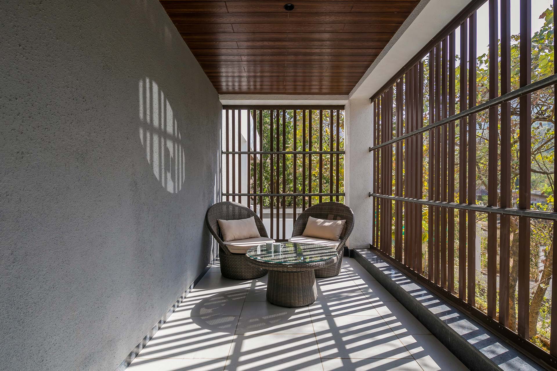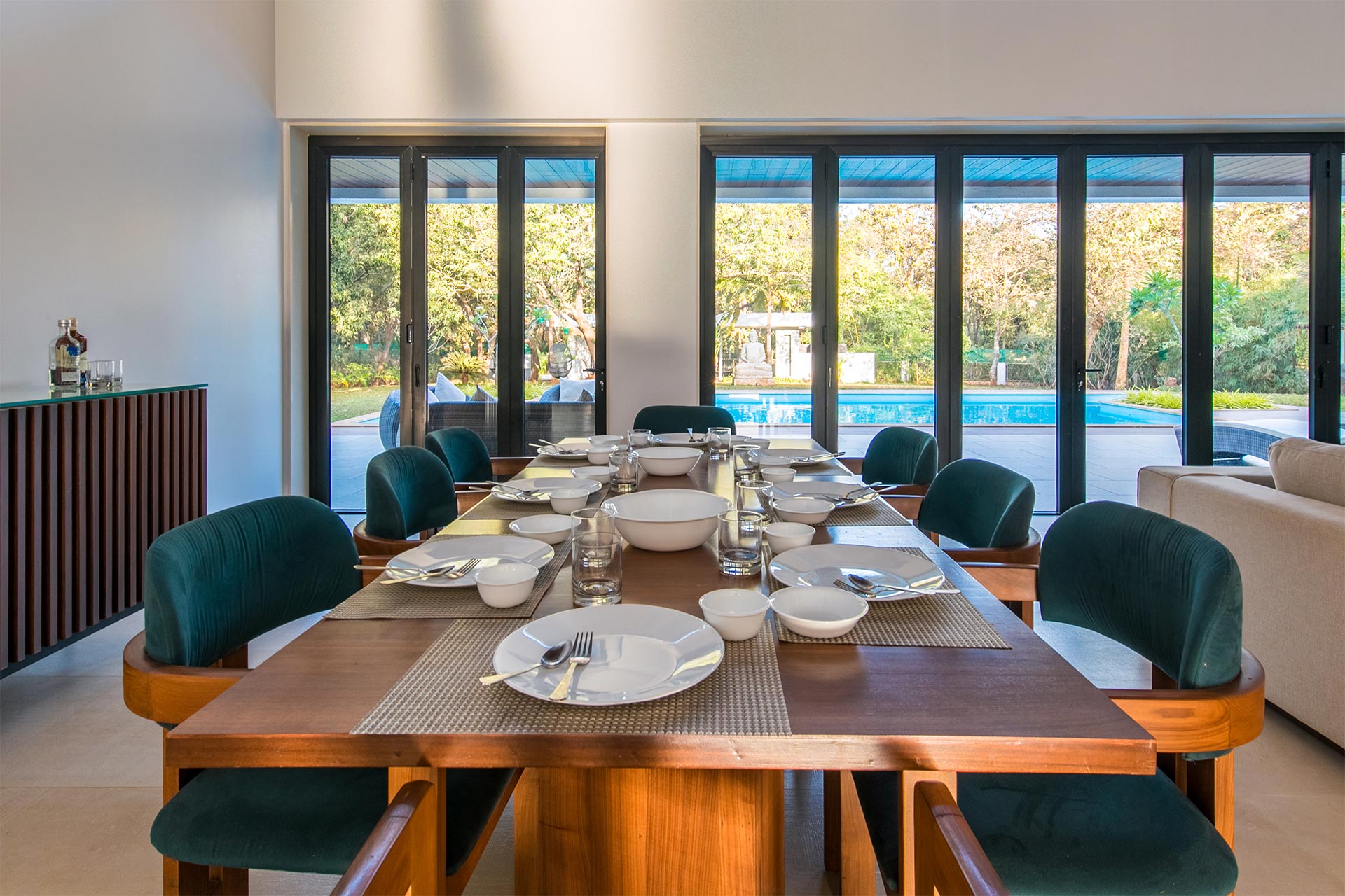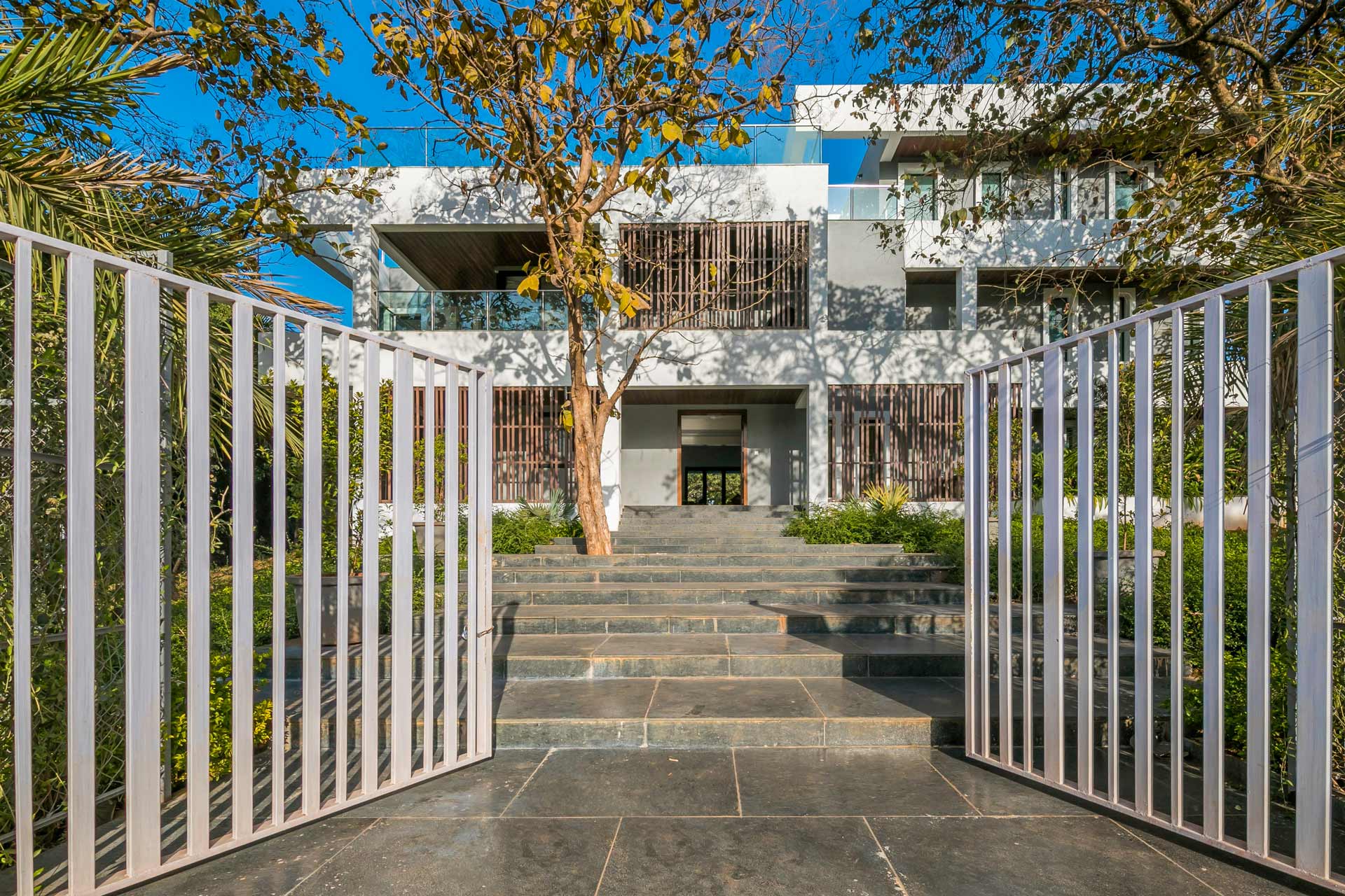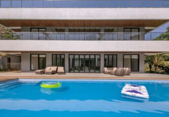 A sprawling holiday home positioned amidst glorious views, vast expanses of lush greenery and expansive outdoor spaces, The Reflection House makes for a serene getaway. The immaculate, minimal interiors complement the spacious white facade. This five-bedroom home boasts a lounge-worthy living room, a terrace with an attached bar, and a manicured lawn complete with swings and other outdoor furnishings. Clearly, it poses as the perfect holiday home for a relaxing getaway!