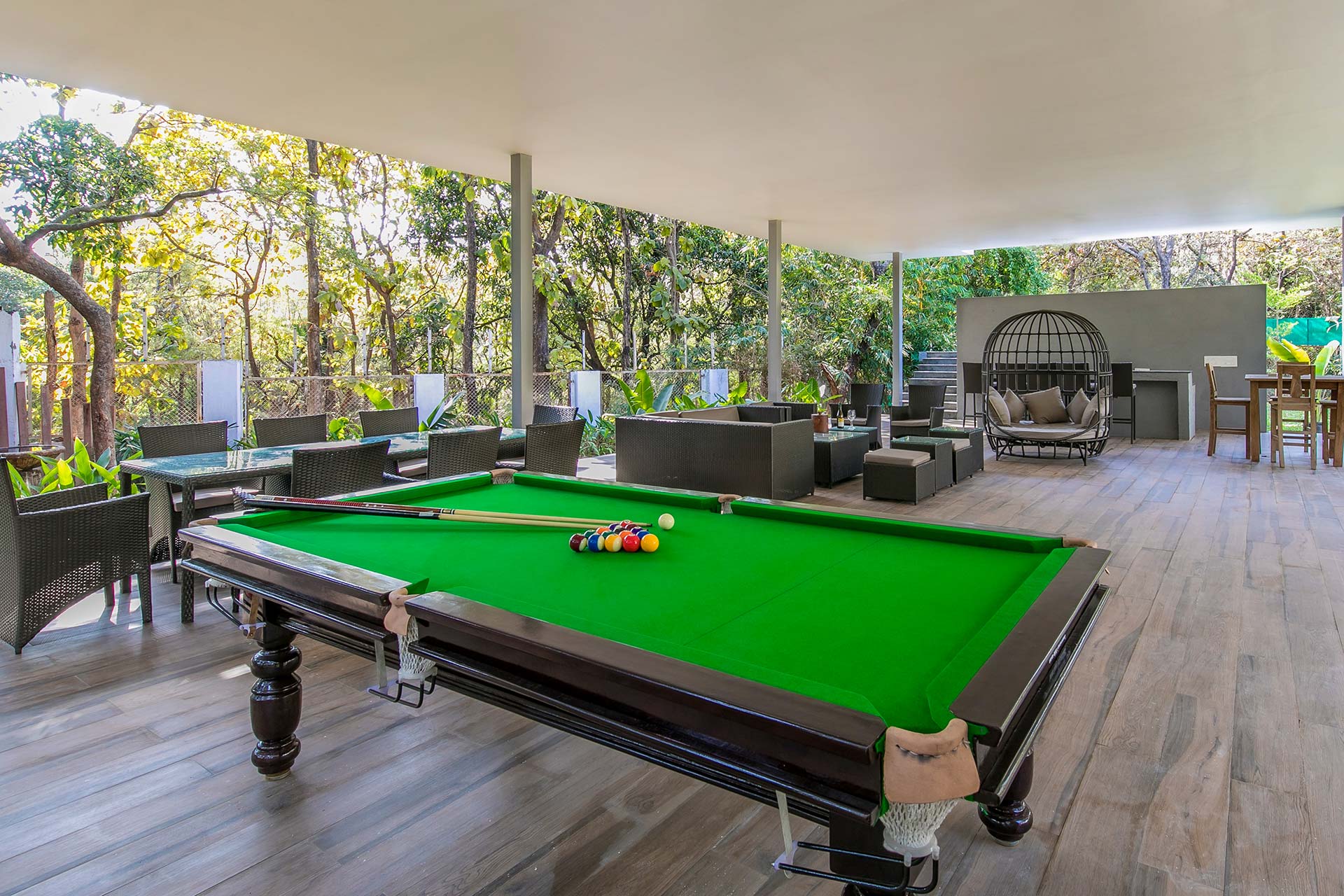 Within the property, guests can enjoy a relaxing dip in the pool. Play indoor games like cards, table tennis, pool and foosball. Take a leisurely stroll on the beautifully manicured lawn, unwind in the cabana and enjoy an alfresco feast. Head over to the terrace and soak in the misty breeze and savour the splendid landscapes. Relish a lavish barbecue spread.