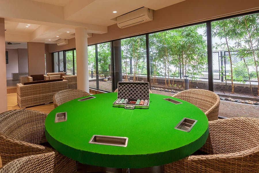 – The gaming zone includes a table tennis board and a poker table.