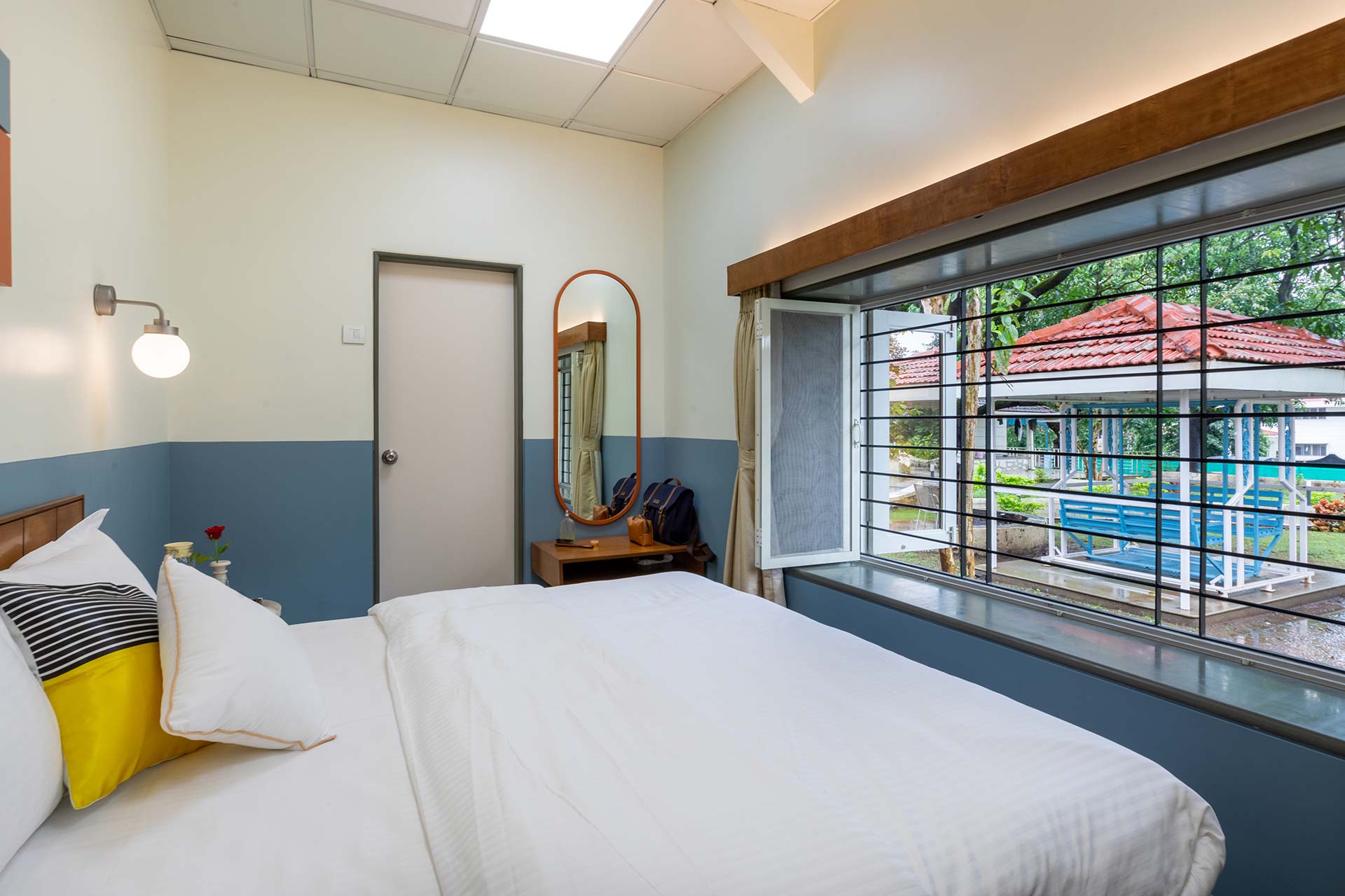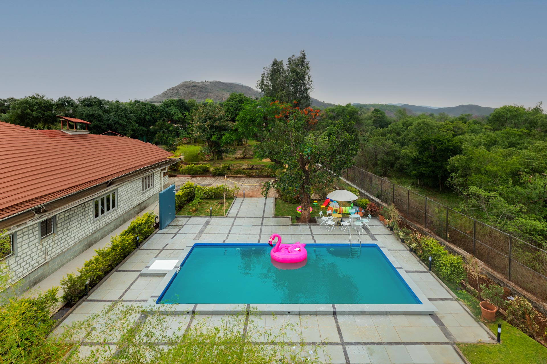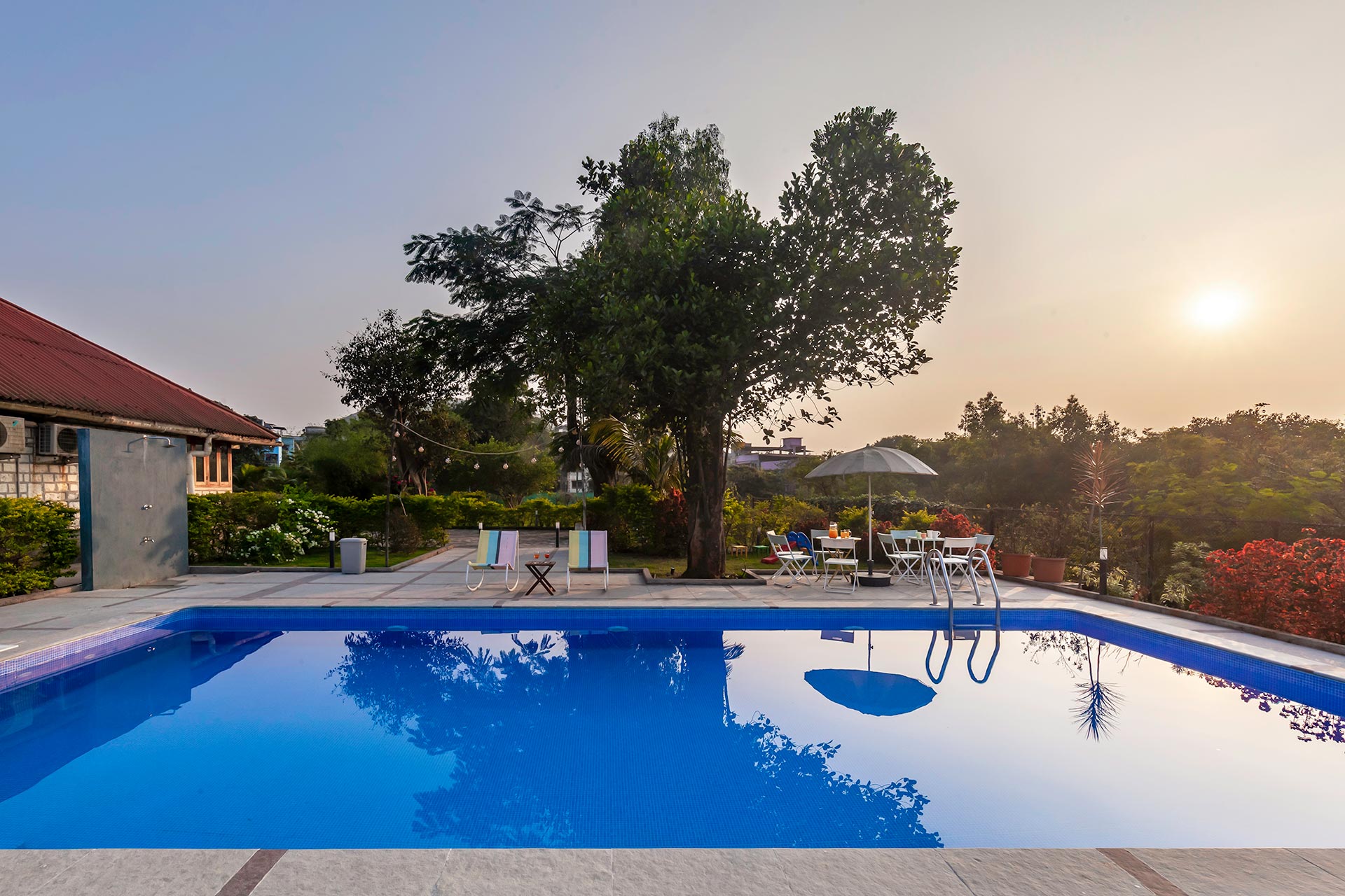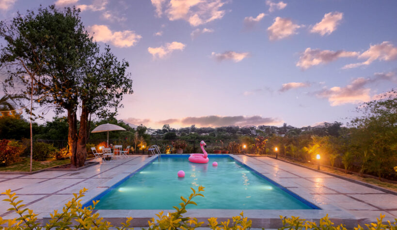 Within the property, guests can take a leisurely stroll on the sprawling lawns, relax in the gazebo or swing away to their heart’s content. Binge your favourite movies and TV shows. Play indoor games like card or ludo. Enjoy a refreshing dip in the private pool. Enjoy your favourite cocktails by the bar. Devour an alfresco feast in the gazebo. Relish a hearty barbecue meal. Enjoy the complimentary bonfire session Soak in the beautiful views around.