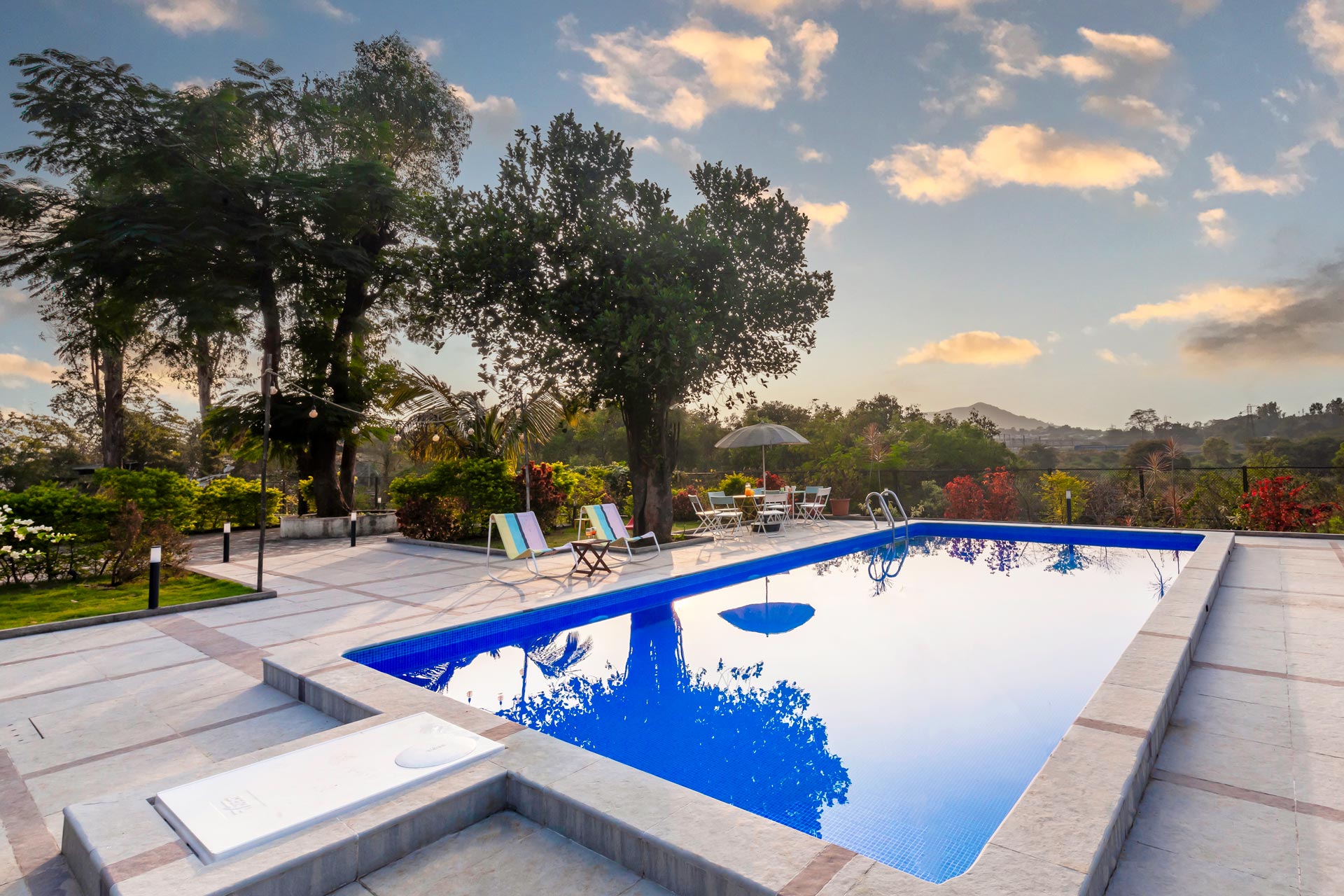 – Private swimming pool and pool deck embellished with furnishings