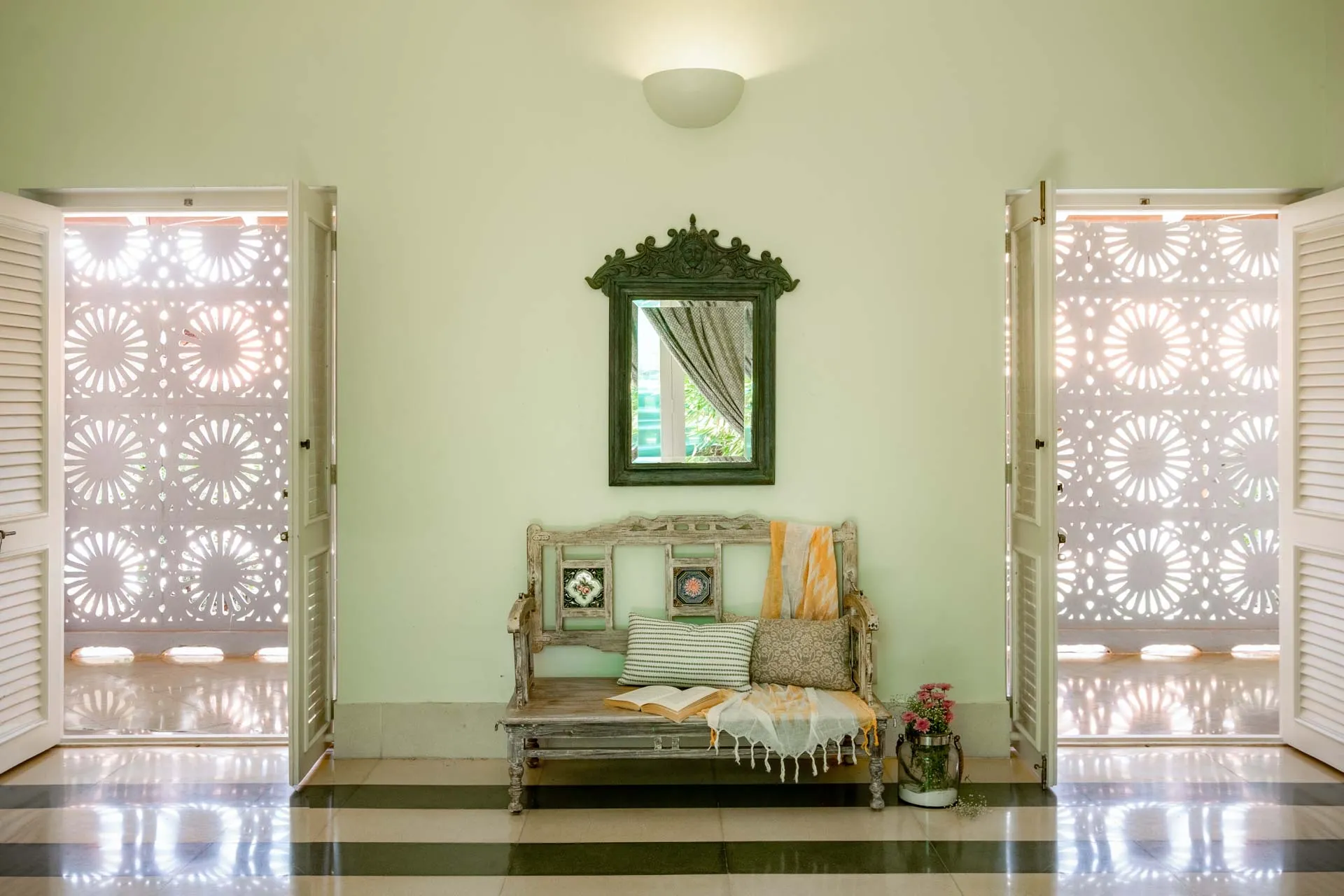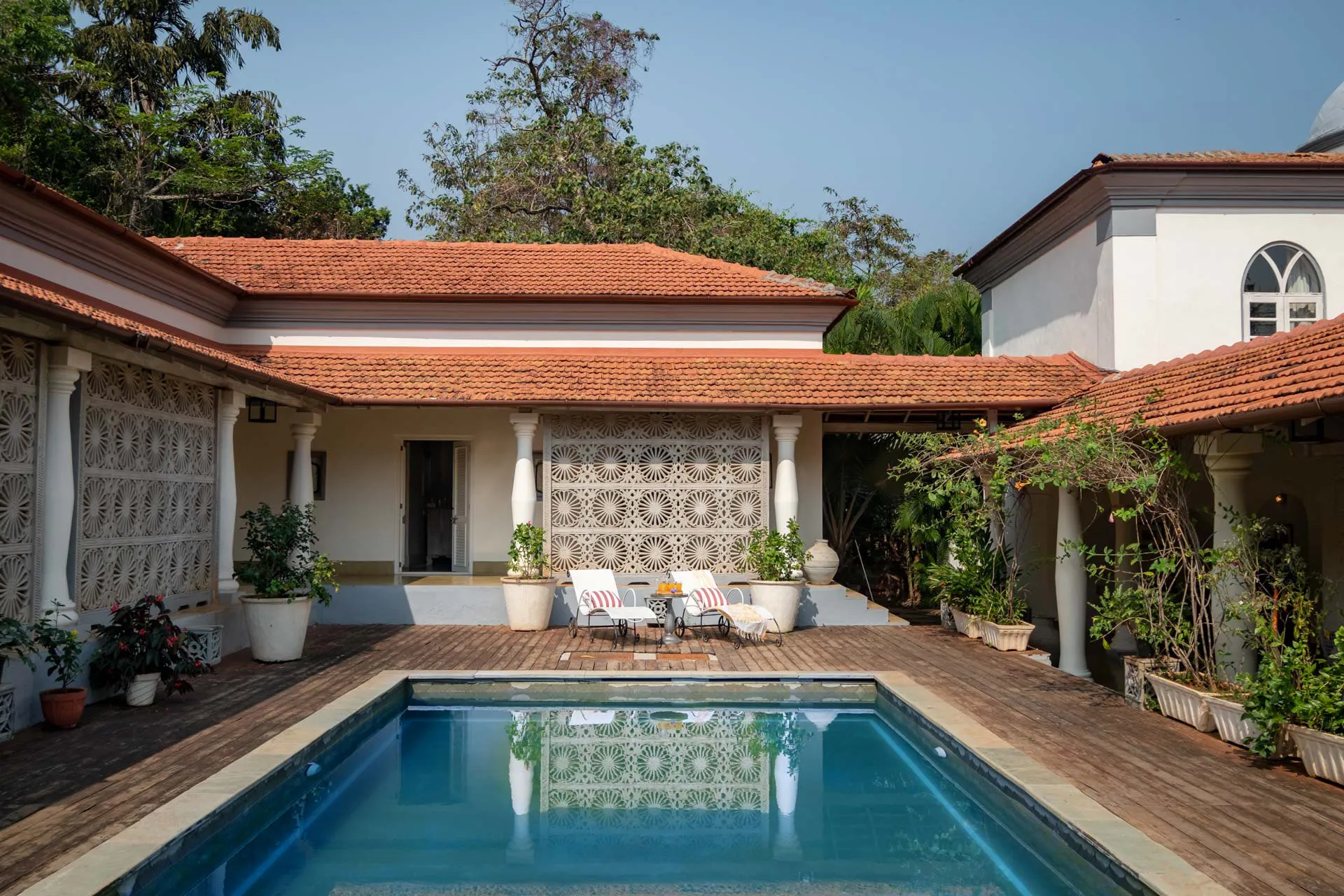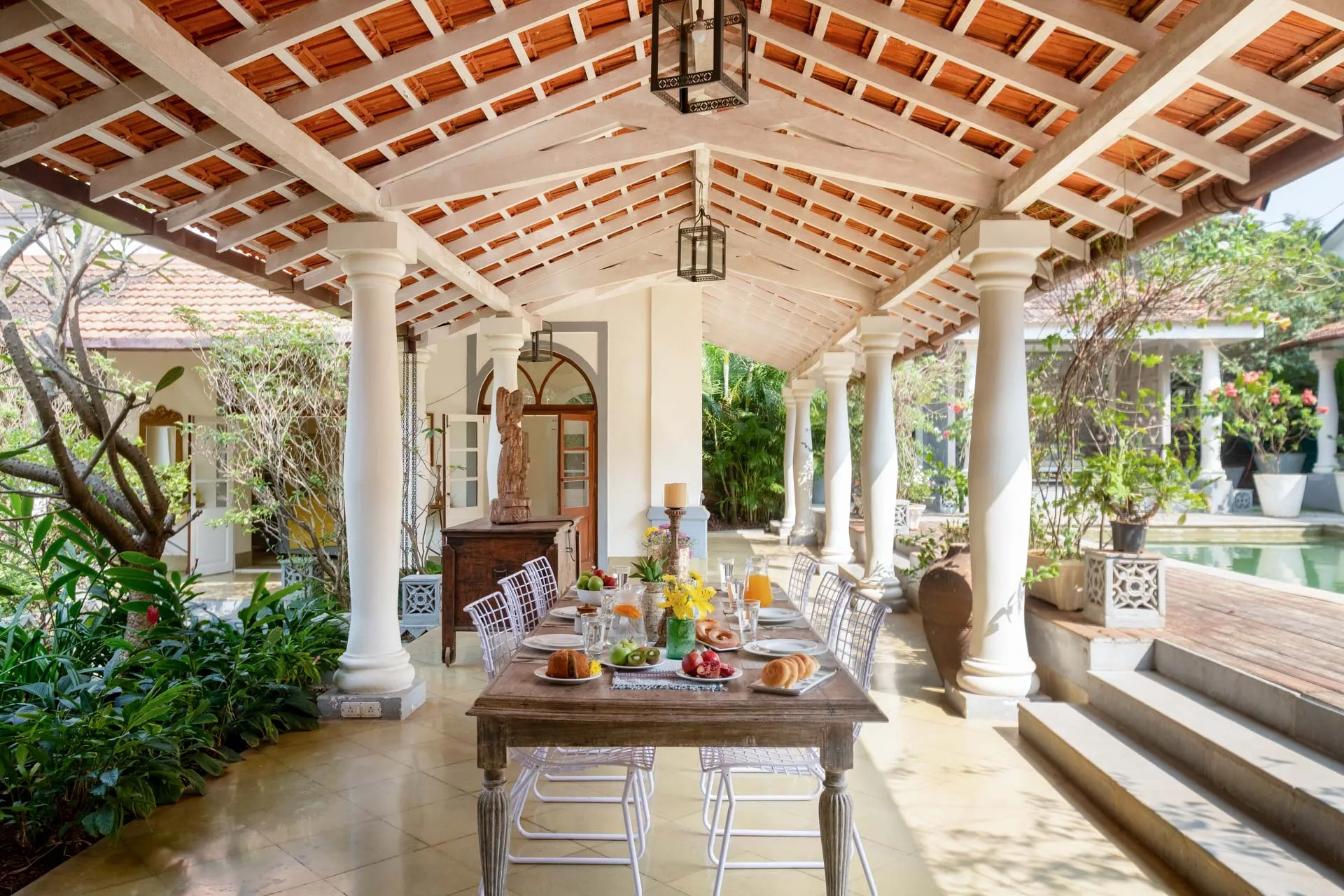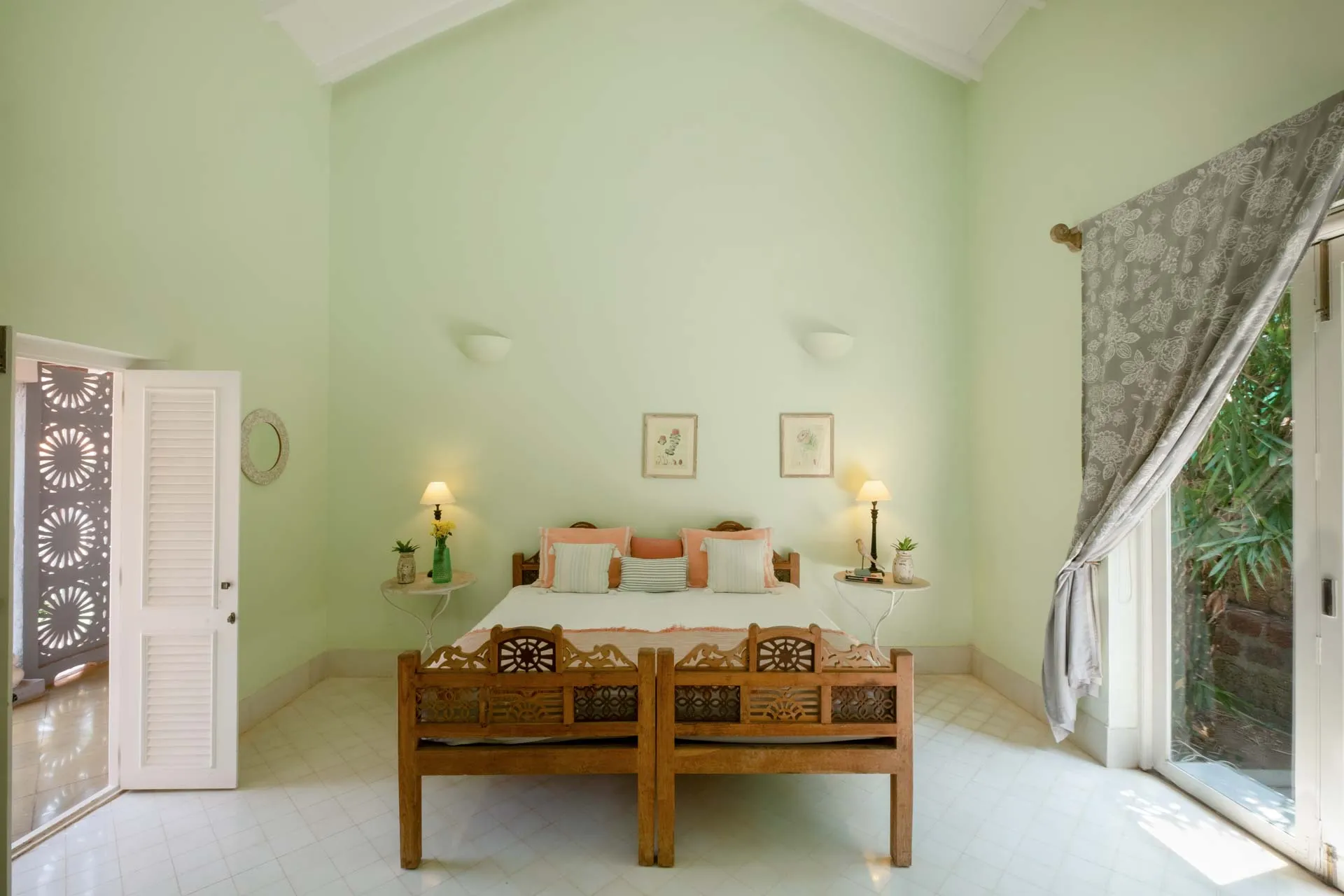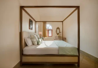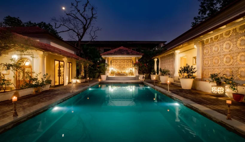 Villa Branco is a luxury villa for rent in Goa and located in between the villages of Anjuna and Assagaon. Its striking architectural and decor features are sure to fascinate design aficionados. The living room features refurbished wooden doors from India’s erstwhile royal darbars. Bedrooms have contemporary IPS walls and floors complemented by mirrored accents and antique bric-a-brac. The sea green pool has stone flooring with its characteristic texture and is surrounded by carved screens and louvered doors. This holiday home is especially apt for those wanting to celebrate a special occasion.
